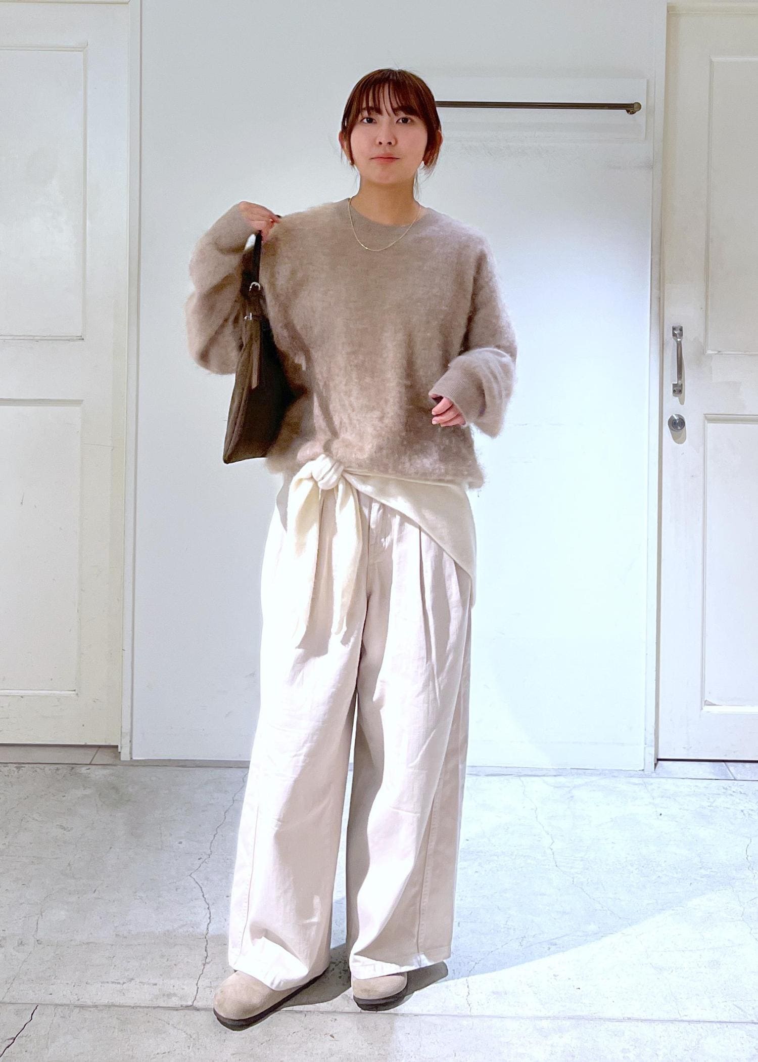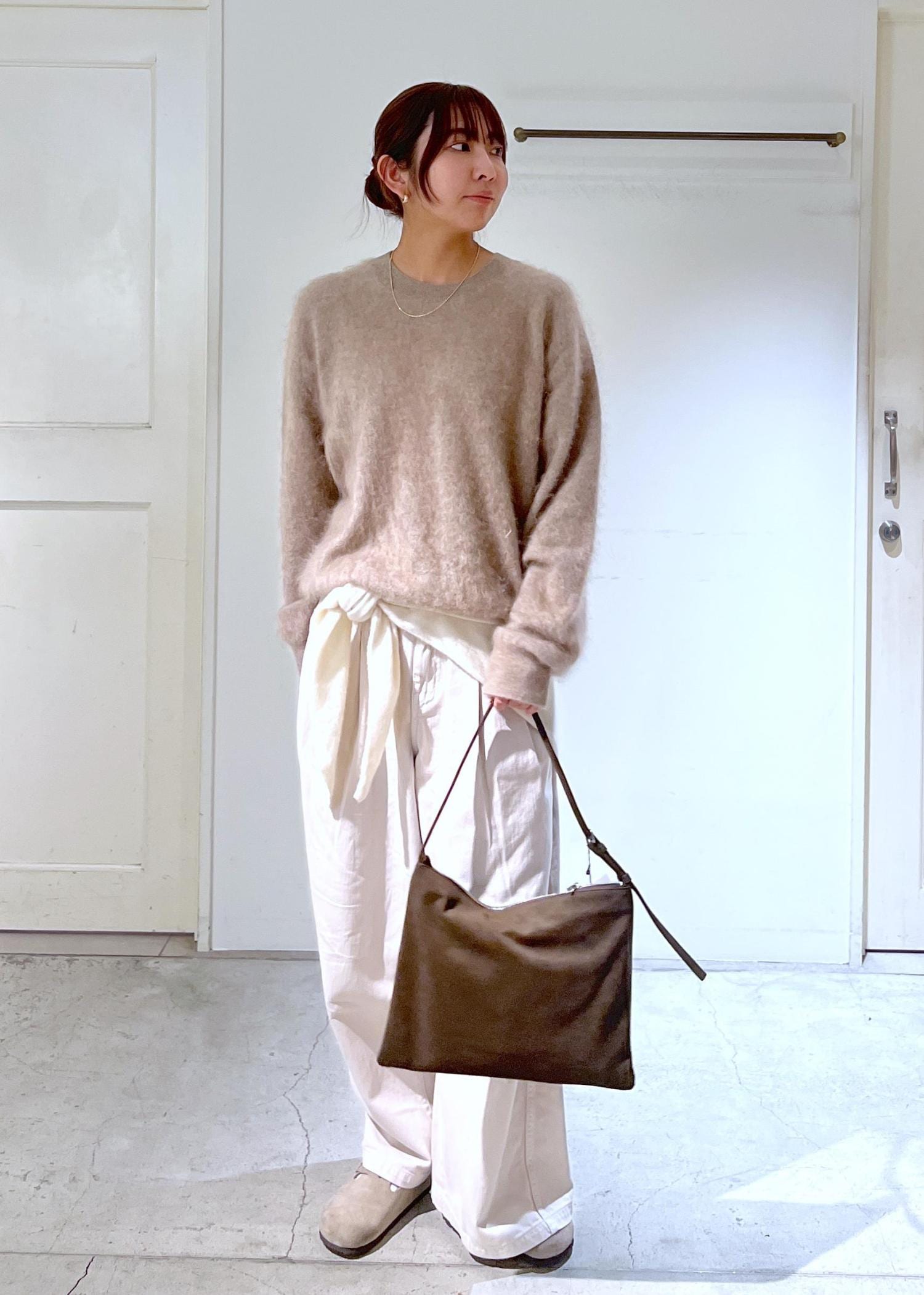 全体的にホワイト/ベージュでまとめて、私物のスカーフを腰に巻きました!