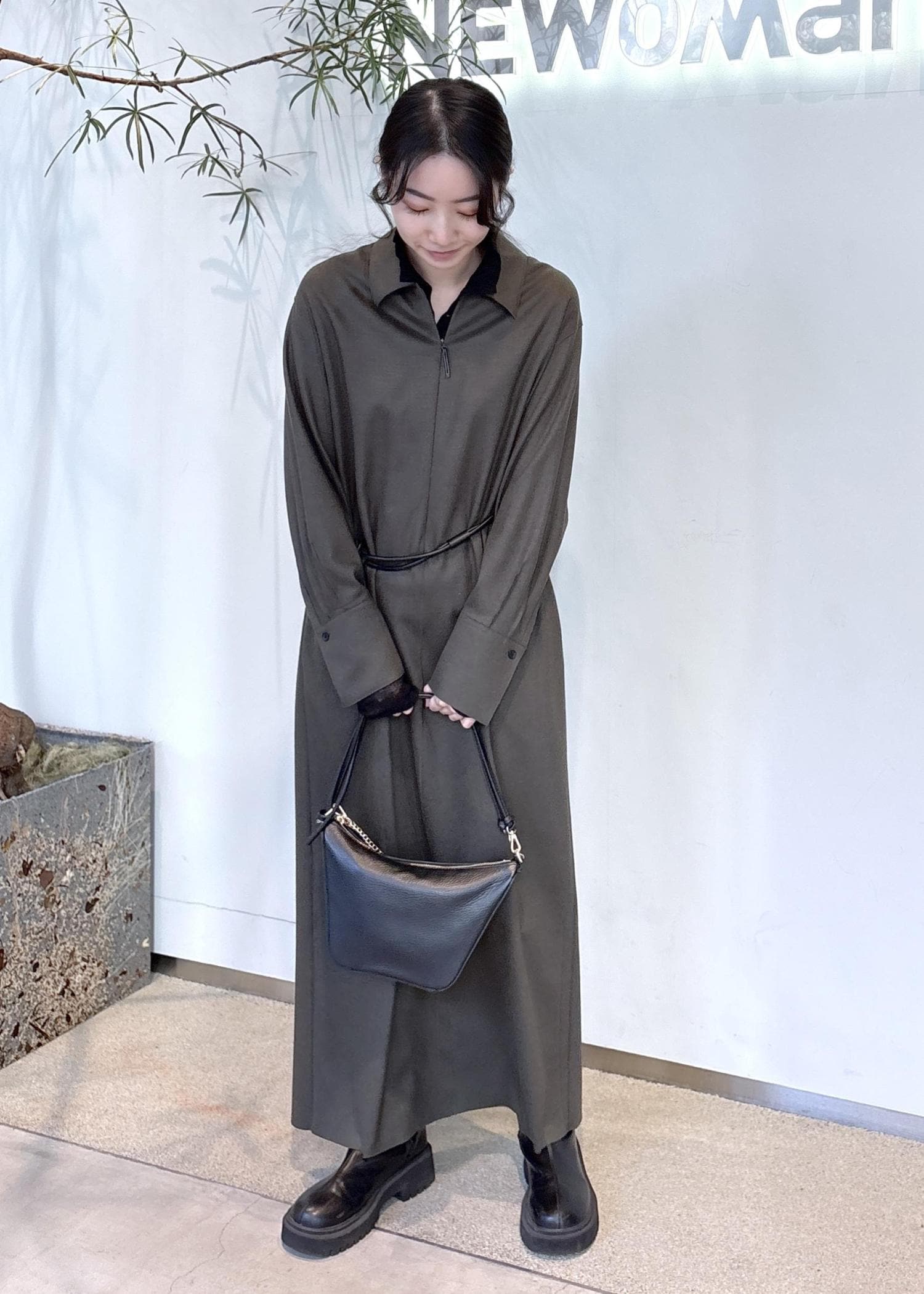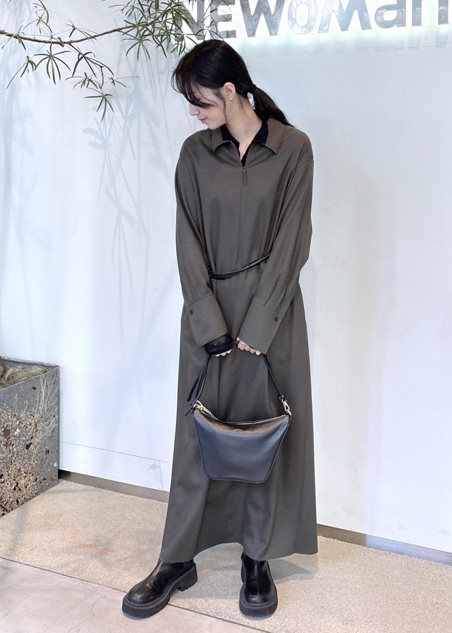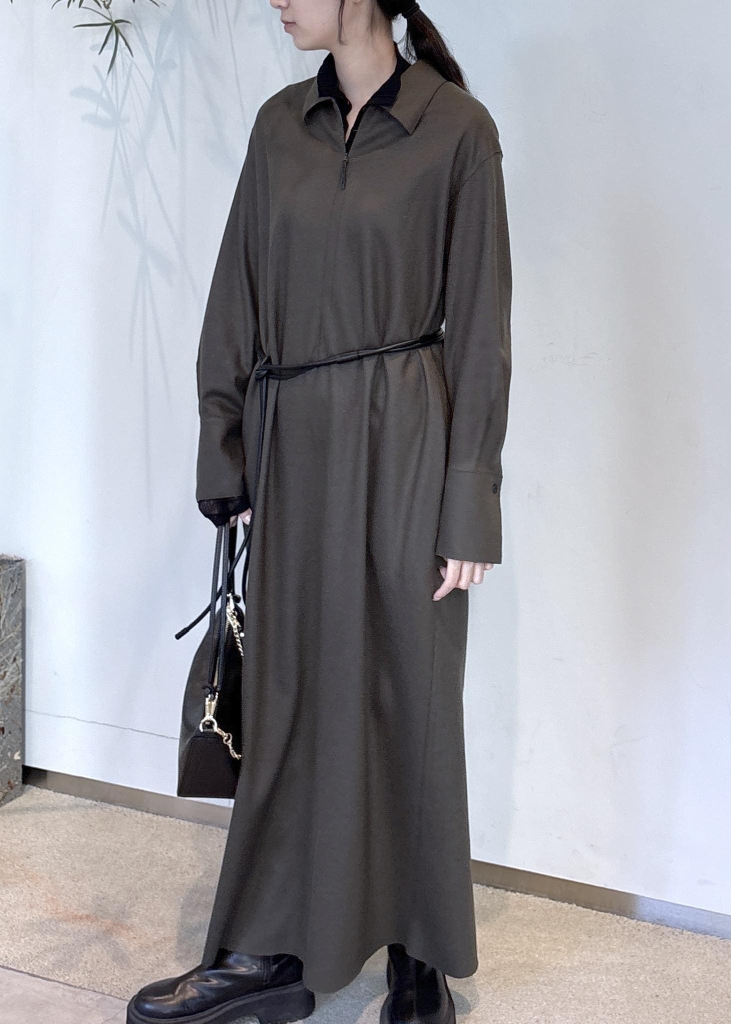 155cm着丈は足首にかかるマキシ丈で、縦のラインが強調されるため、1枚で大人っぽく落ち着いた印象に。