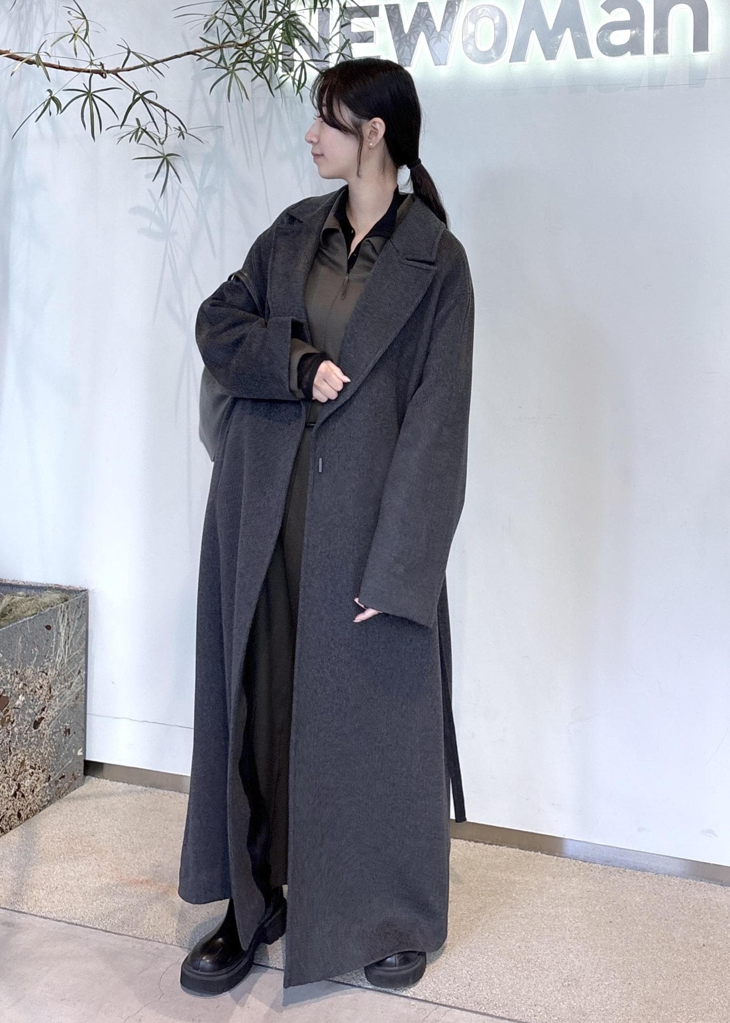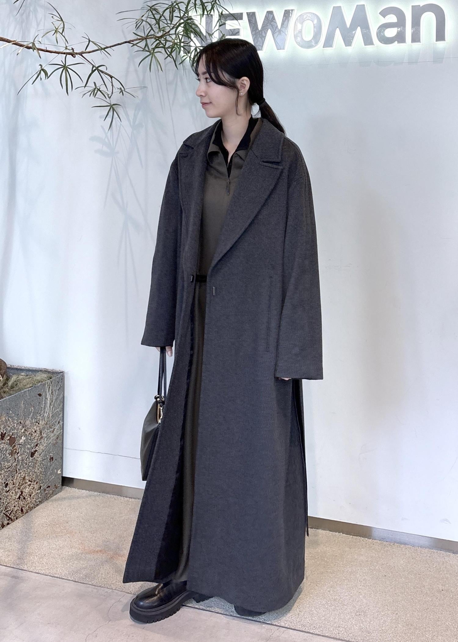 ストンと落ちるロングコートが、縦のラインをきれいに見せてくれるスタイリングです。