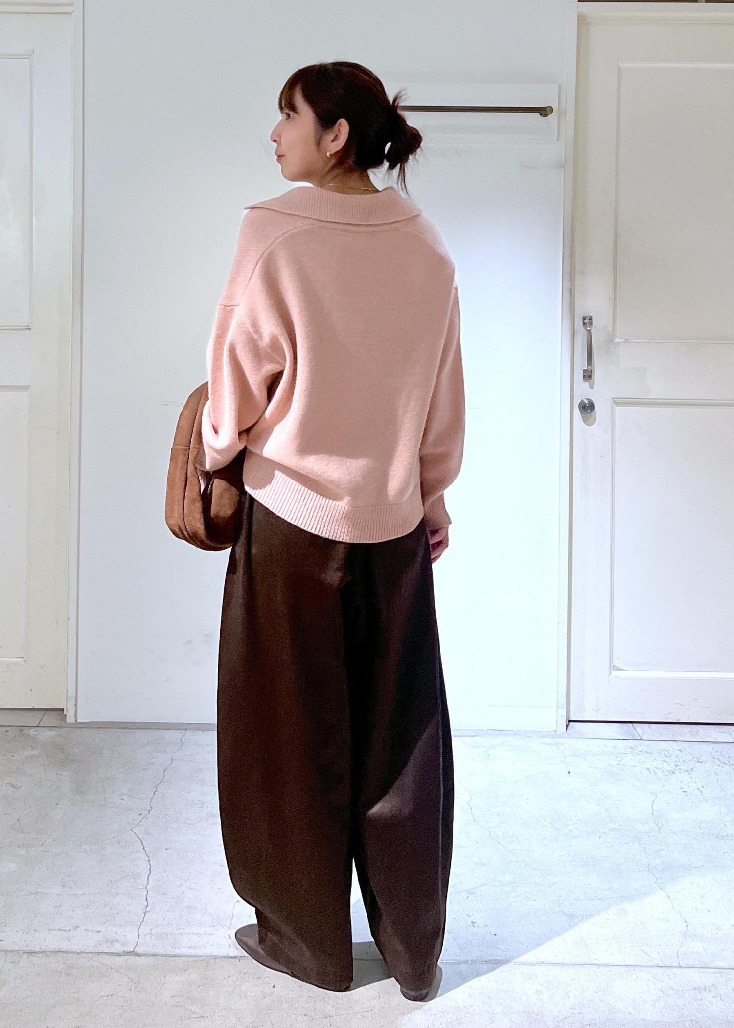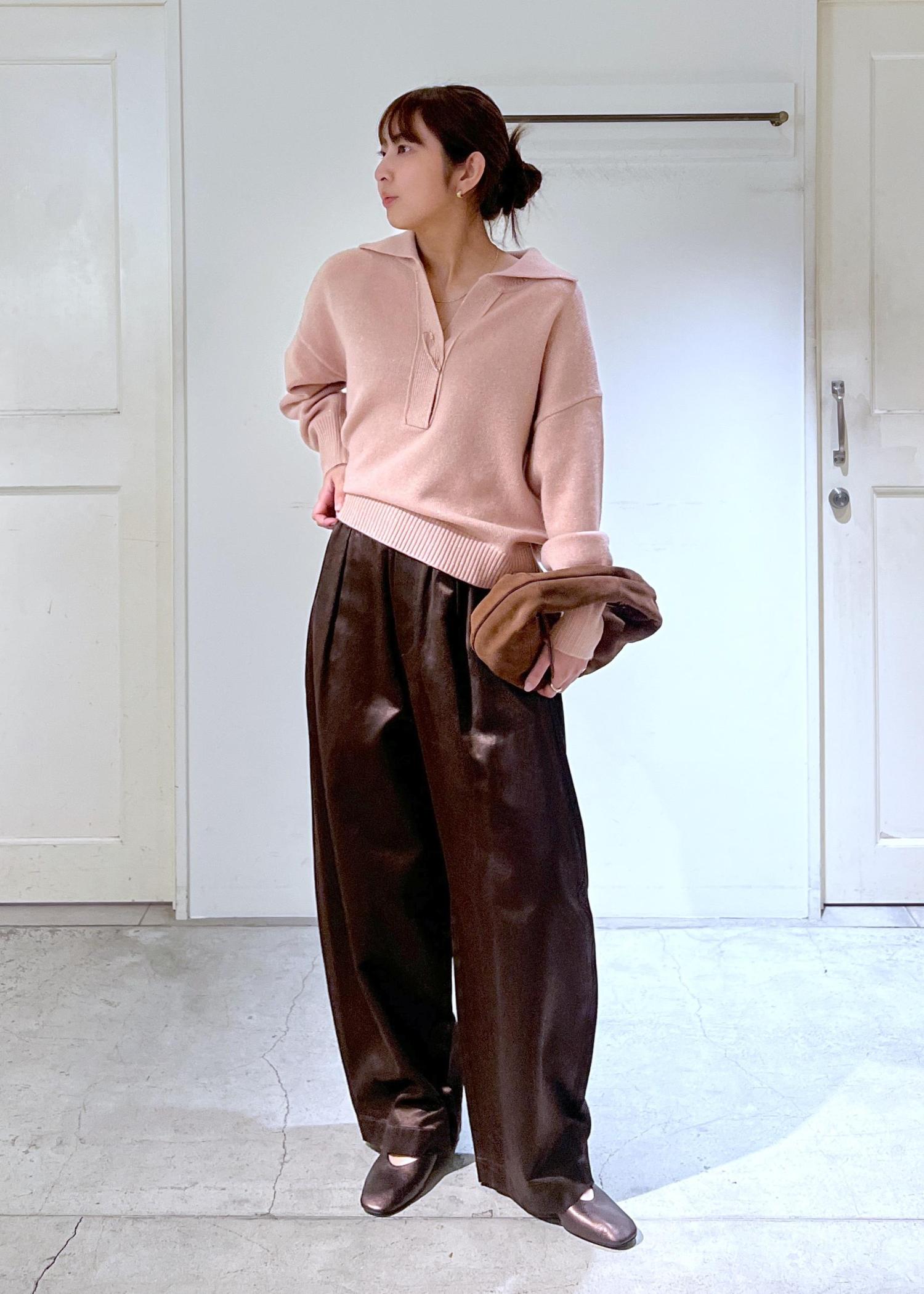 ニットのふっくら感と、パンツ/シューズの光沢感の素材感をミックスしたスタイリングが楽しめる冬。