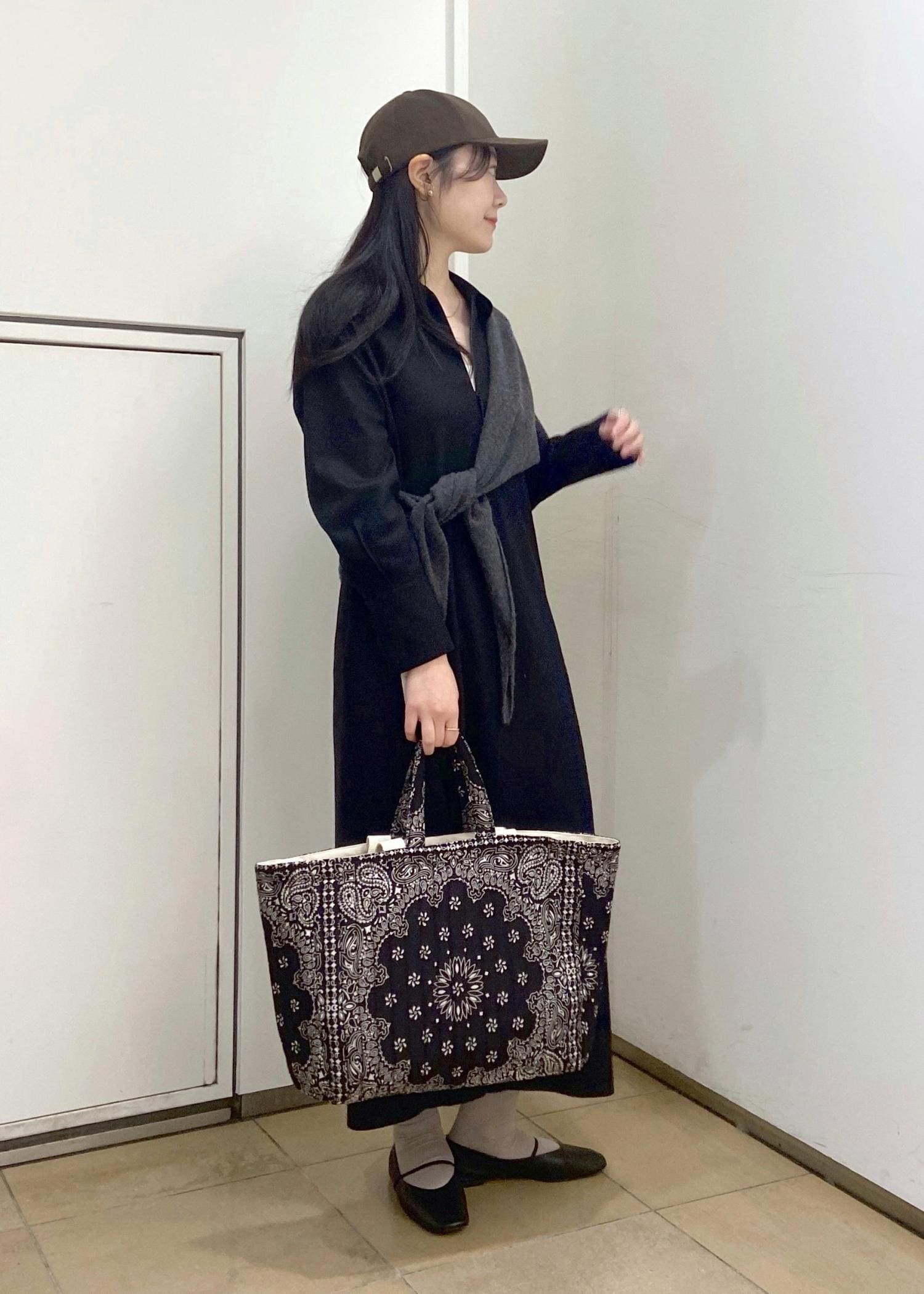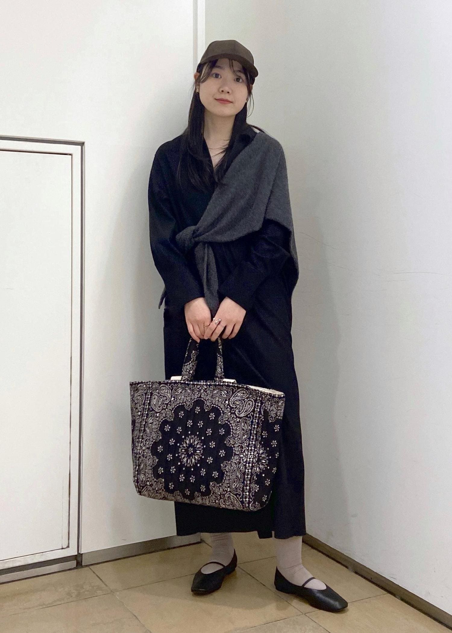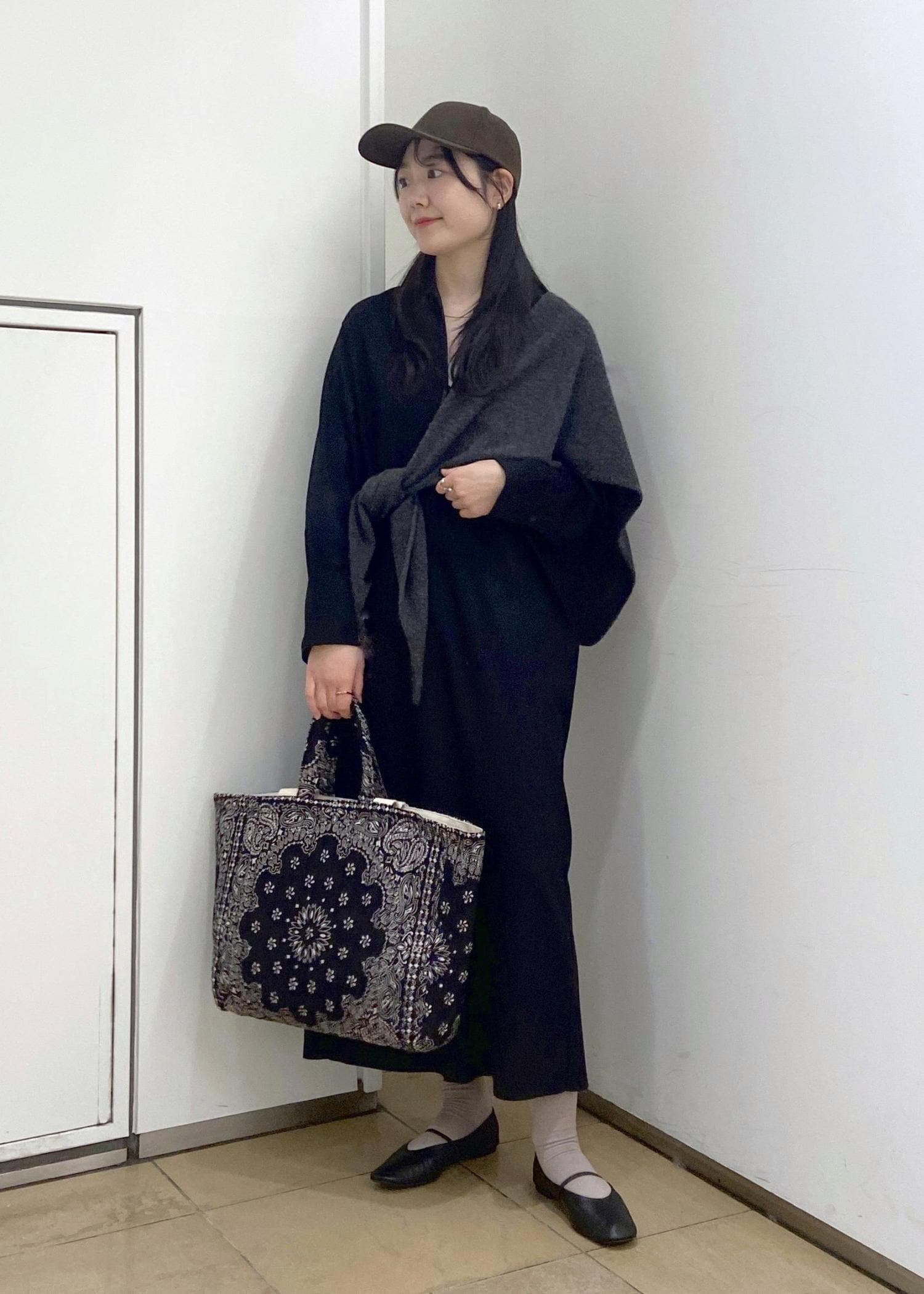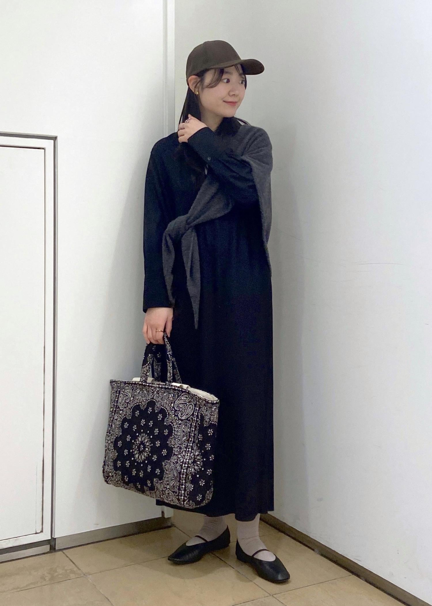 シンプルなワンピースなので、小物をプラスして少しカジュアルなスタイリングにしました。