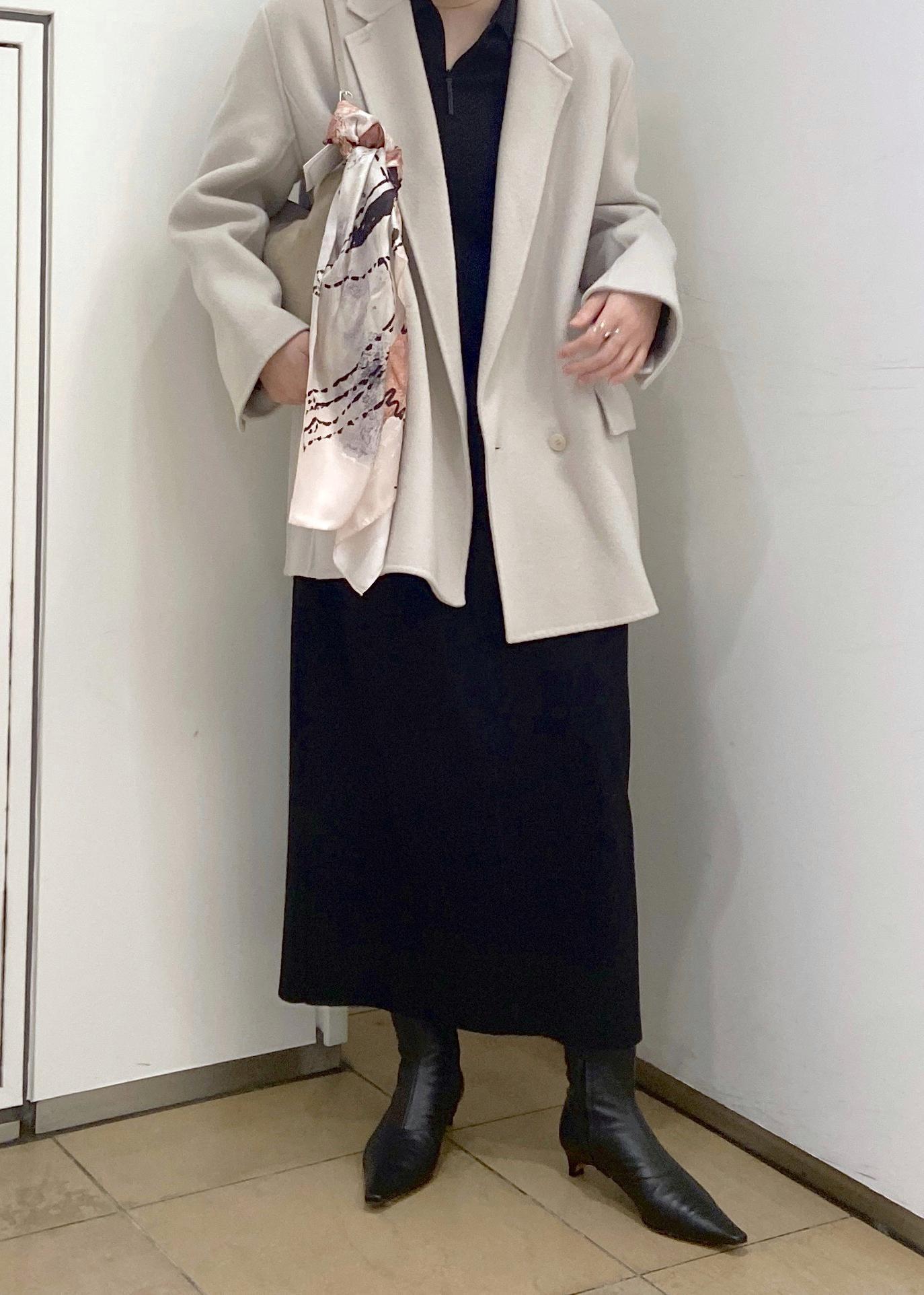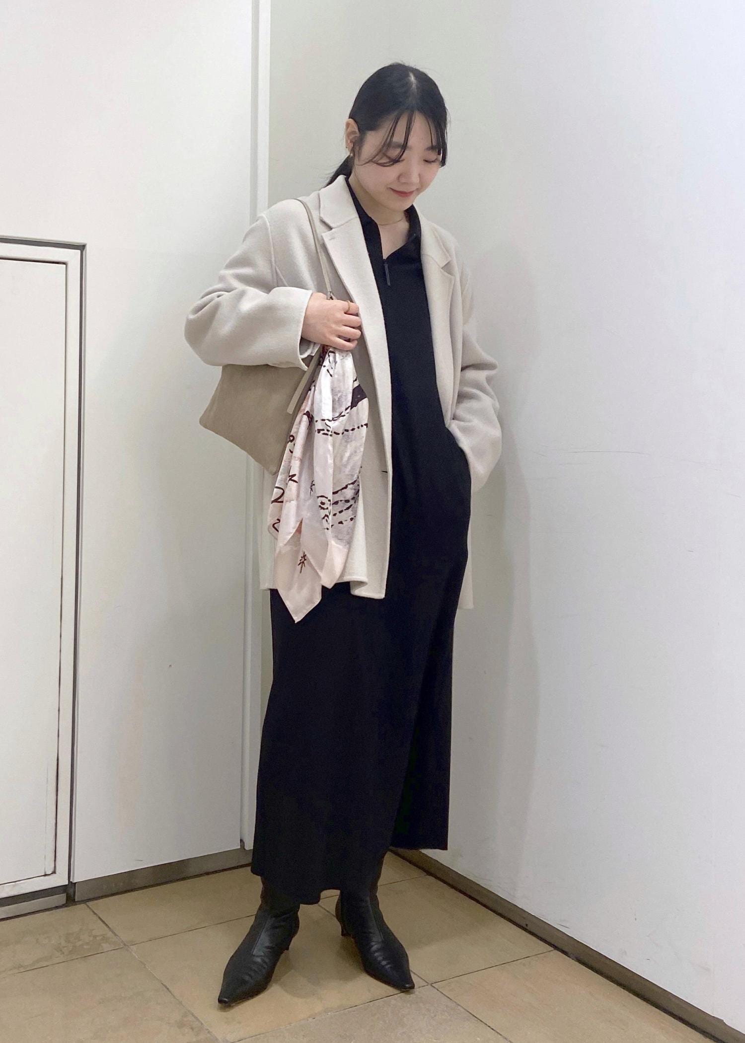 全体はブラックとホワイトのツートンスタイル。ホリデー気分を高めてくれるスカーフをカバンに巻いて、大人なお出かけコーデにしました。