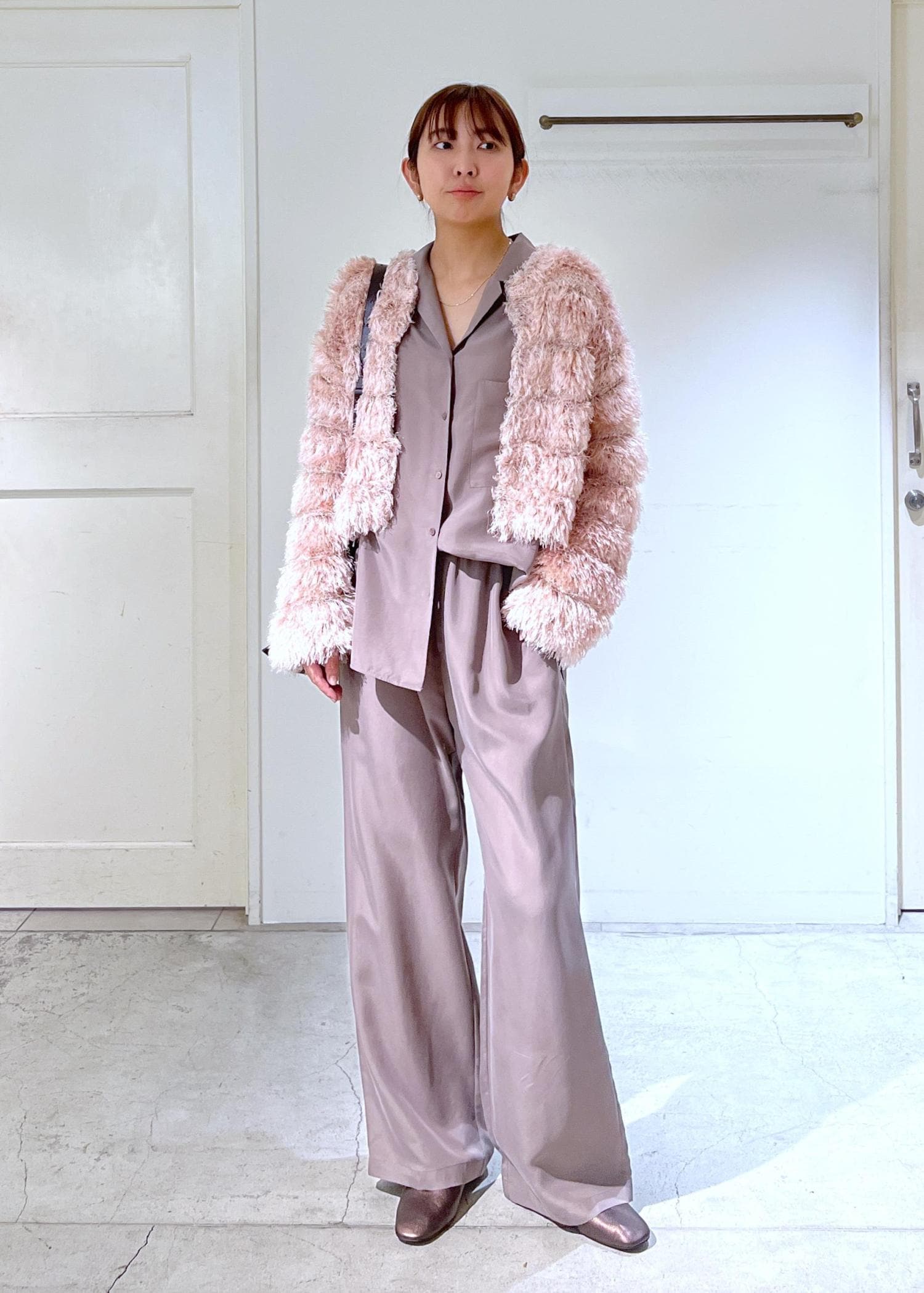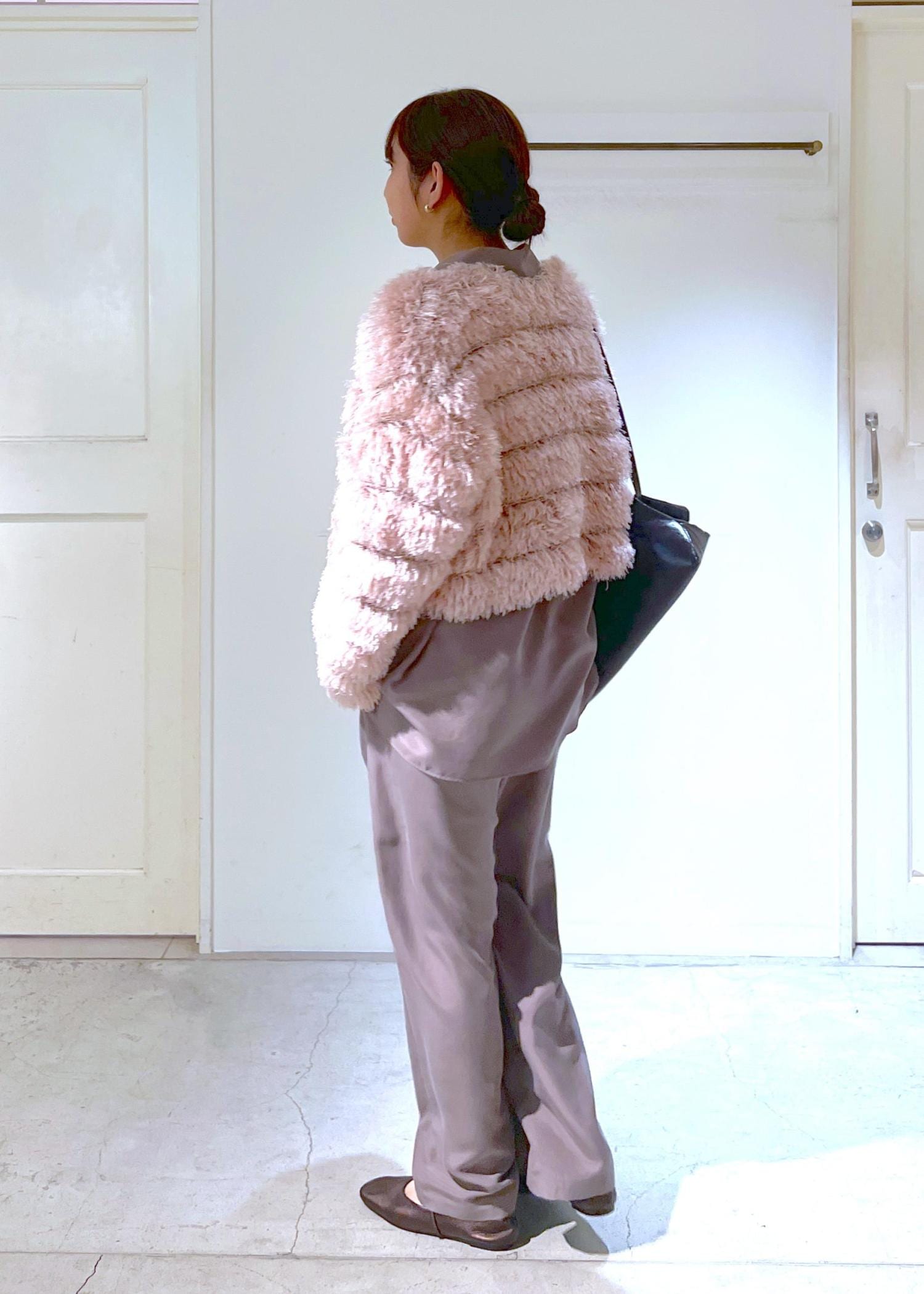 ホリデーシーズンを意識して華やかにファーボレロを羽織ってみました。華やかさを残しつつ、パンツスタイルで甘すぎないコーディネートを目指しました。