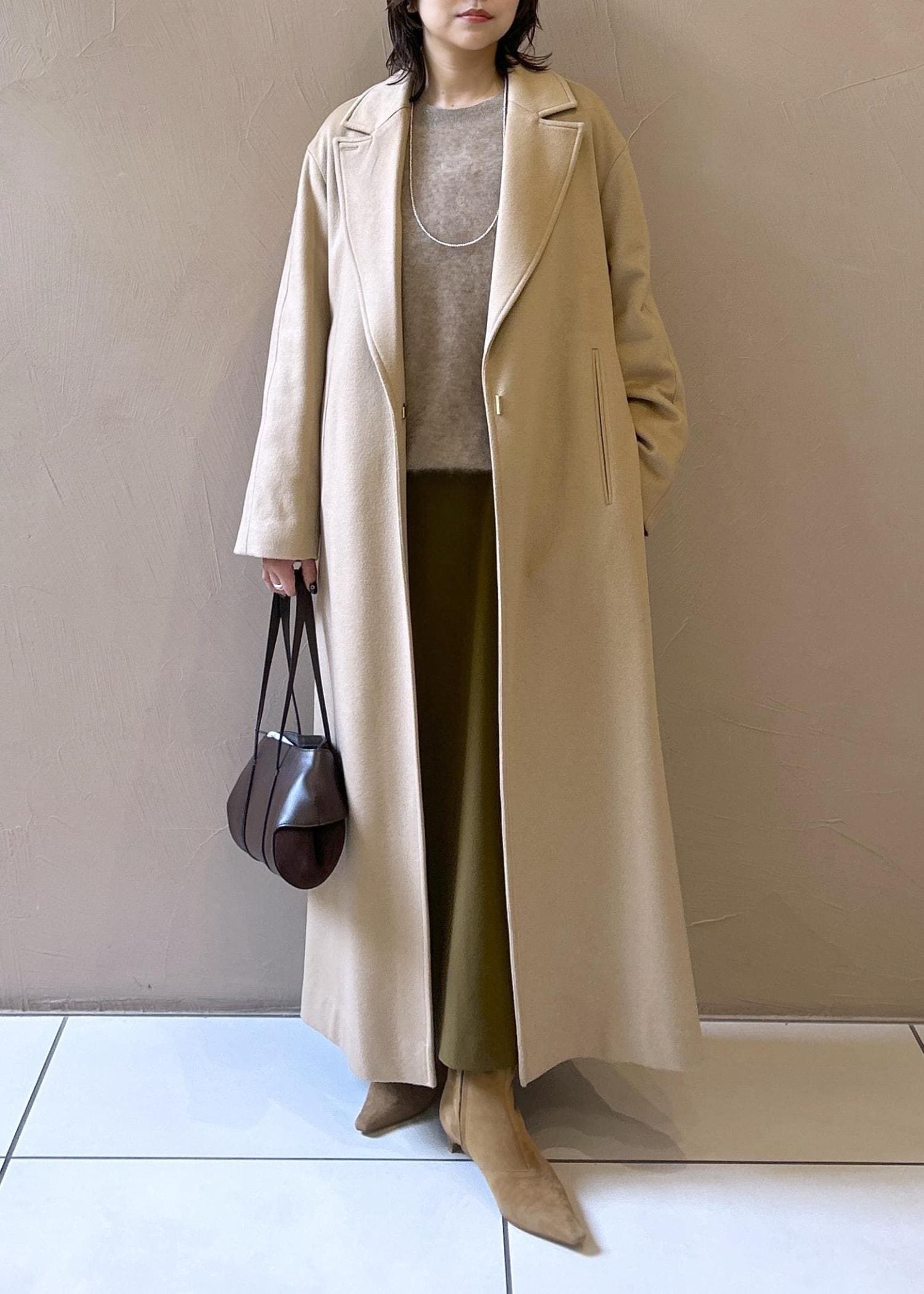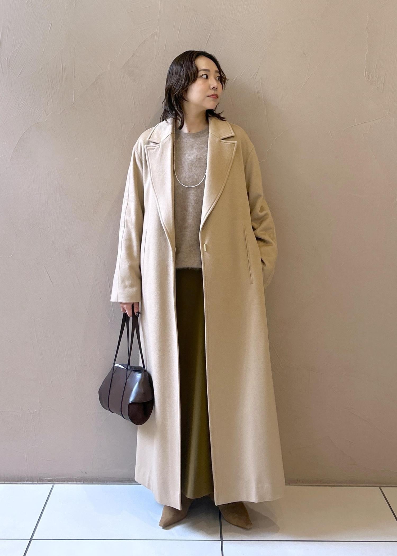 SALON adam et ropéピュアカシミヤナロートレンチコートキャメル / F¥198,000レビュー着丈は長めですが158cmでも裾を引きずらずに着用できました。身幅は広すぎないつくりなので身体のラインを綺麗に見せてくれます。