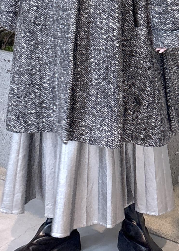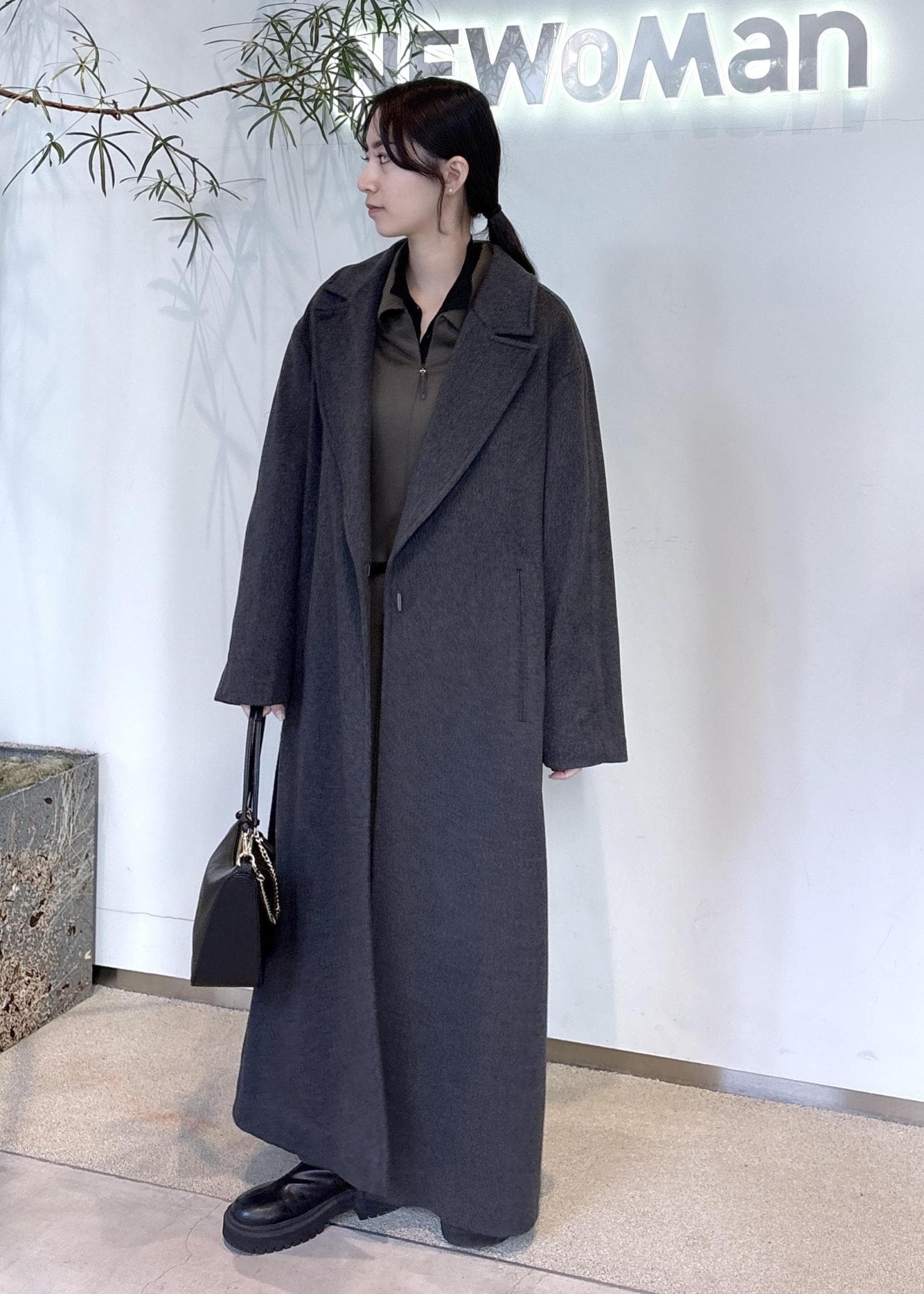 ゆったりとした身幅とロング丈で、中に厚手ニットを着てもすっきり見えるのがポイント。