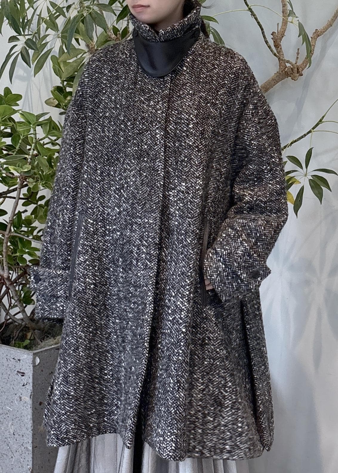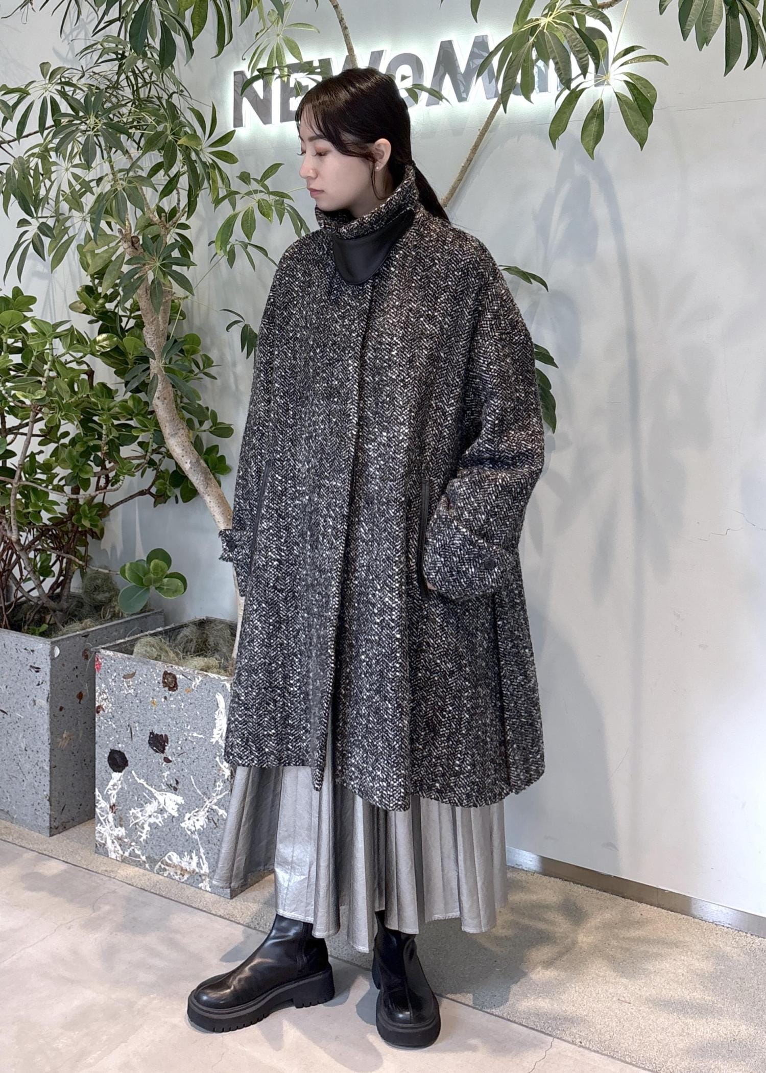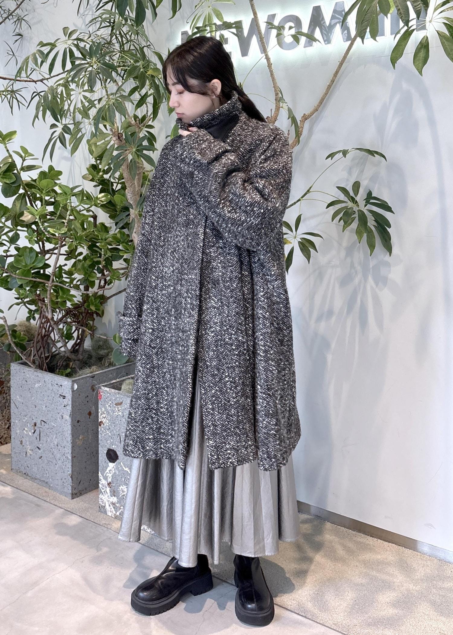 存在感のあるツイード素材のロングコートを主役に、落ち着いたトーンでまとめた大人スタイル。