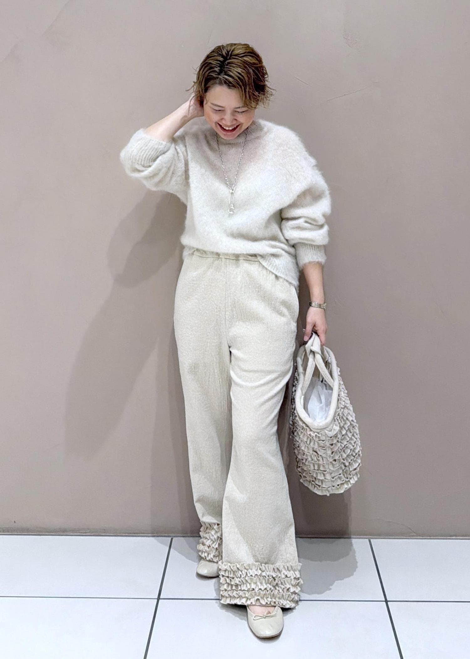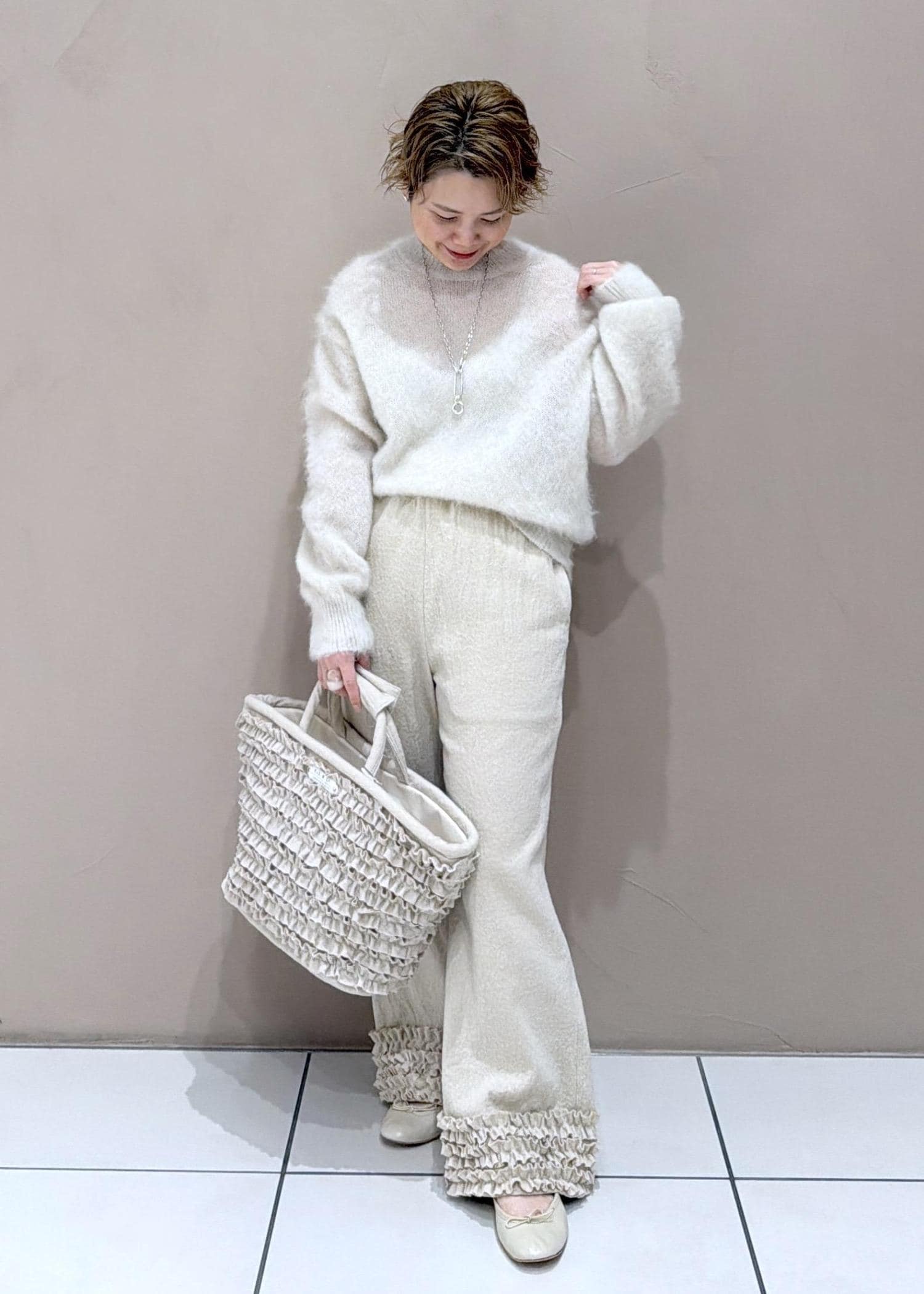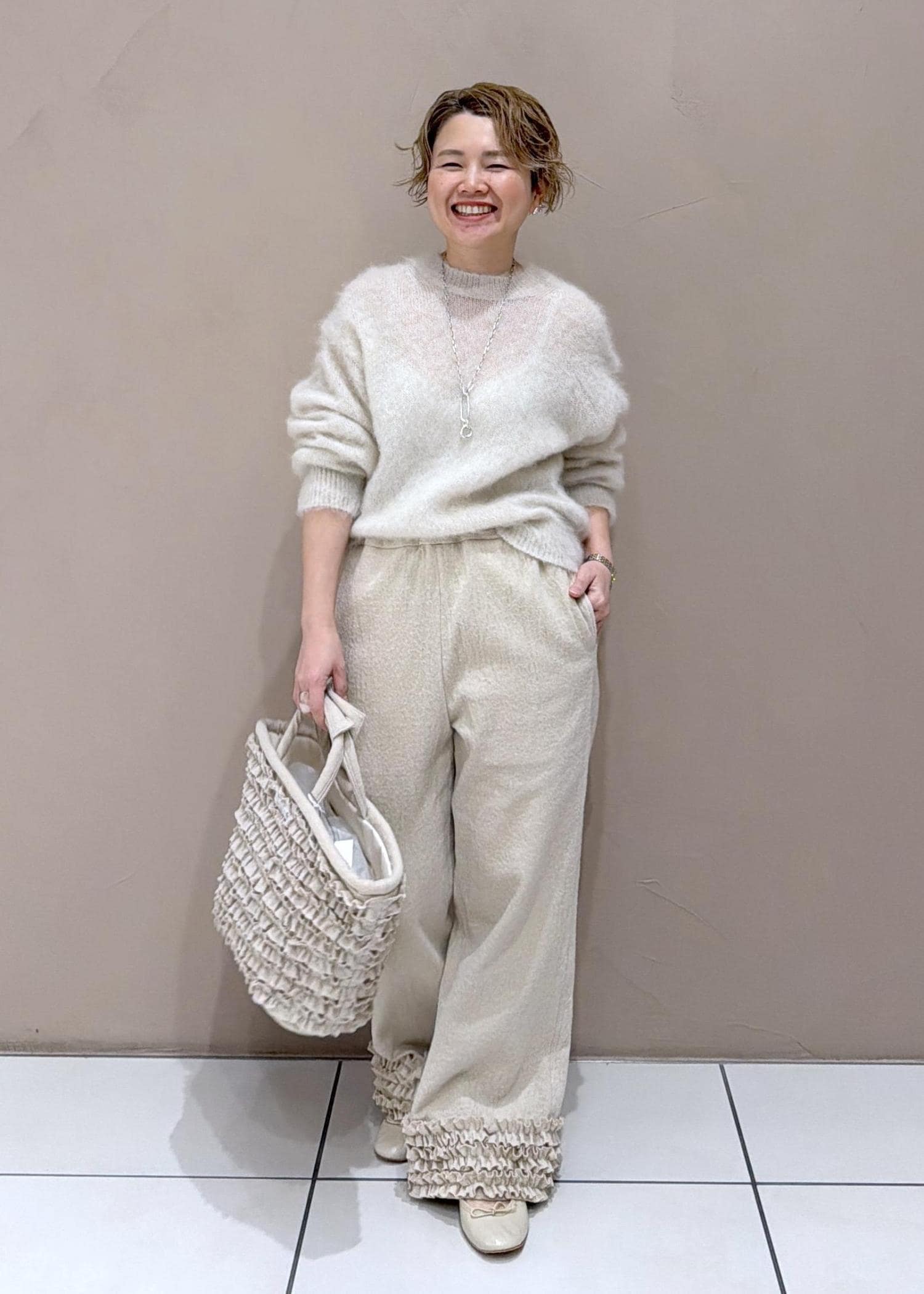 ナチュラルなホワイトで合わせた冬のワントーンコーディネートです。