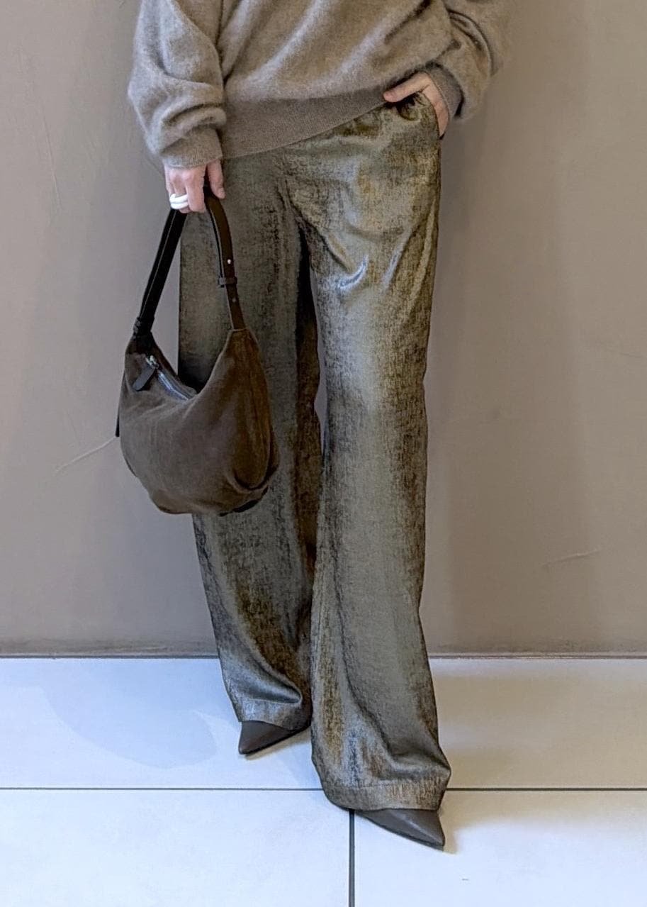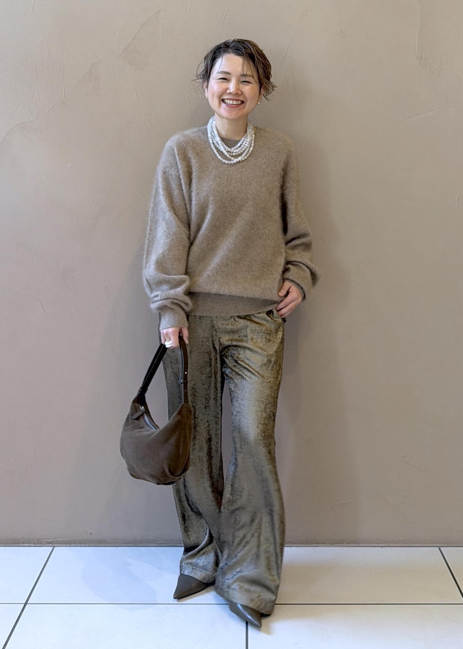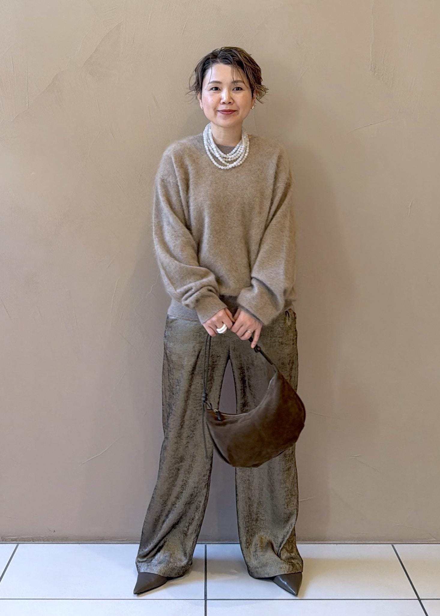 異素材のパンツと合わせて、ワントーンでもお互いの素材感を引き立てるコーディネートにしてみました♡