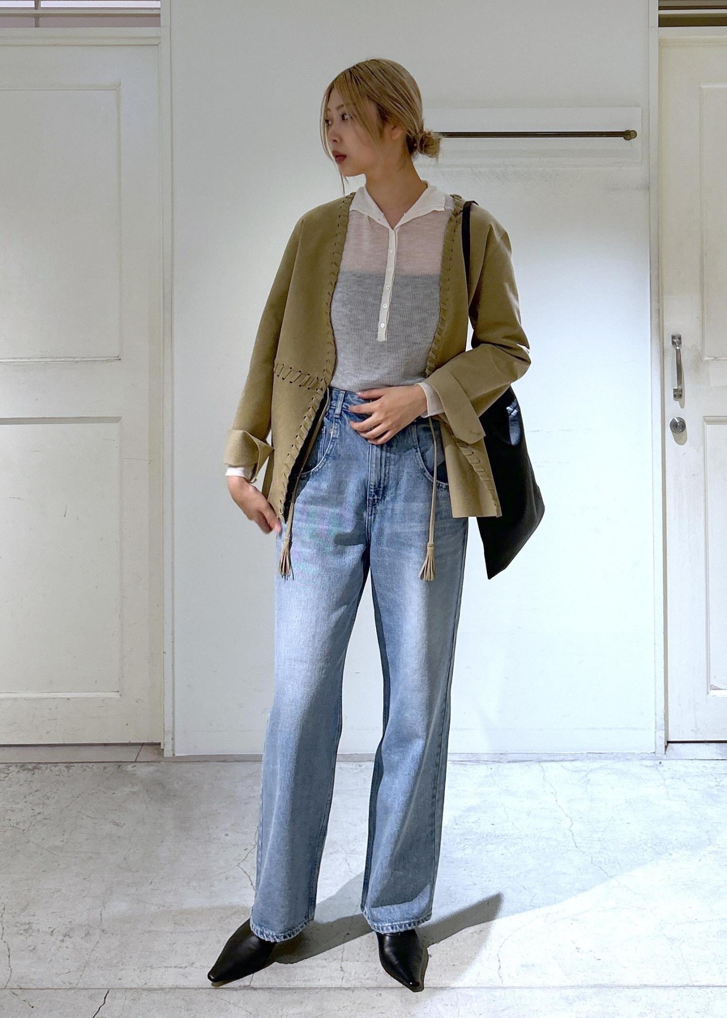 別注デニムはラインが綺麗で、シンプルに合わせても映える一枚です。