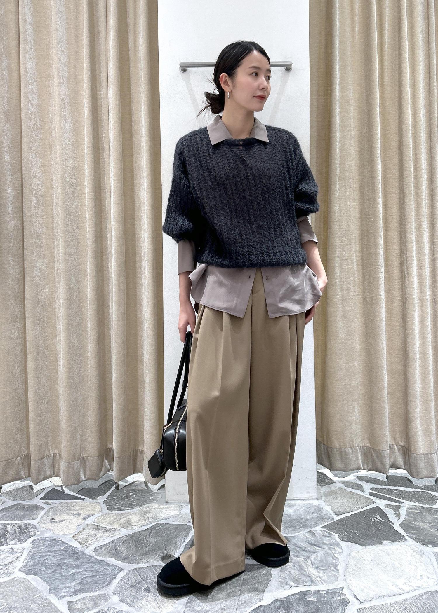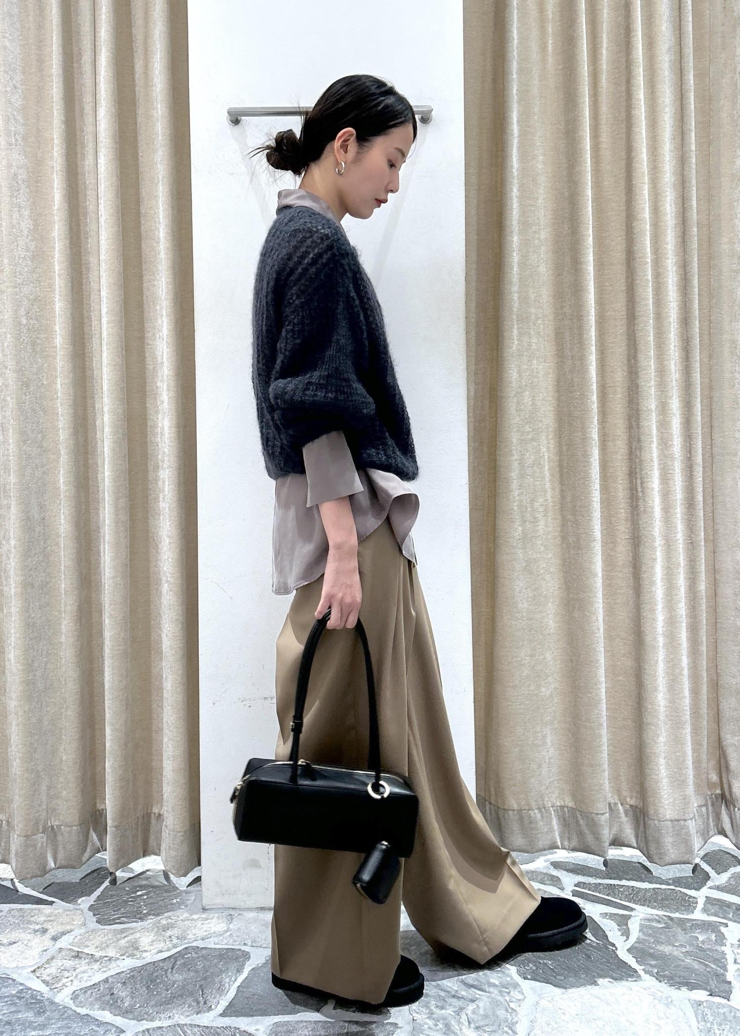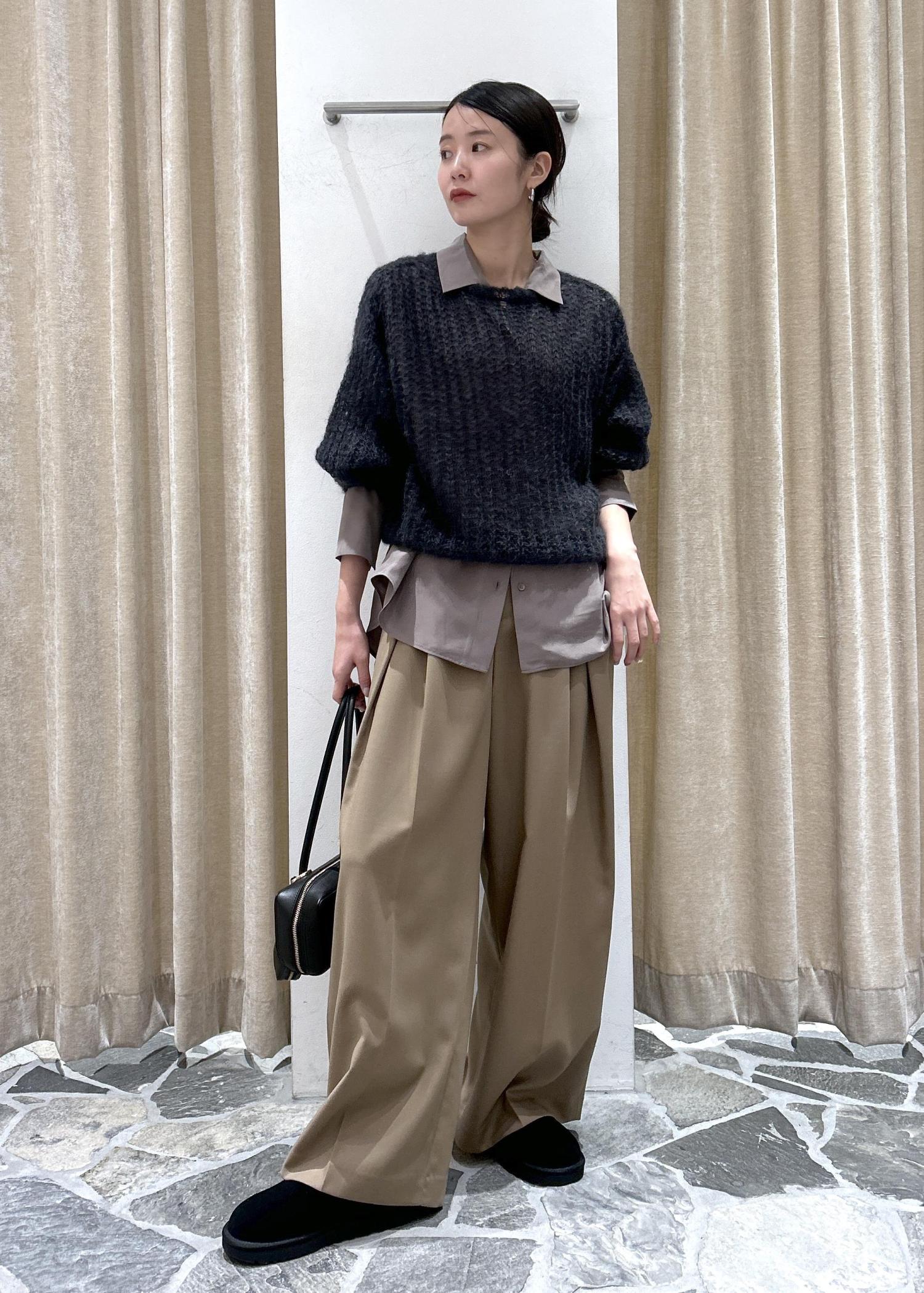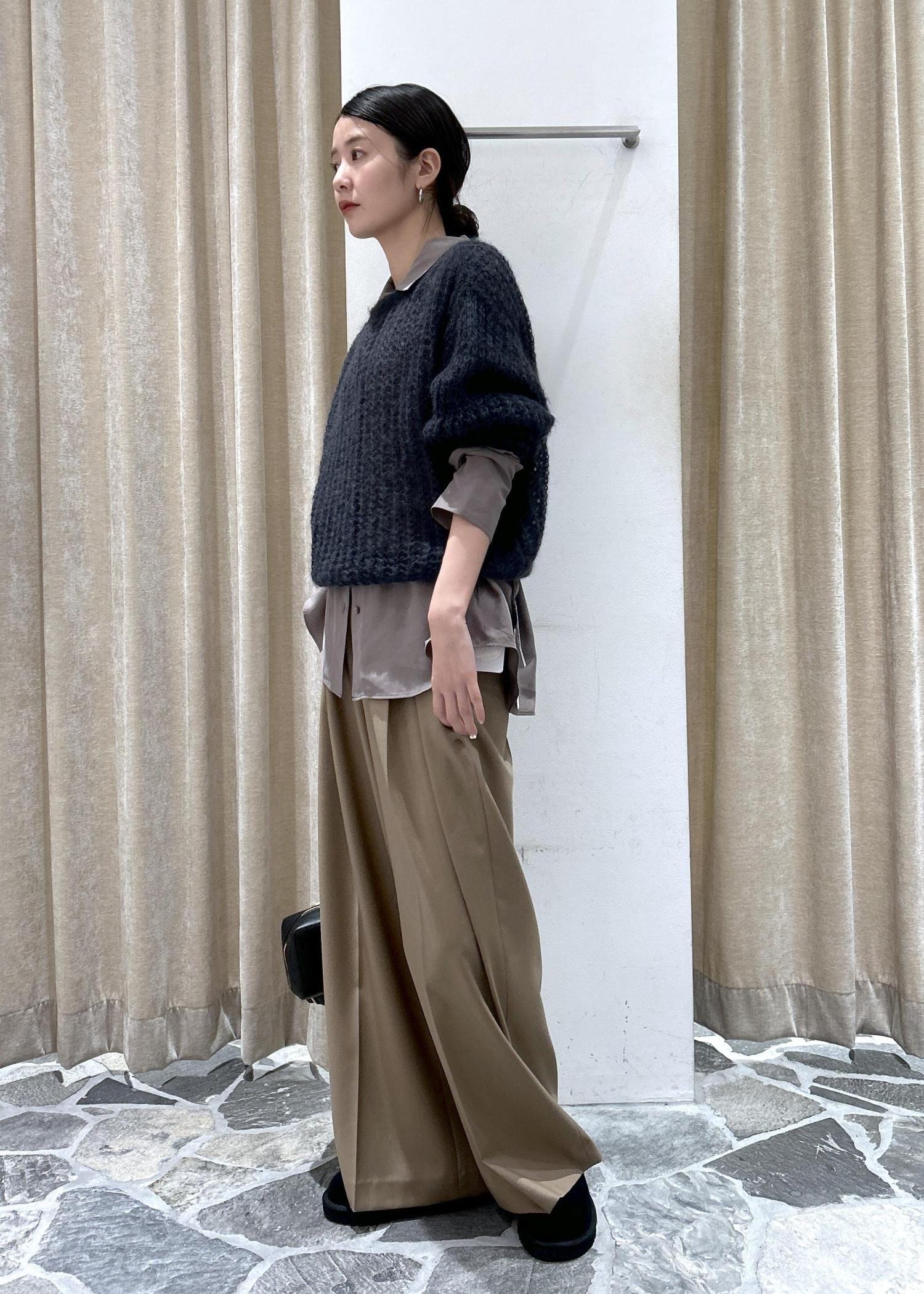 モヘヤ100%でチクチク感のない柔らかいお素材です。毛足が長めでふわっとした印象になるのでデニムと合わせてもカジュアルになりすぎないニットです -