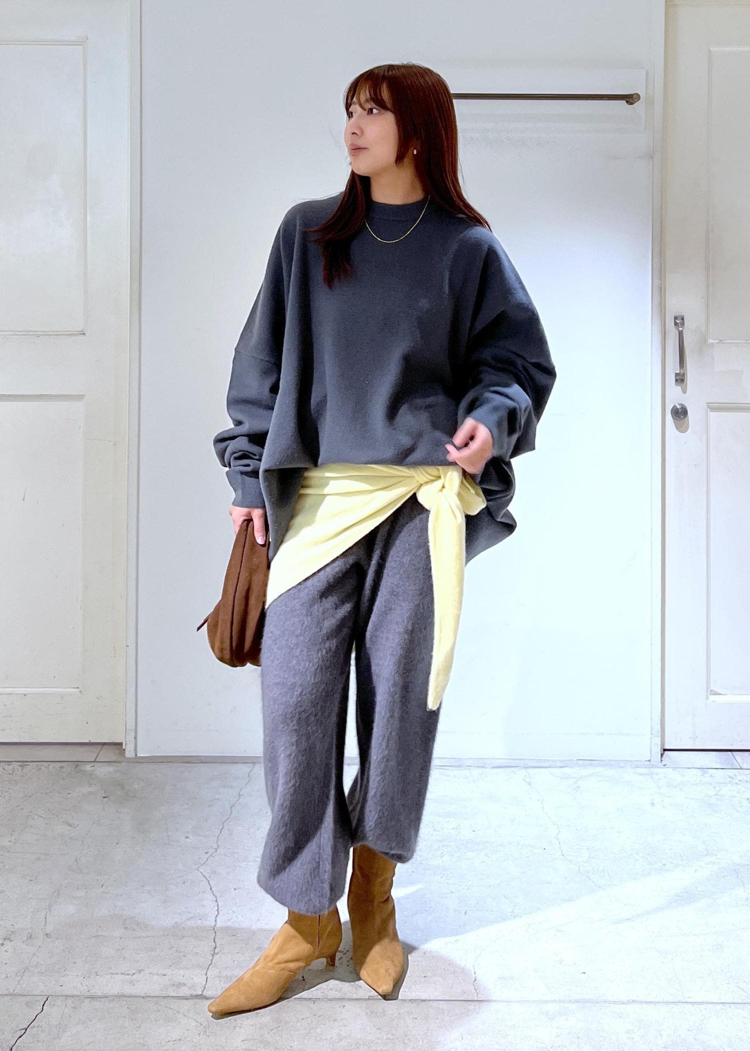 グレーのカシミヤセットアップに、イエローのスカーフを腰元にプラス。