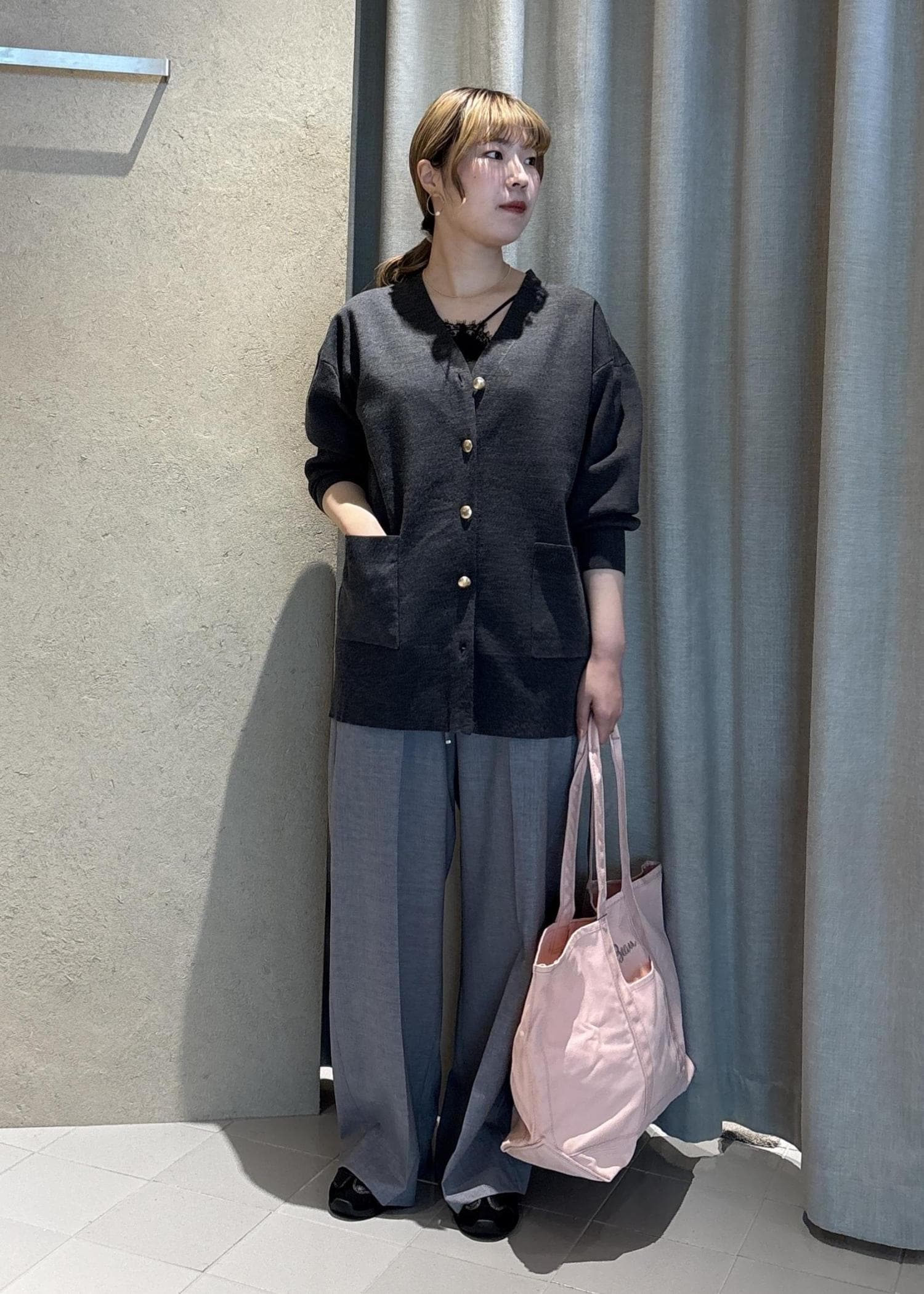 SALON adam et ropéウールVネック金ボタンカーディガングレー / F¥13,200レビュー下にかけてやや細くなる作りになるので、すっきり見えしてくれます!コートインやジャケットインがしやすいサイズ感なのも嬉しいです。