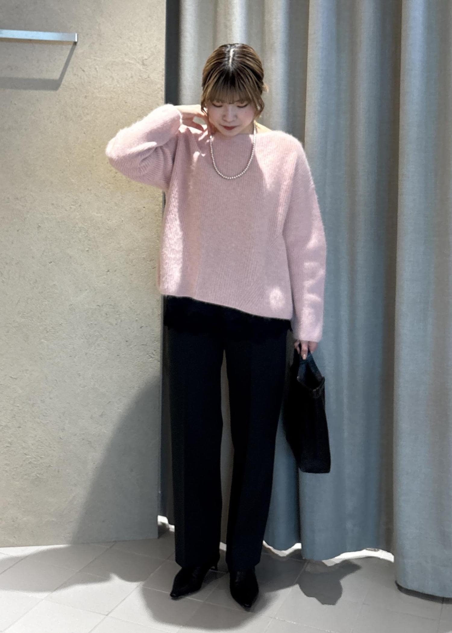 肌馴染みの良い青みピンクは、派手になりすぎない印象で着用できます。