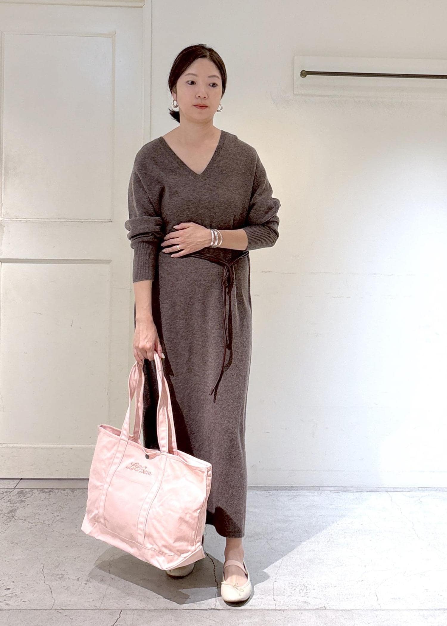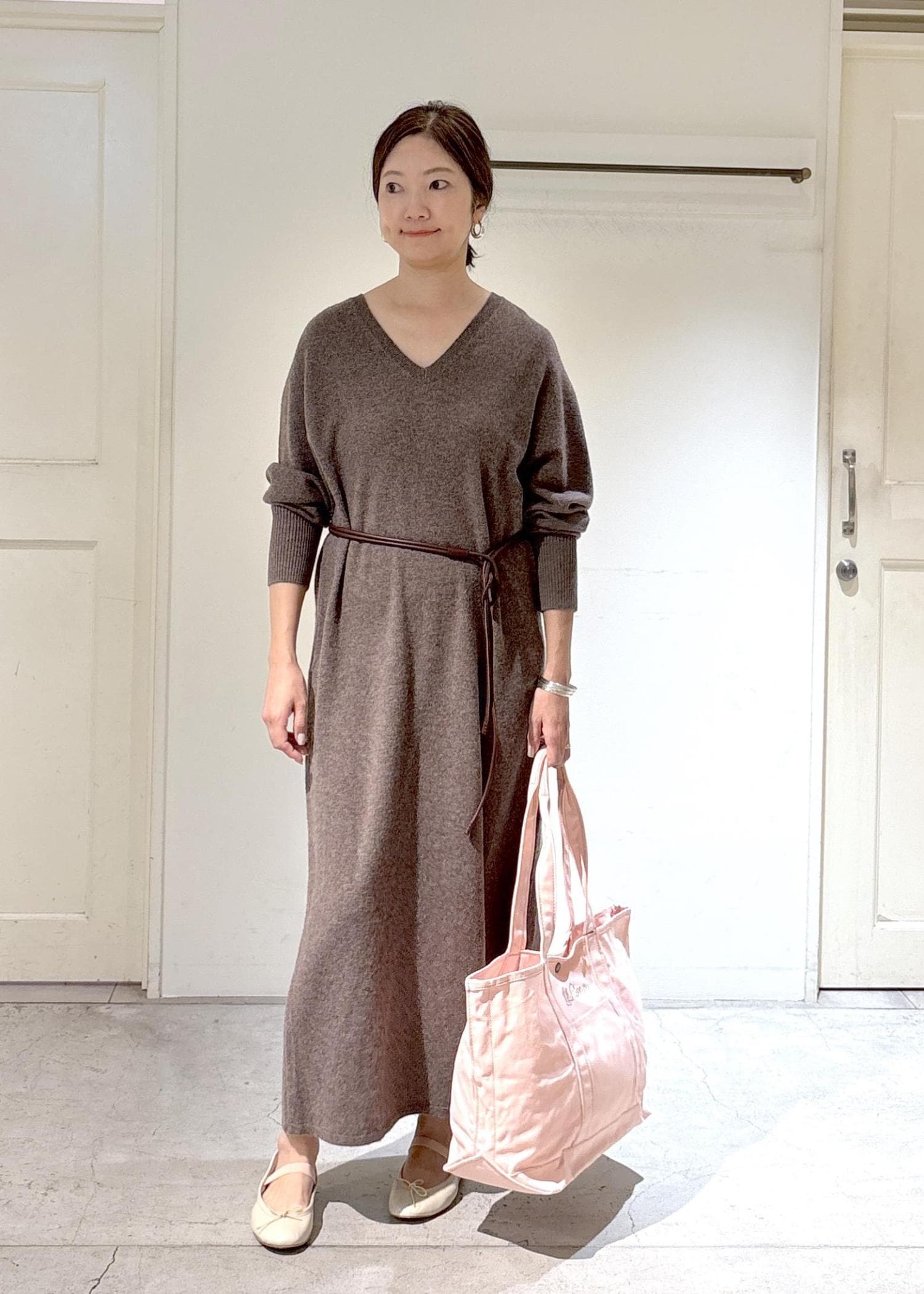 SALON adam et ropéカシミヤニットVネックワンピースブラウン系 / F¥19,800レビュー163cmでくるぶし下のマキシ丈です。身幅はゆとりのあるオーバーサイズ。ふわふわ気持ち良く、ほんわか暖かいカシミアを存分に味わえるワンピースです。