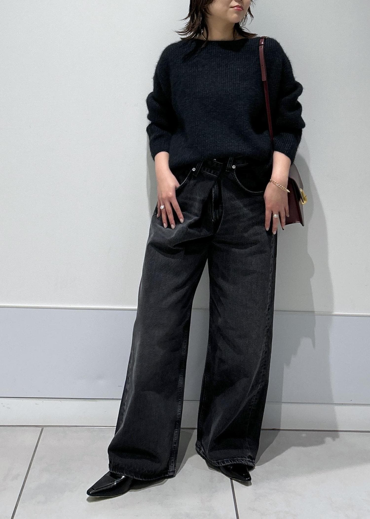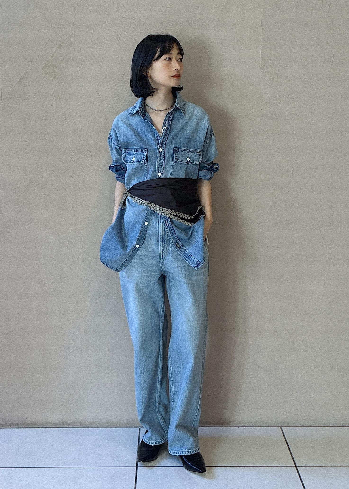 ウエストはゆったりめ、おしり周りやもも周りも拾いにくいデニムです。着丈はやや長めです。