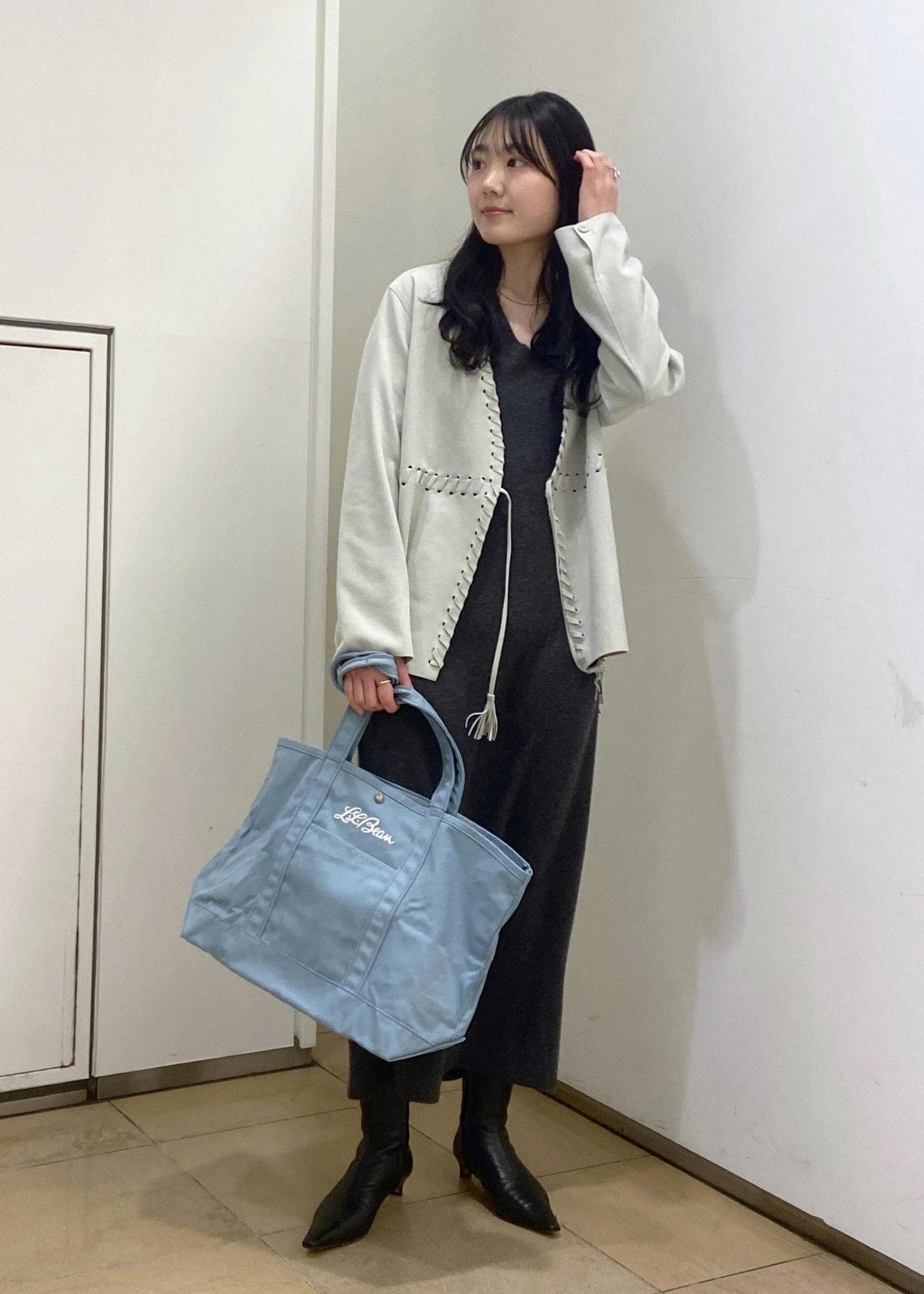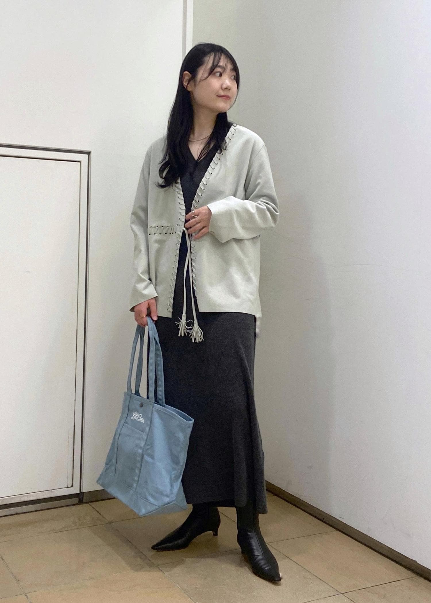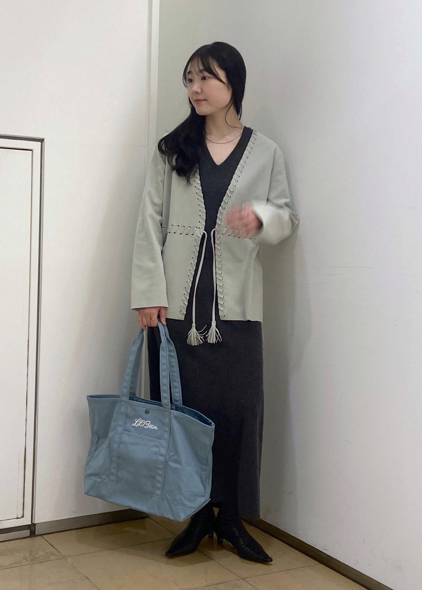 シンプルで気負いなく、でも上質な素材感がワンポイントになるスタイリングにしました。