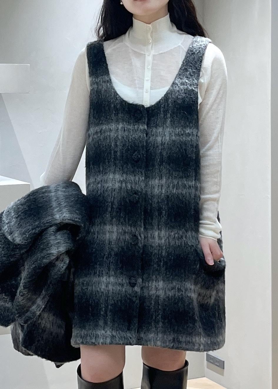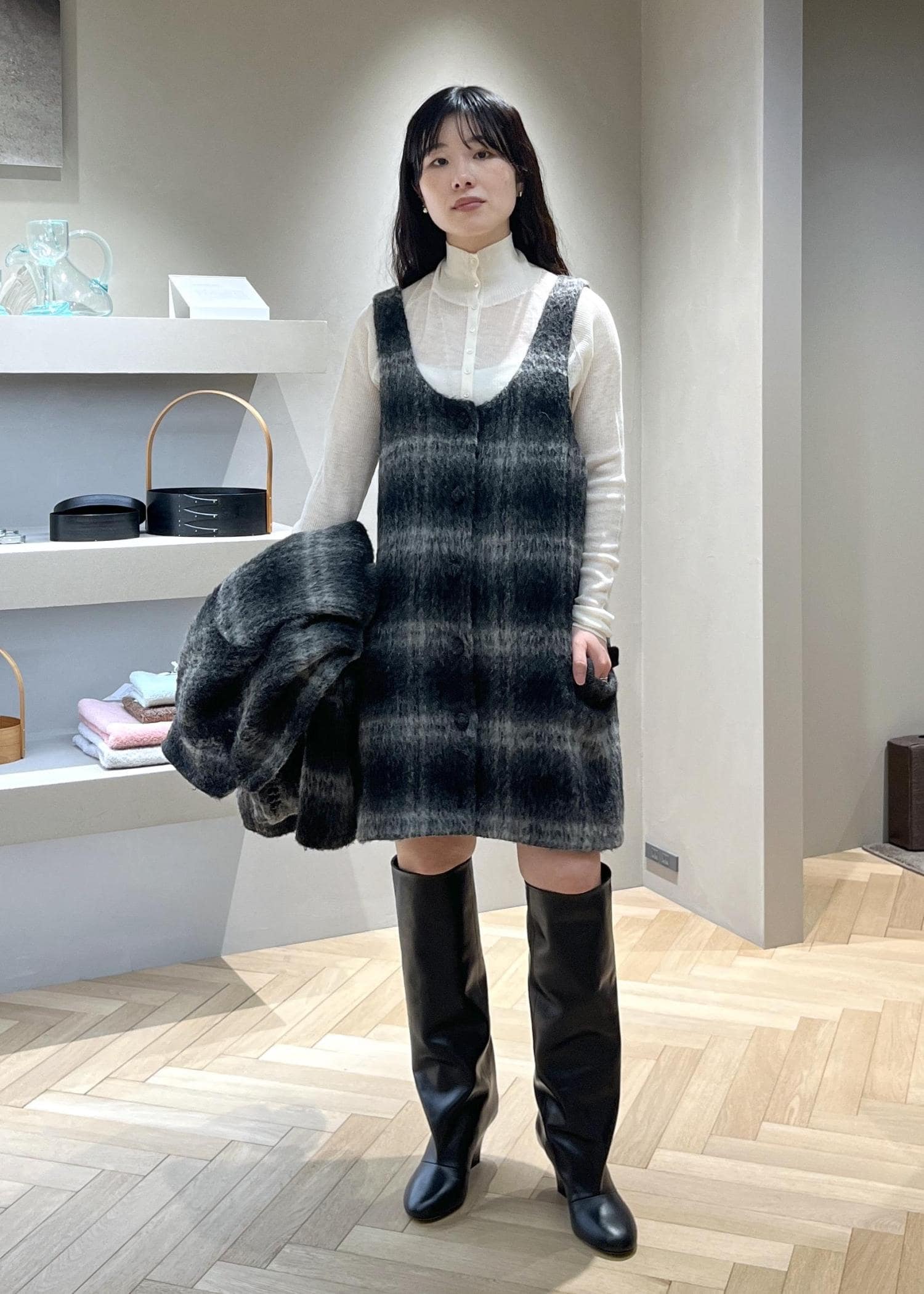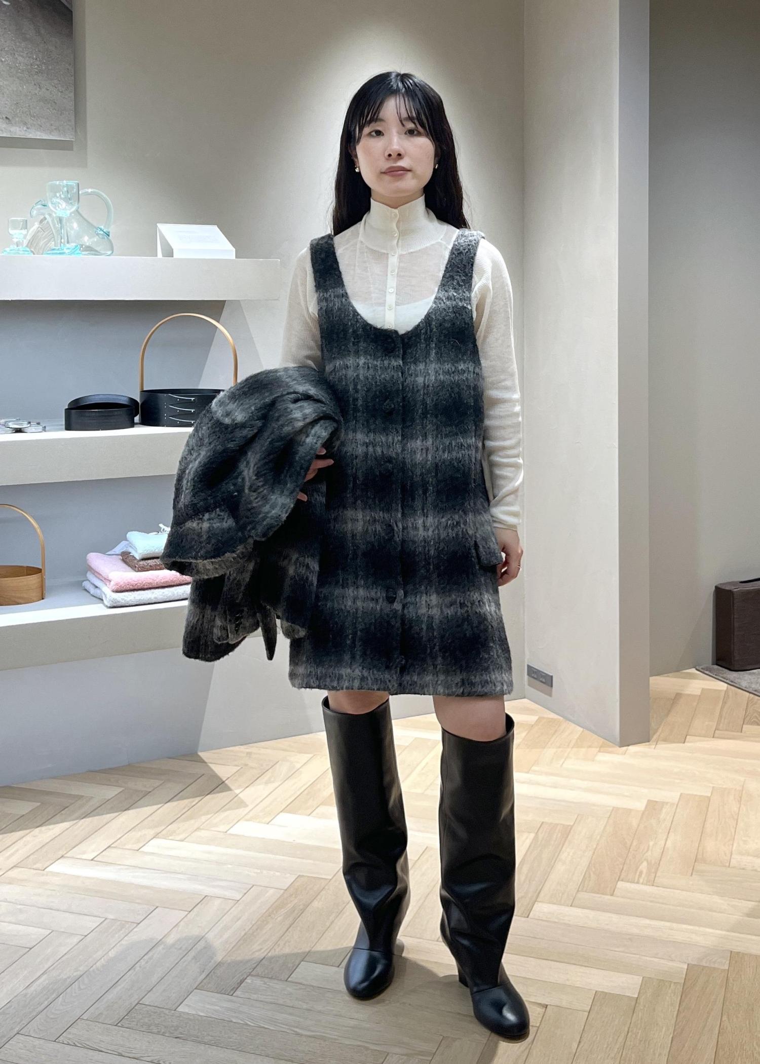 BALLI社のアルパカ混シャギー素材を使用。ミニ丈のゆったりとしたジャンバースカートですが、ボタンを開ければジレとしても着用できます。 -