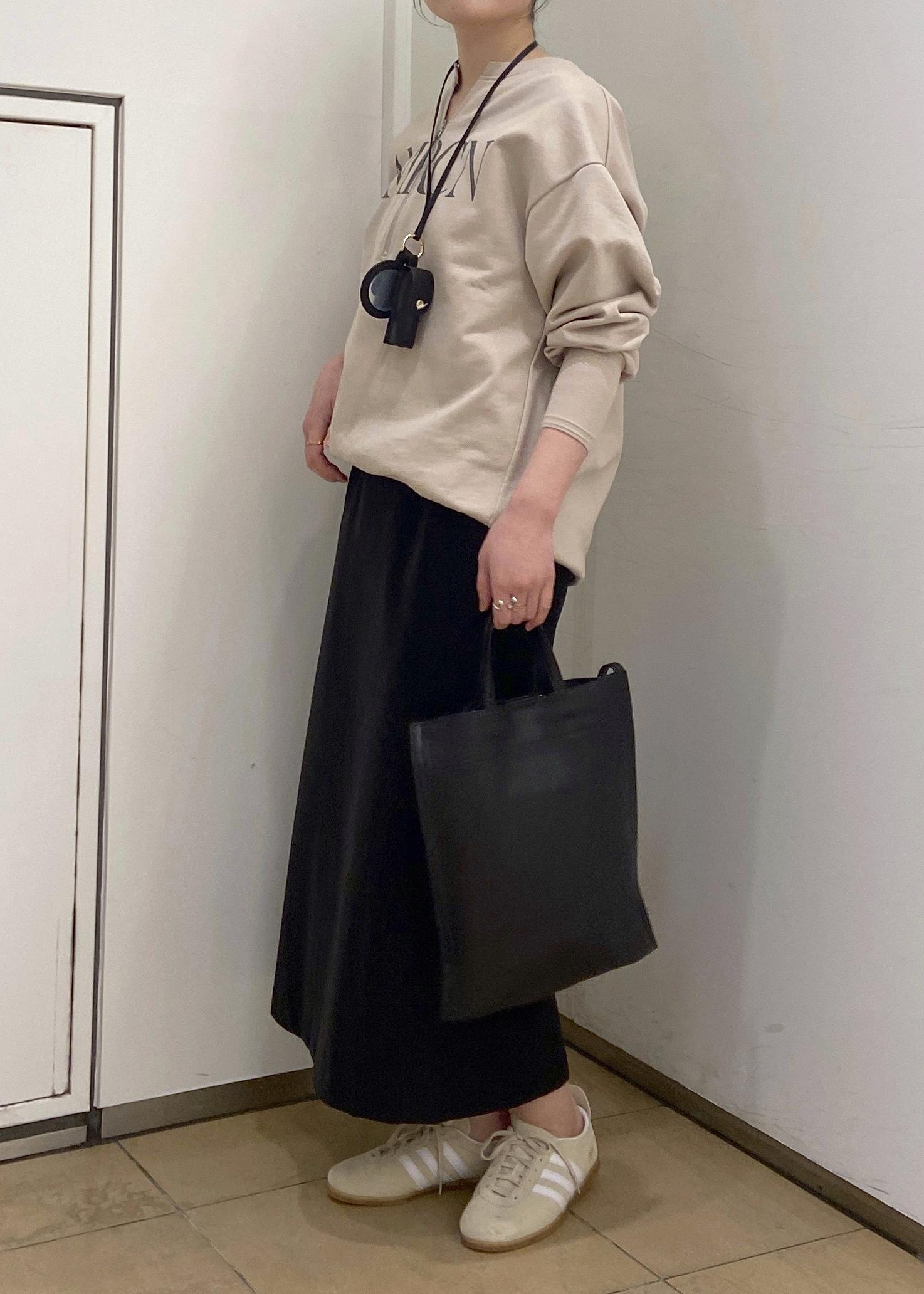 首の詰まったトップスが苦手な方も抜け感の出るスウェットです。