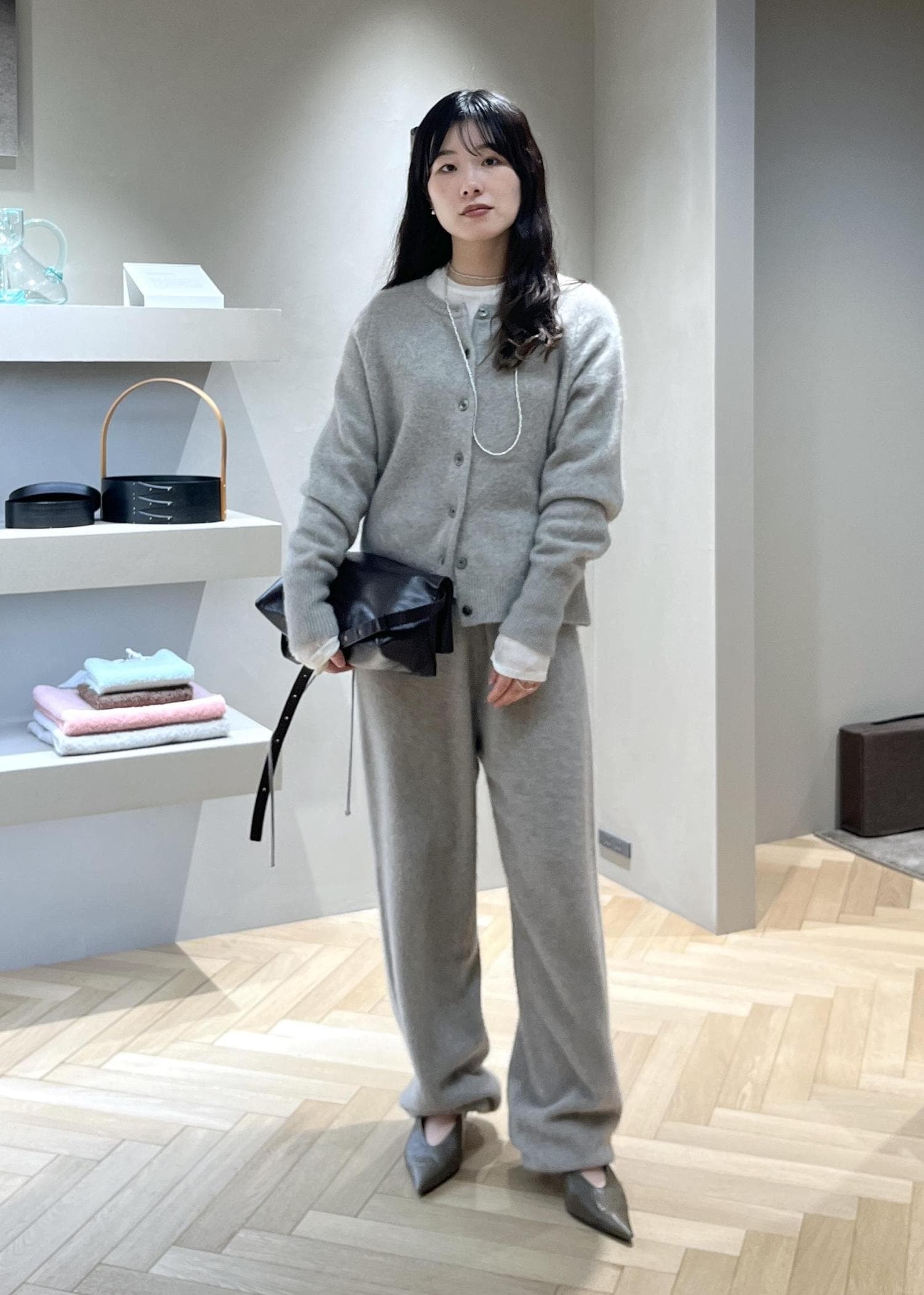 カシミヤ100%、エアリー感のある毛足です。首元などはしっかりリブがあり、伸縮性ある素材なので着心地◎チクチク感もありません。 -