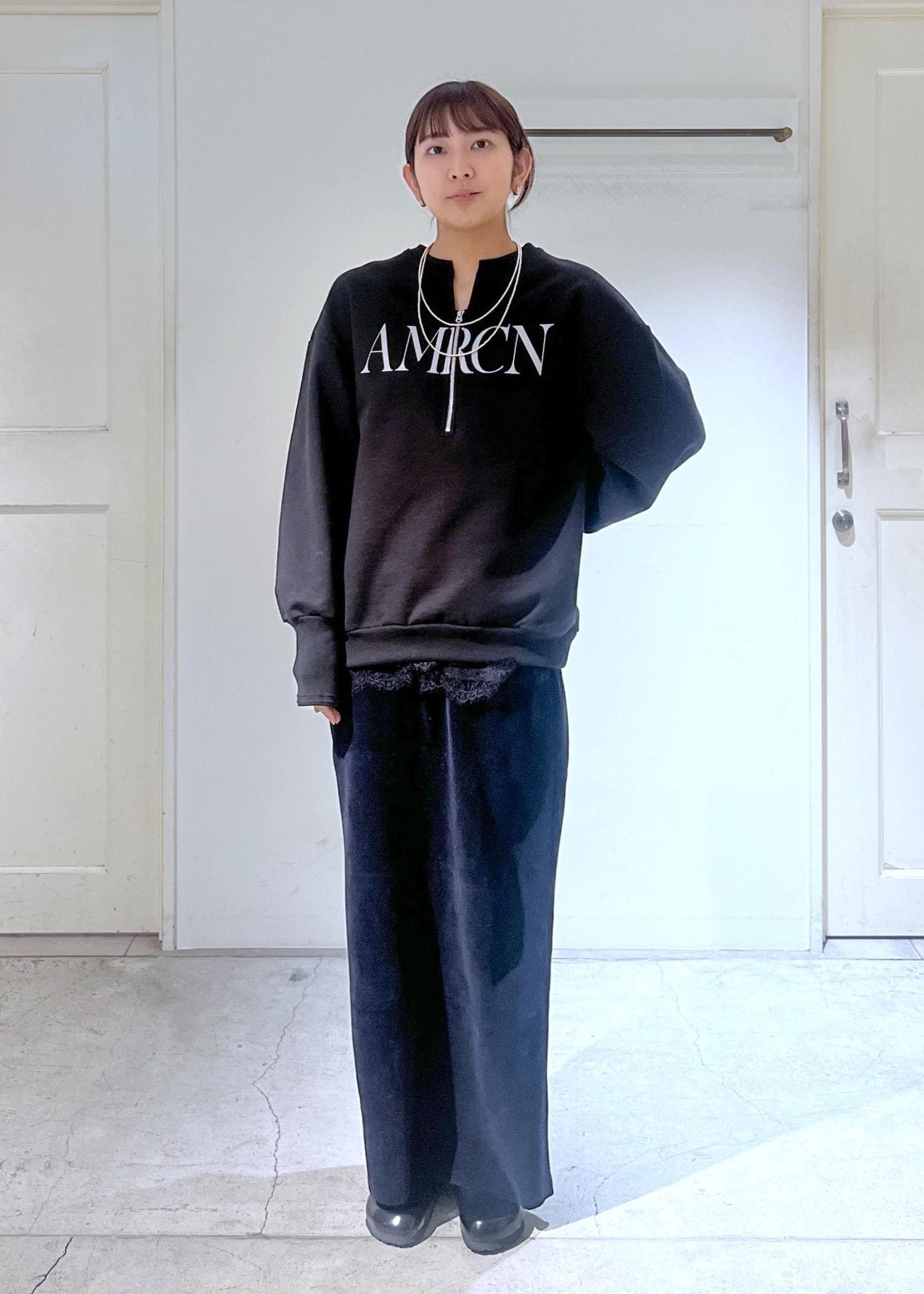 SALON adam et ropé【Americana(アメリカーナ) for SALON】ロゴジップスウェットブラック系 / F¥23,100レビュー身幅はゆったり。後ろにかけてやや長くなっており、ヒップあたりまで丈があります。程よく厚手ですが着やすいサイズ感です。