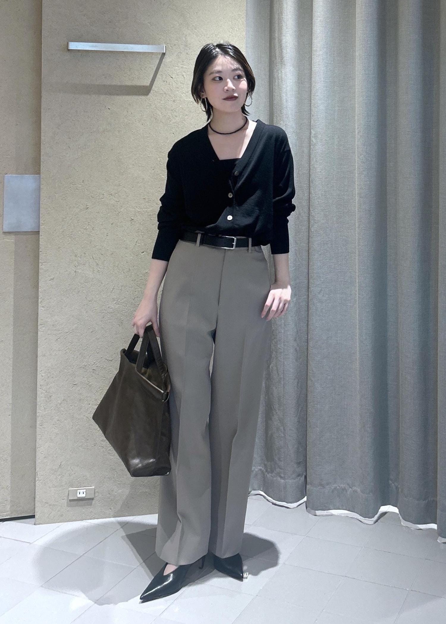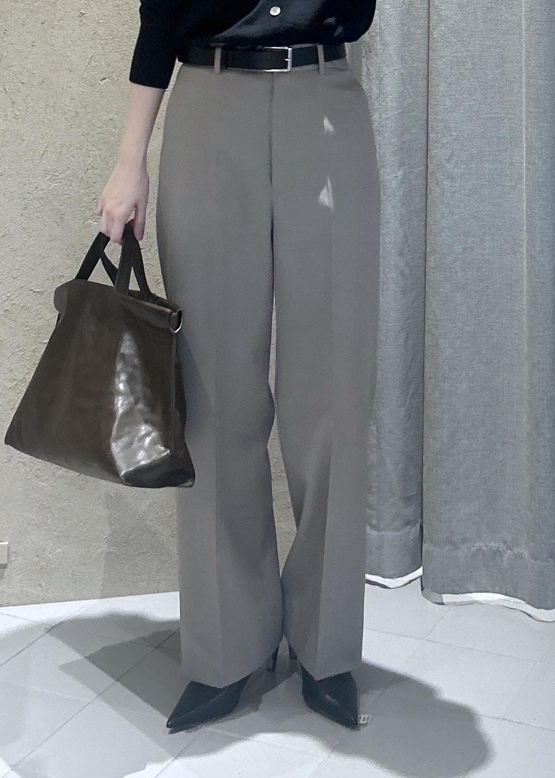 バッグはツヤのあるレザーバッグではなく、シボ革でミニマルなデザインのものを選びました。