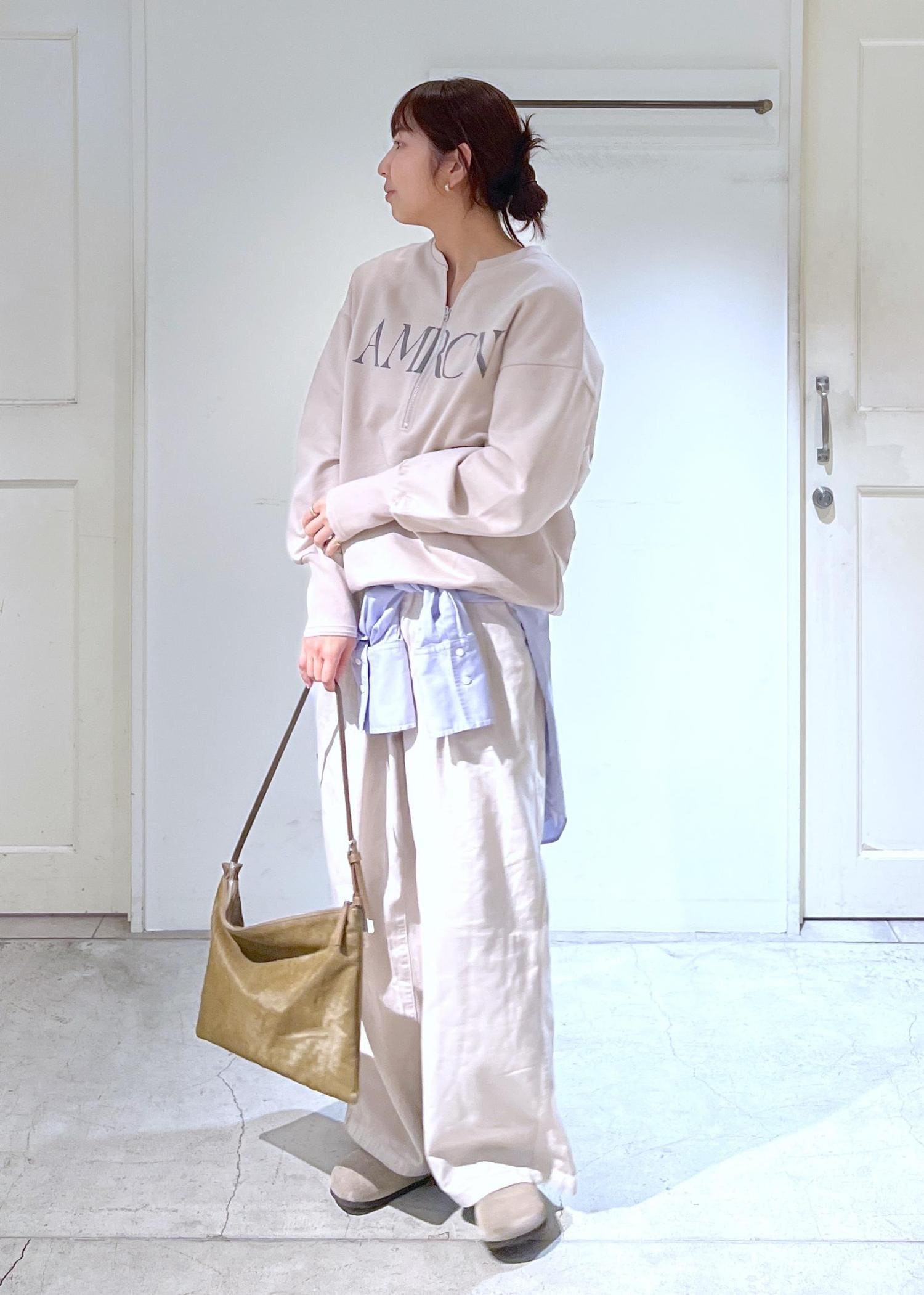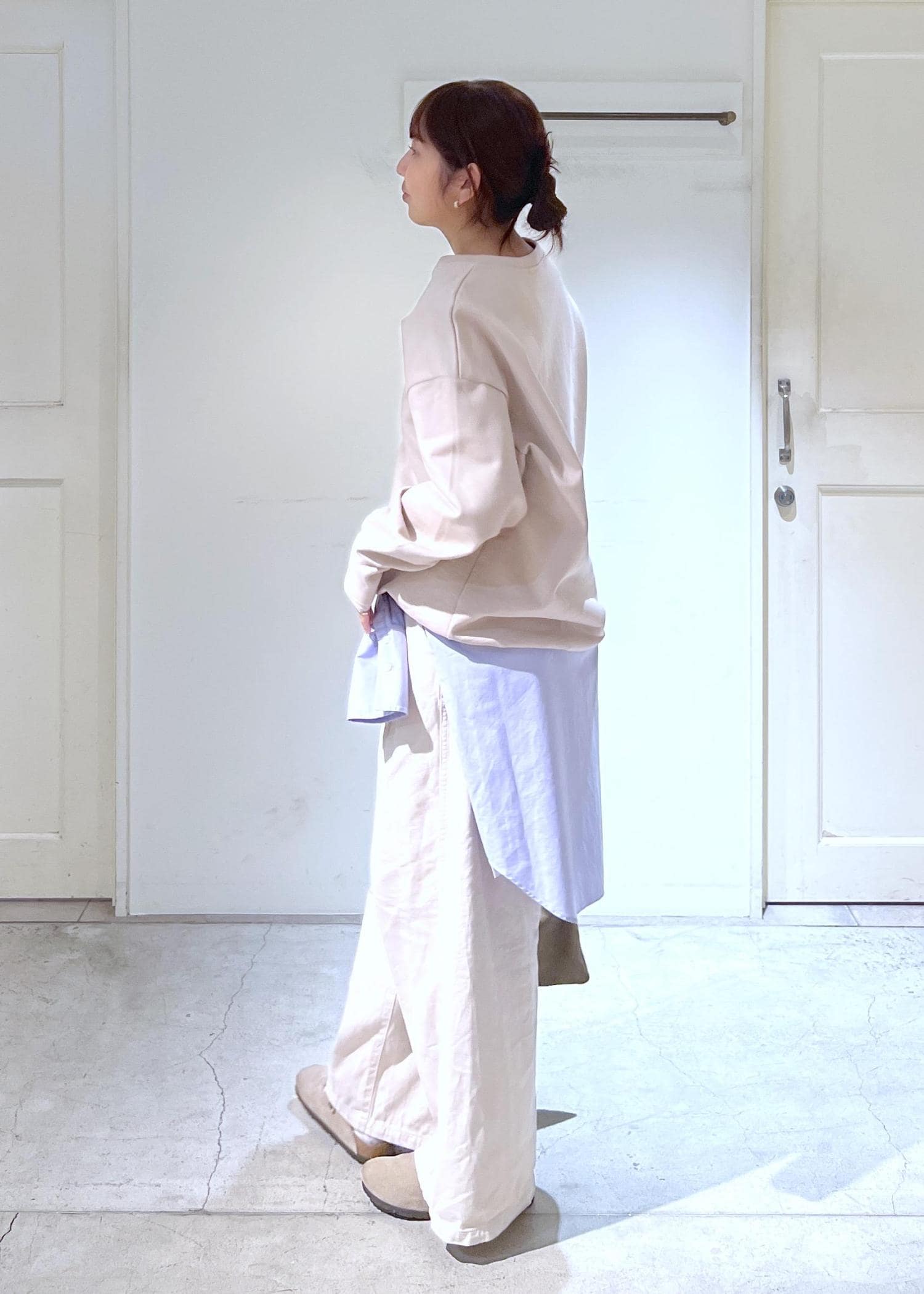 ワントーンでベージュとオフホワイトのパンツとの組み合わせにブルーのシャツを差し込みました。