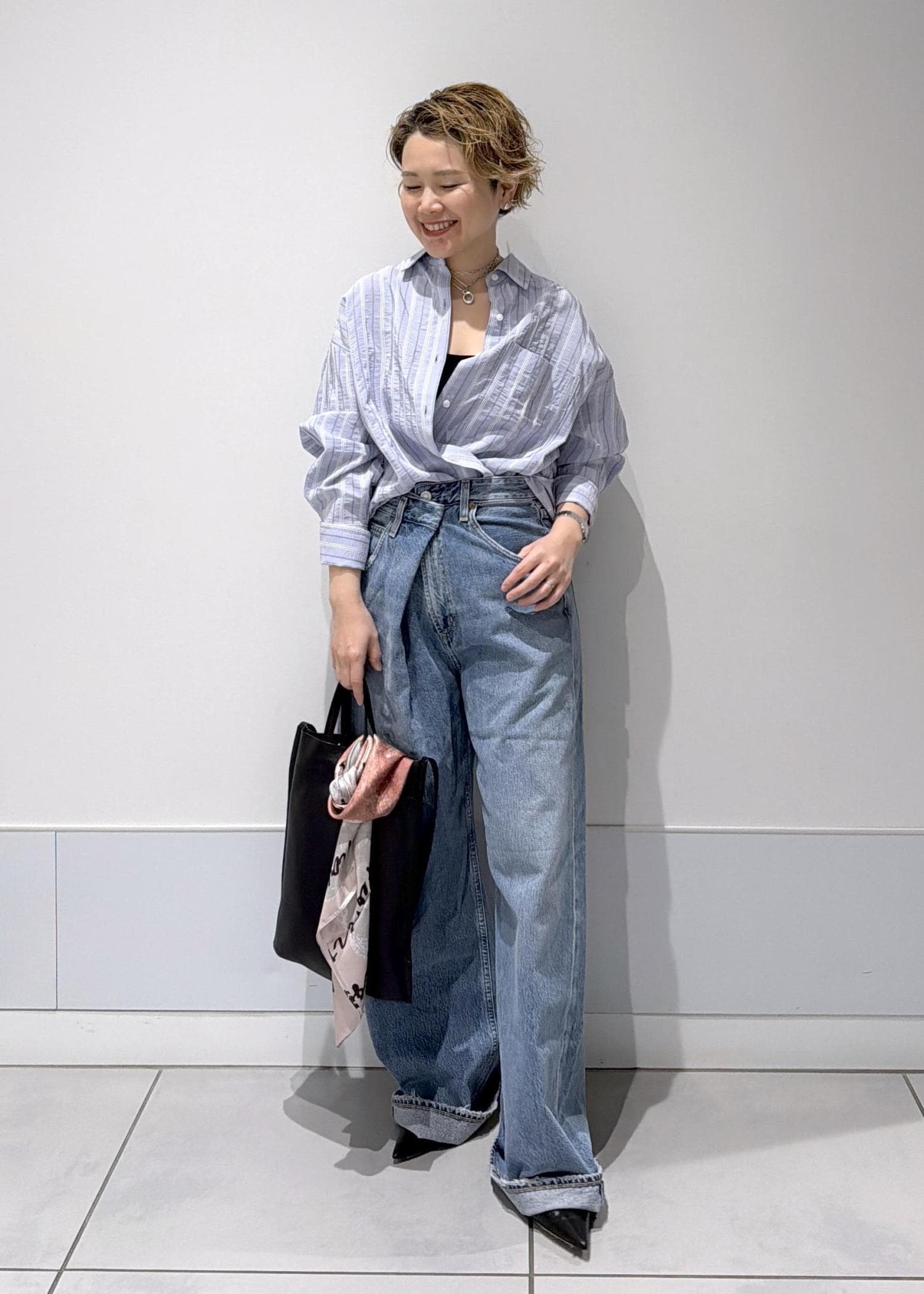 フロントのデザインが特徴的なので、トップスのボタンを開けてデザインが見えるようにスタイリングしました♡