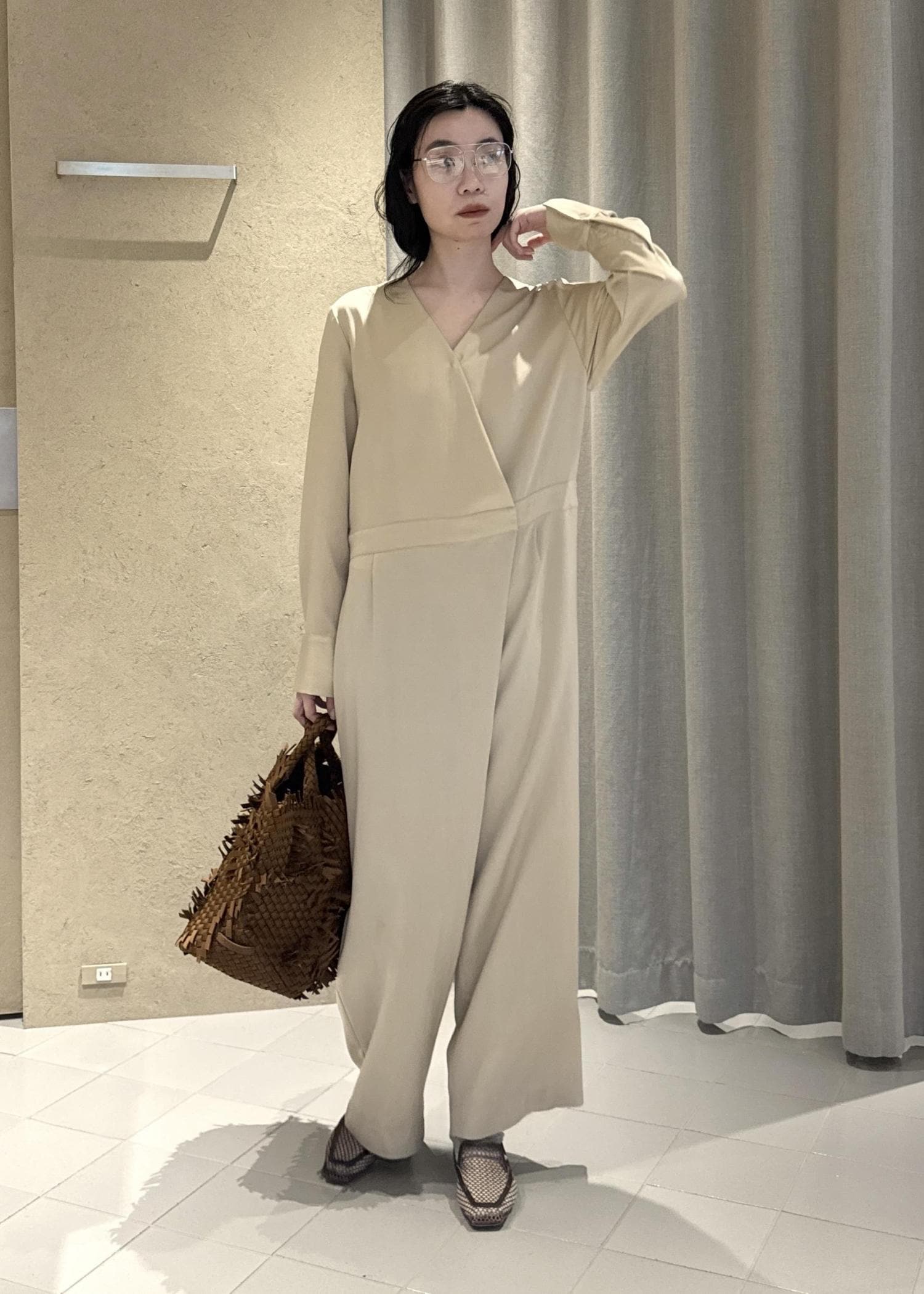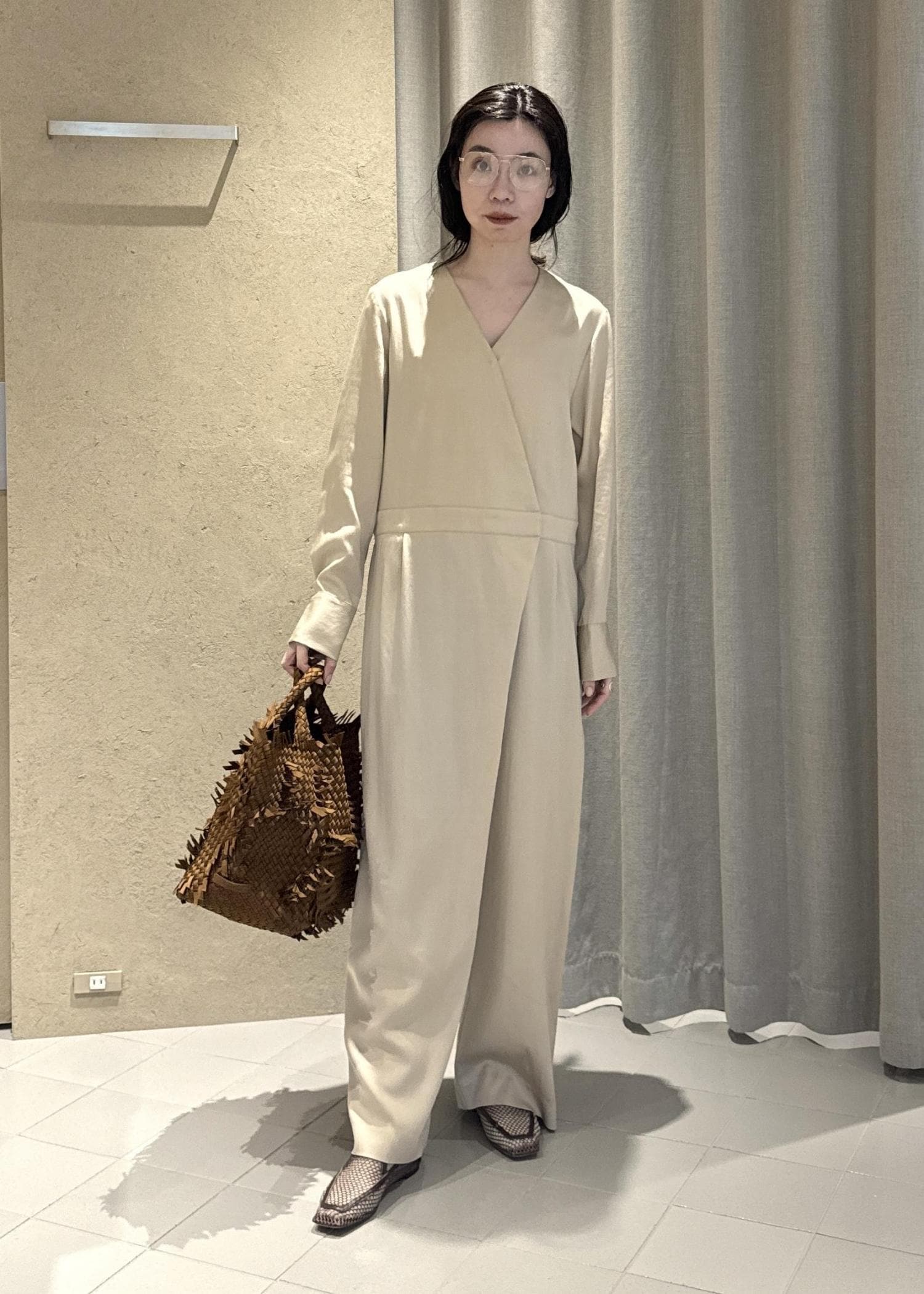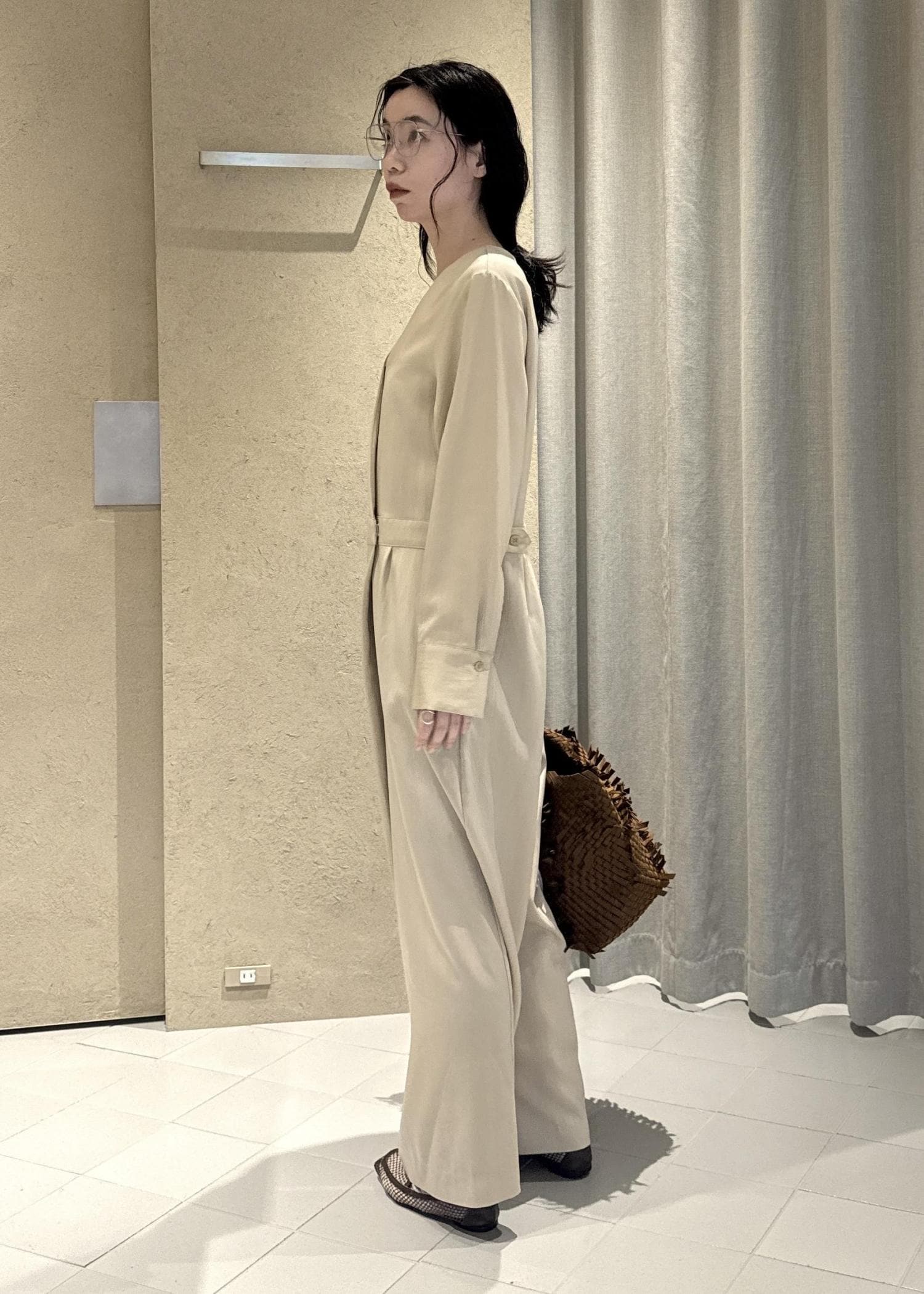 SALON adam et ropéフロントクロスオールインワンベージュ / F¥36,300レビュー163センチで足の甲がちょうど見えるくらい。
