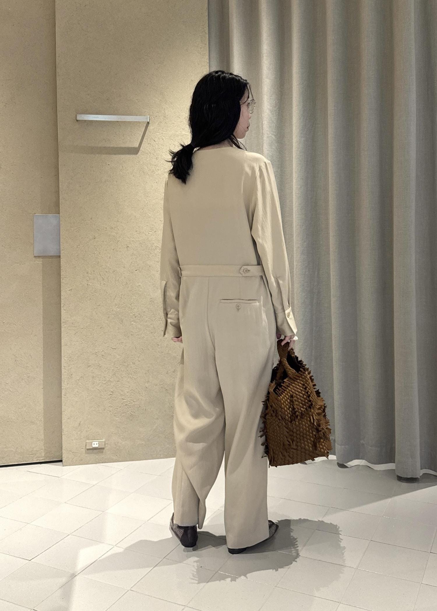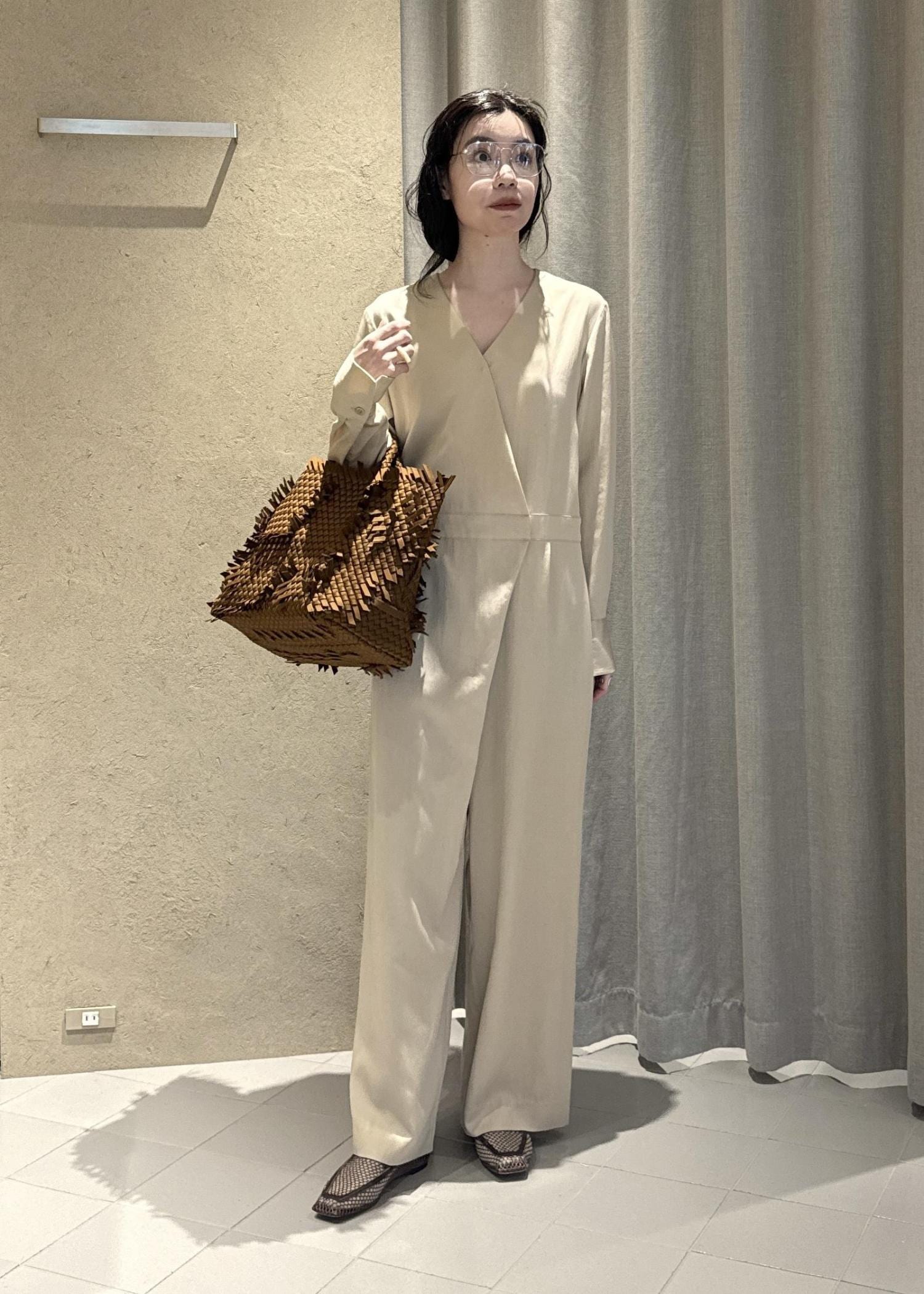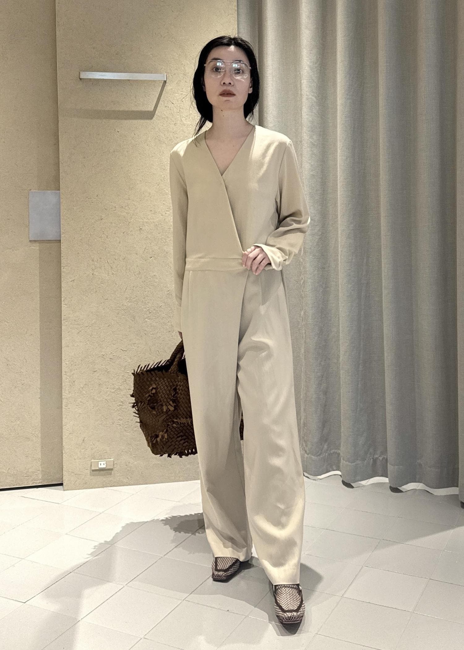 SALON adam et ropéフロントクロスオールインワンベージュ / F¥36,300レビュー163センチで足の甲がちょうど見えるくらい。