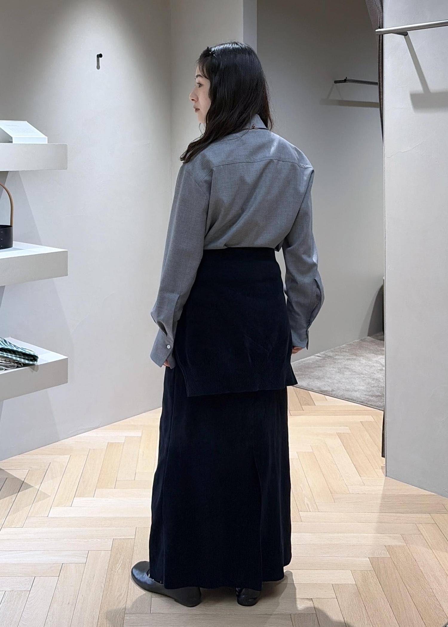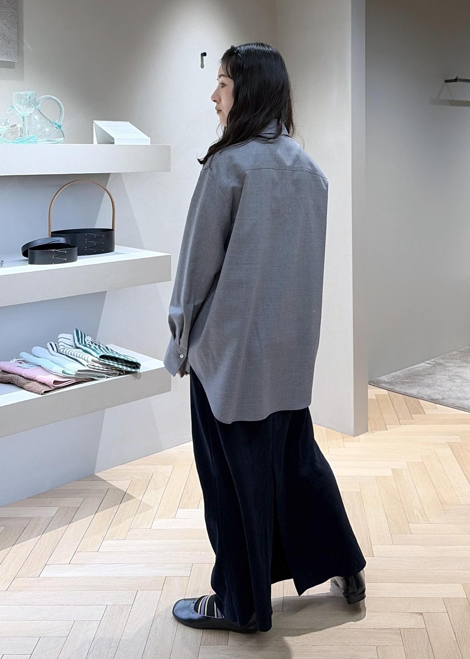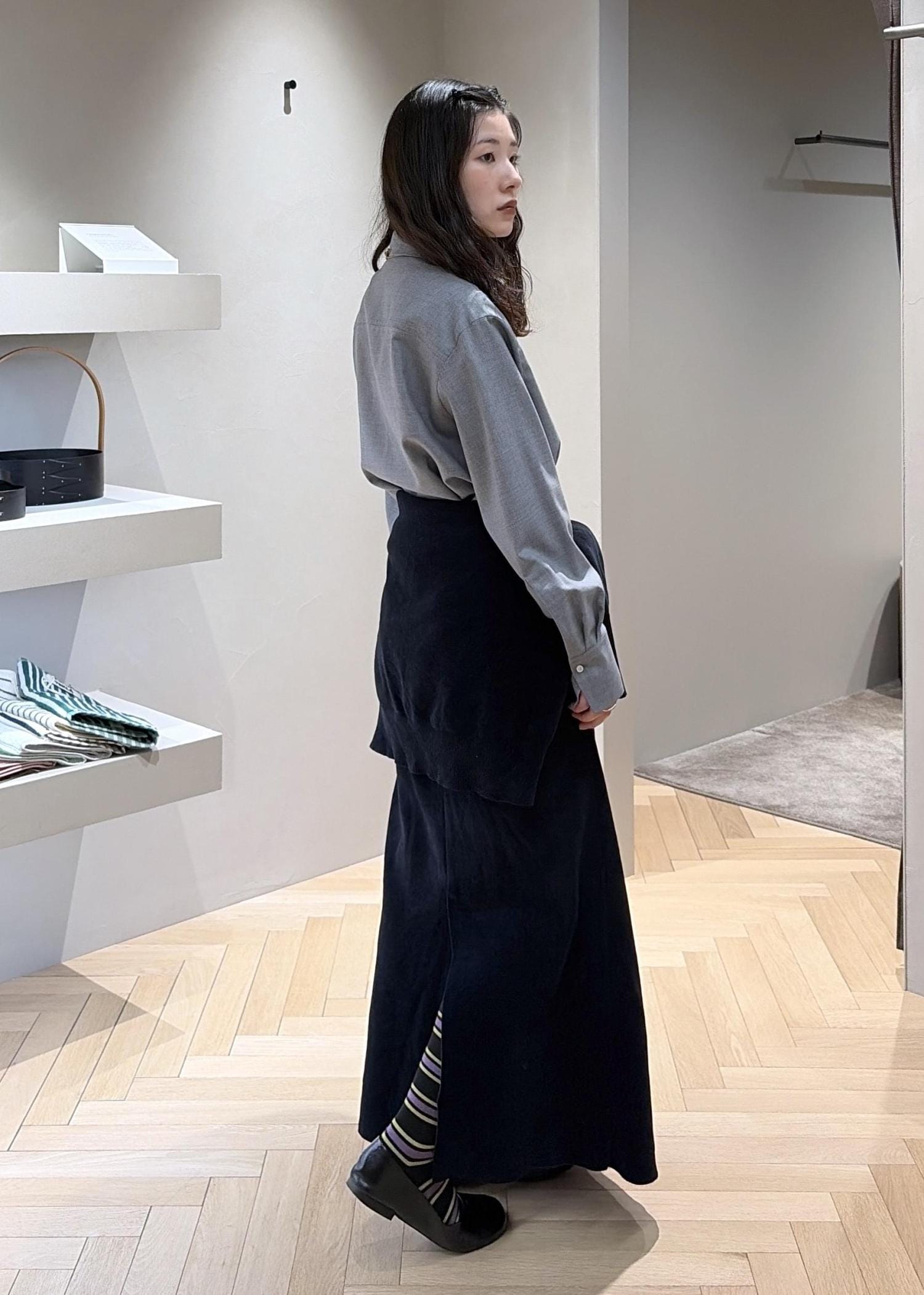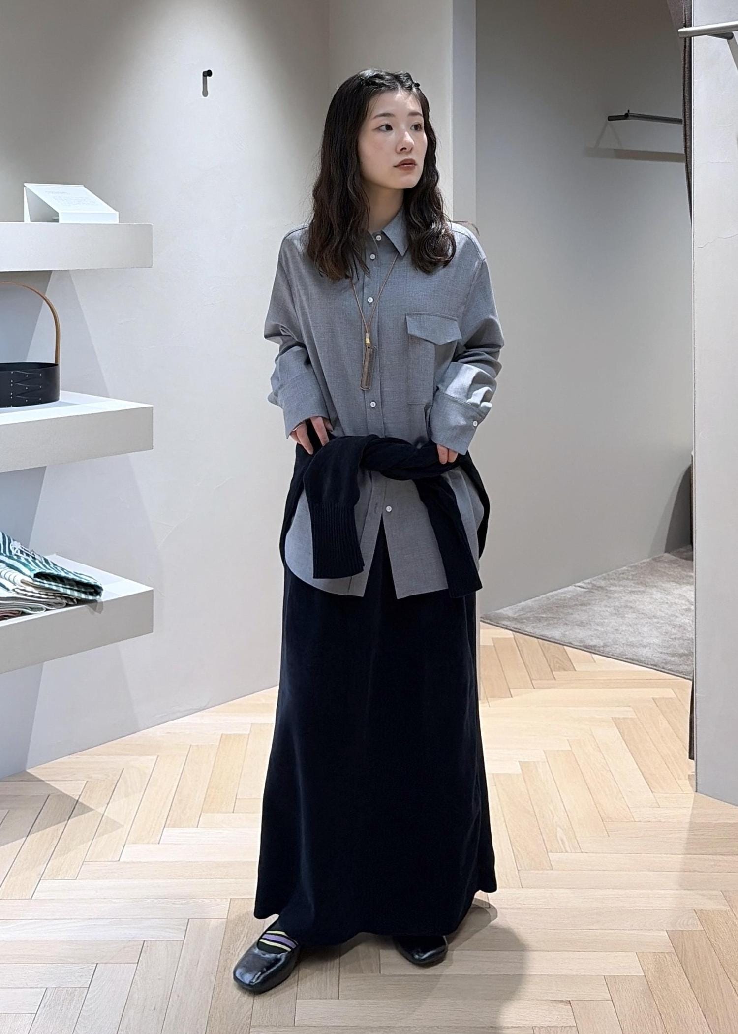 グレーのシャツと合わせてワントーンに、
