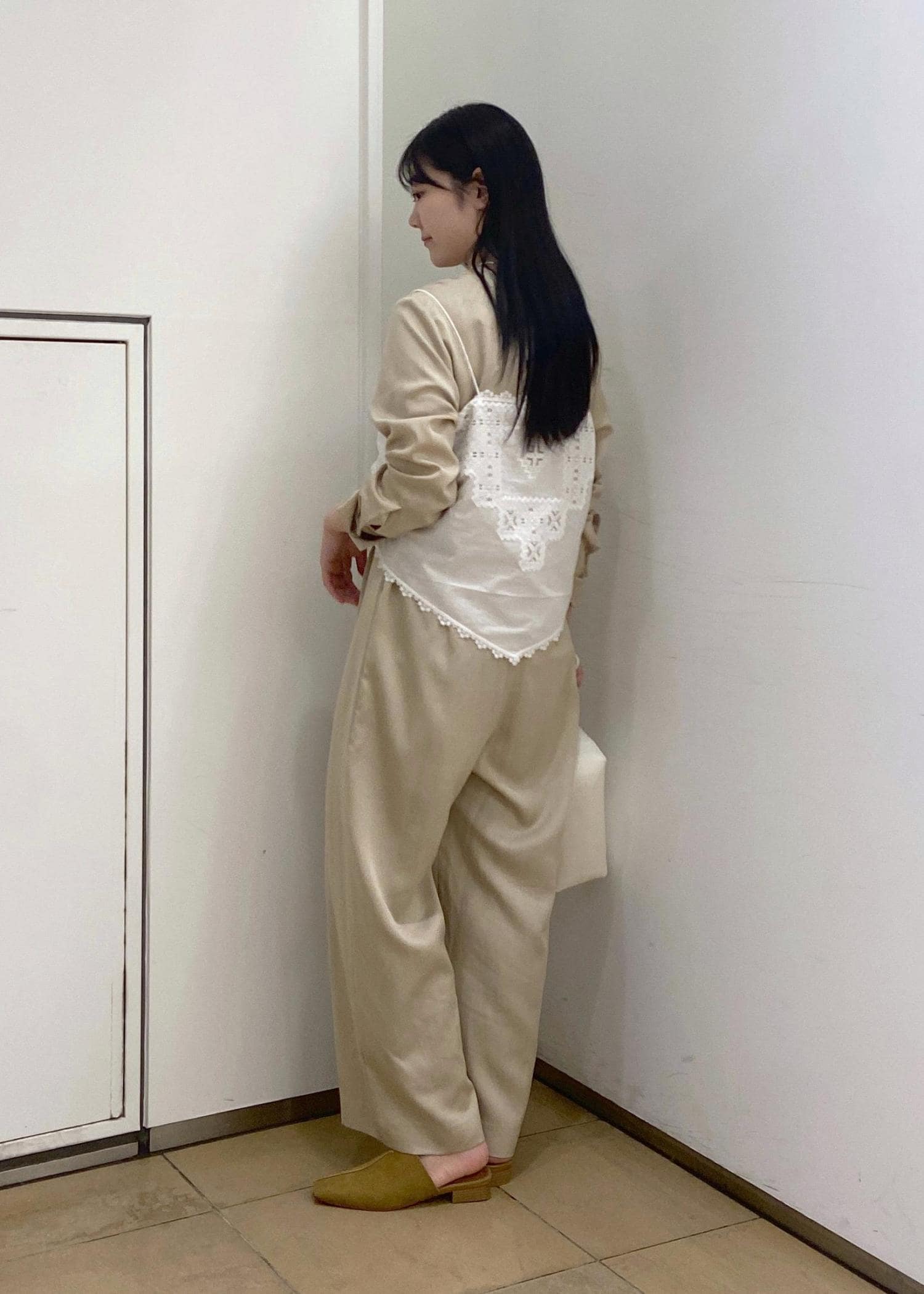 一枚で着るのも素敵なのですが、レースビスチェを巻いてメリハリをつけ、レイヤードスタイルの旬なムードで着てみました。
