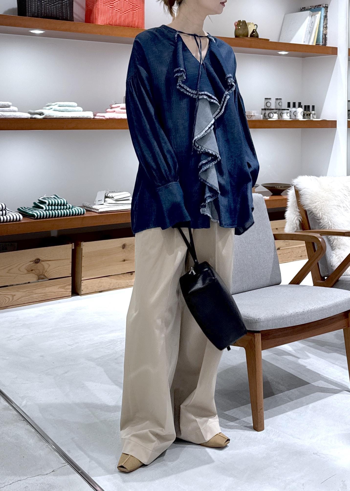 SALON adam et ropéデニムライクラッフルフリルブラウスブルー系 / F¥23,100レビューフロントデザインと落ち感のある素材で肩周りもすっきりした印象に。