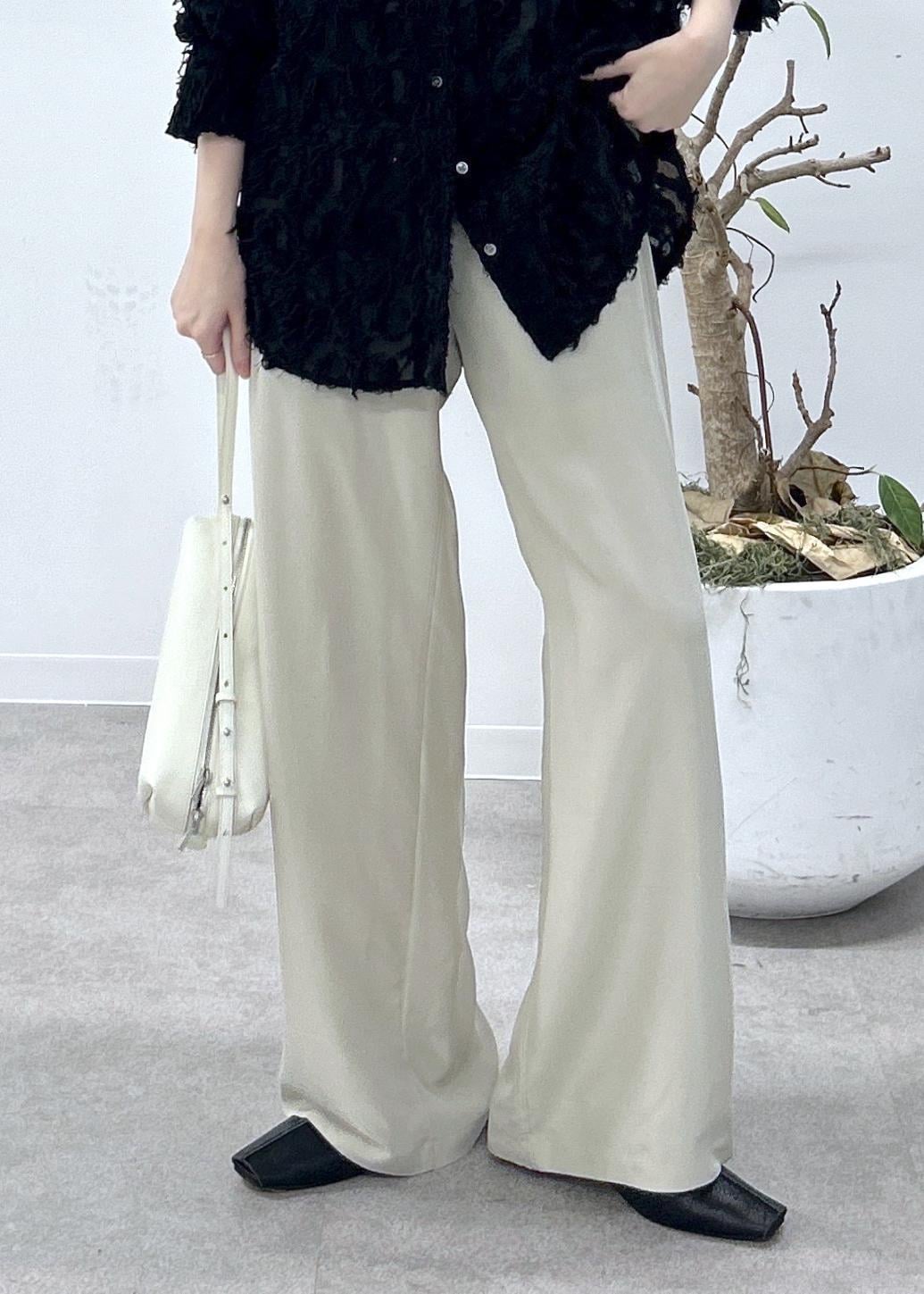 リラックスパンツのような楽ちんデザインですが、シルク特有のツヤにより上品な雰囲気に仕上がります。