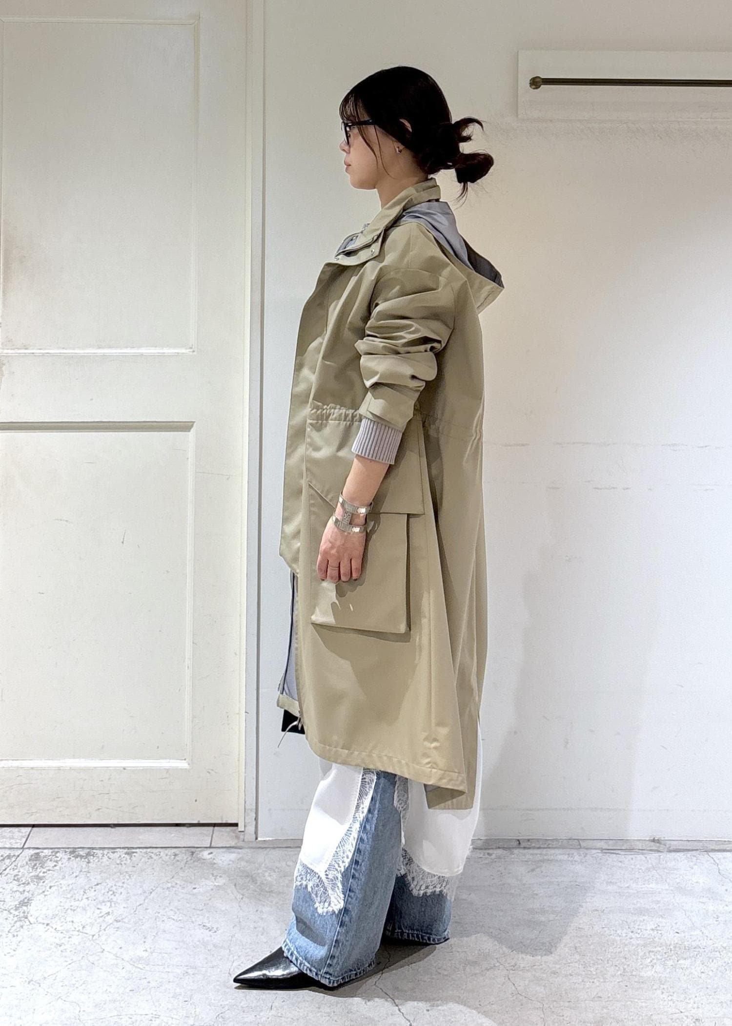 SALON adam et ropé3レイヤーミリタリーコート / KAJIFベージュ / F¥49,500レビュー丈は膝あたりで身幅はゆったりめです。