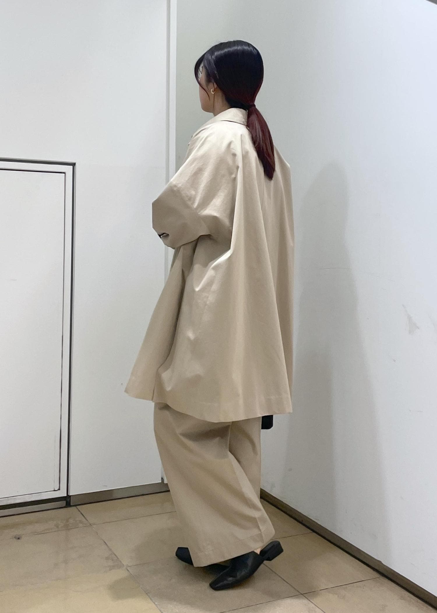オーバーサイズなので袖をボタンで留めてメリハリを出すとすっきり着ていただけます。 -