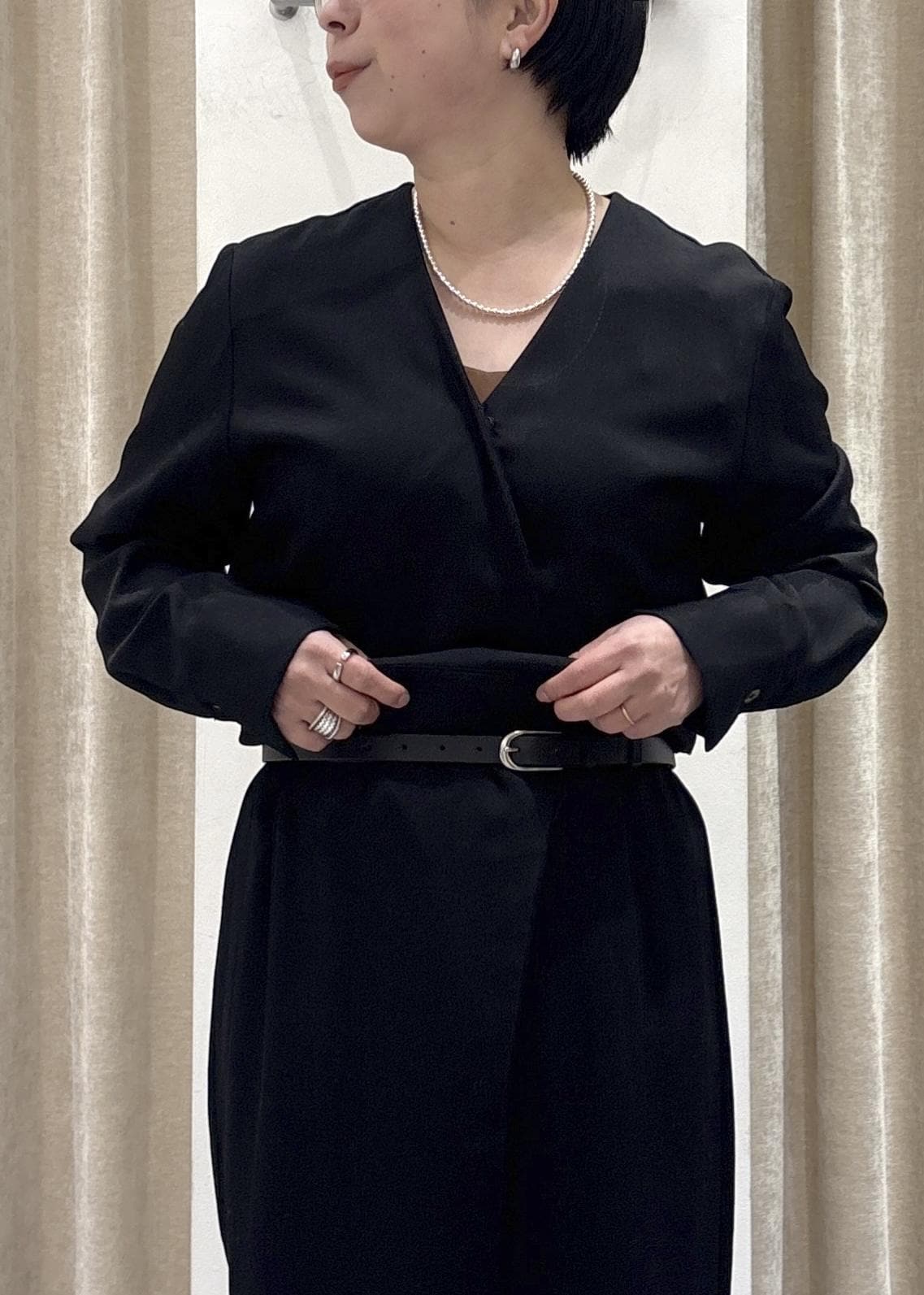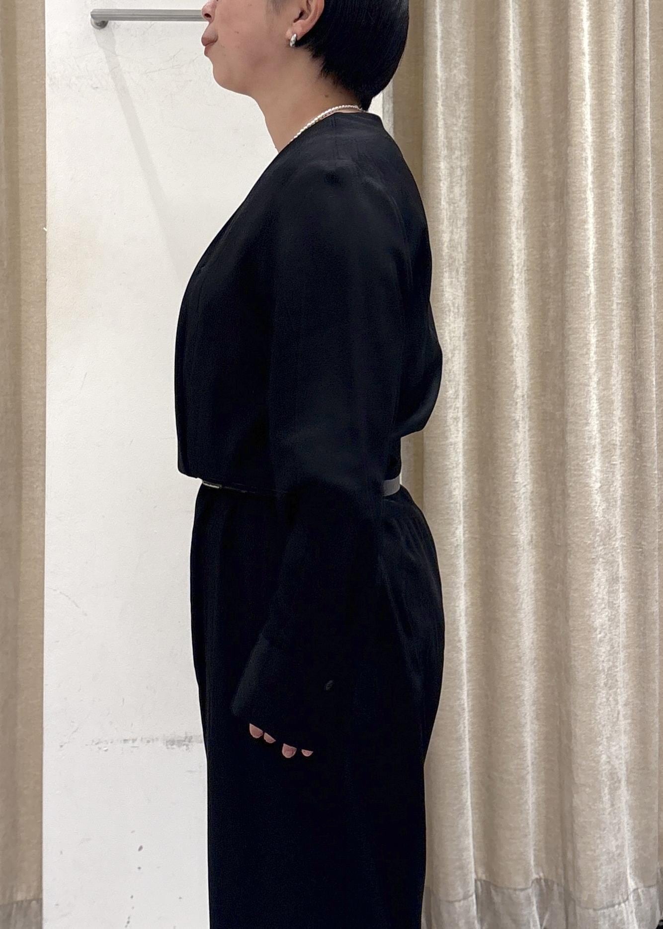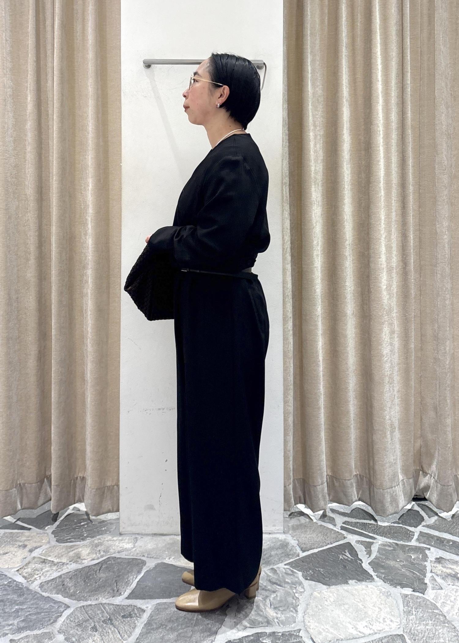 身頃、アーム、ウエスト共にゆったりめのサイズ感。着丈は154cmでヒールだとぎりぎりいけましたが、フォーマルスタイルの時はベルトでブラウジングした方がバランスよく着られました。