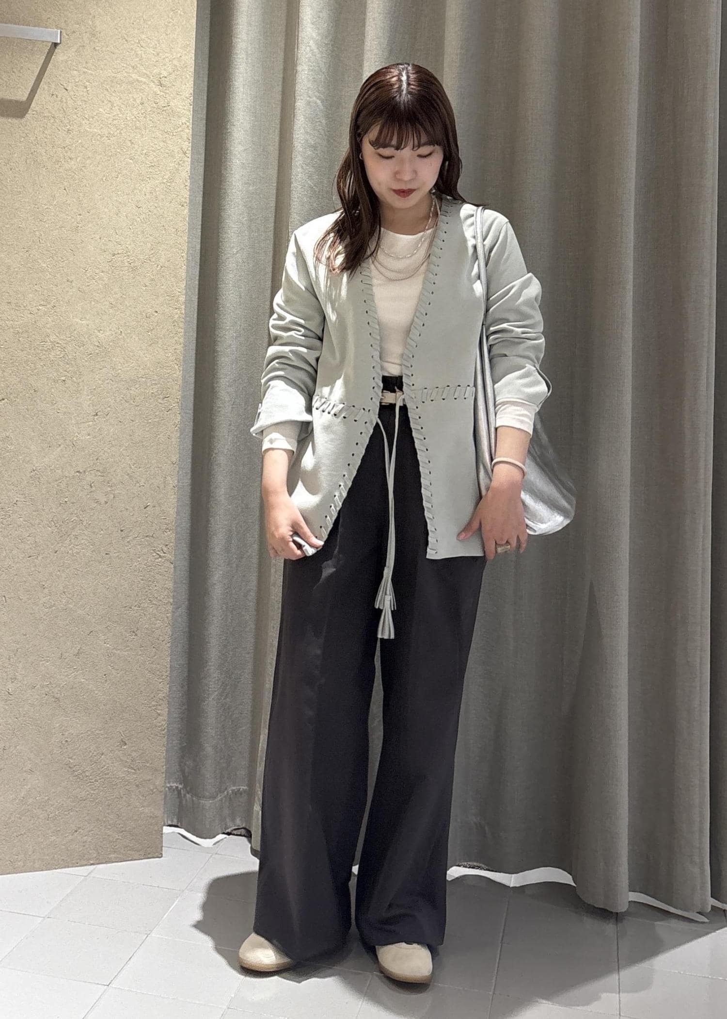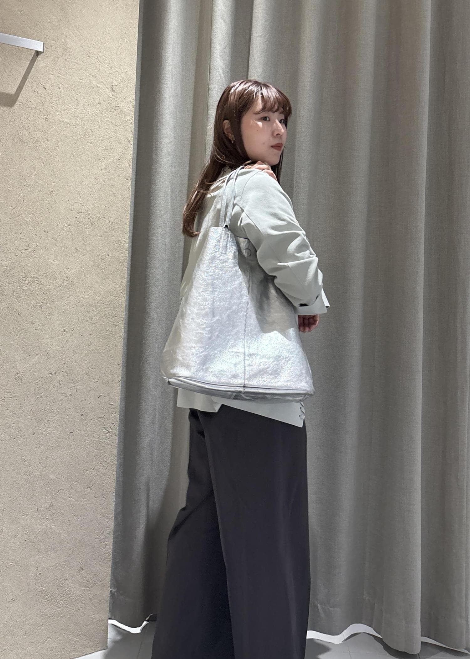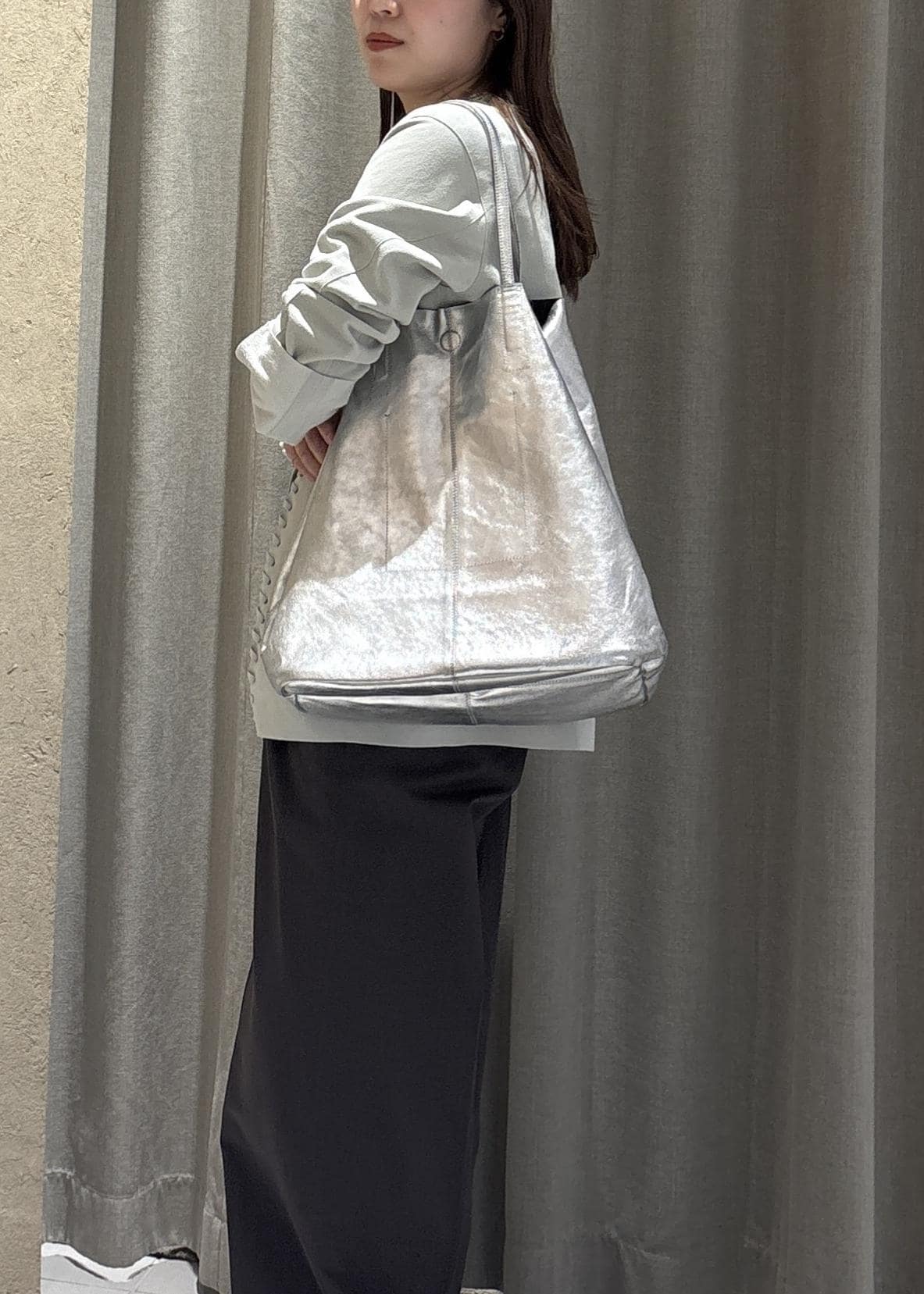 春のスタイリングにぴったりなシルバーのバッグ、とても可愛いです。