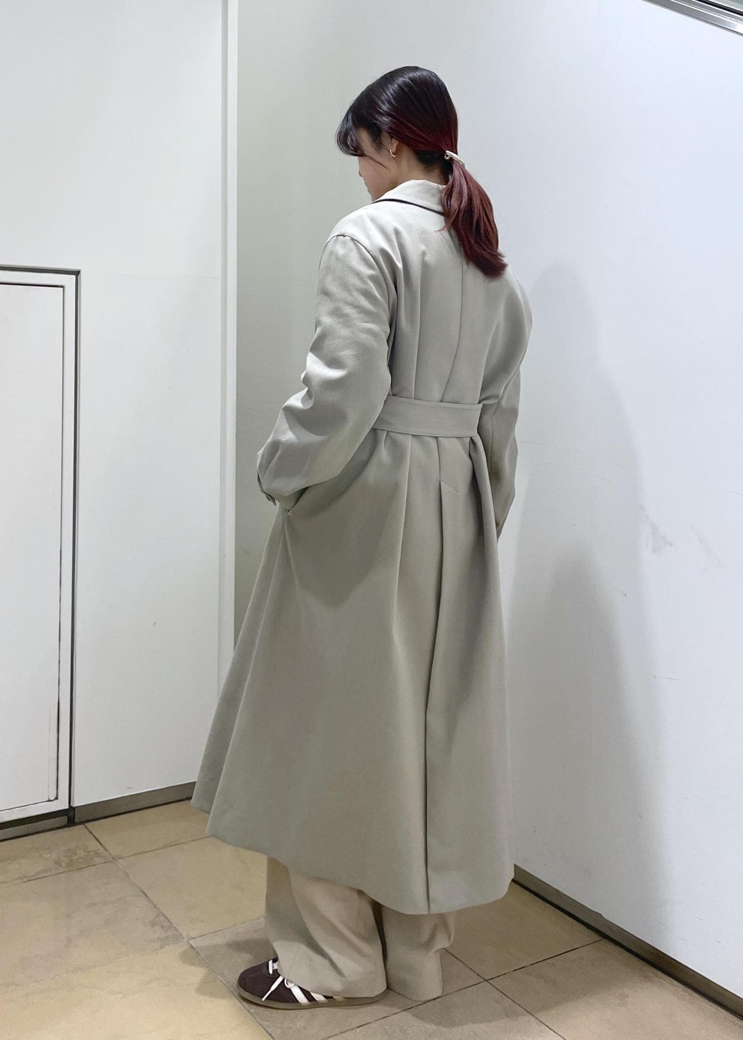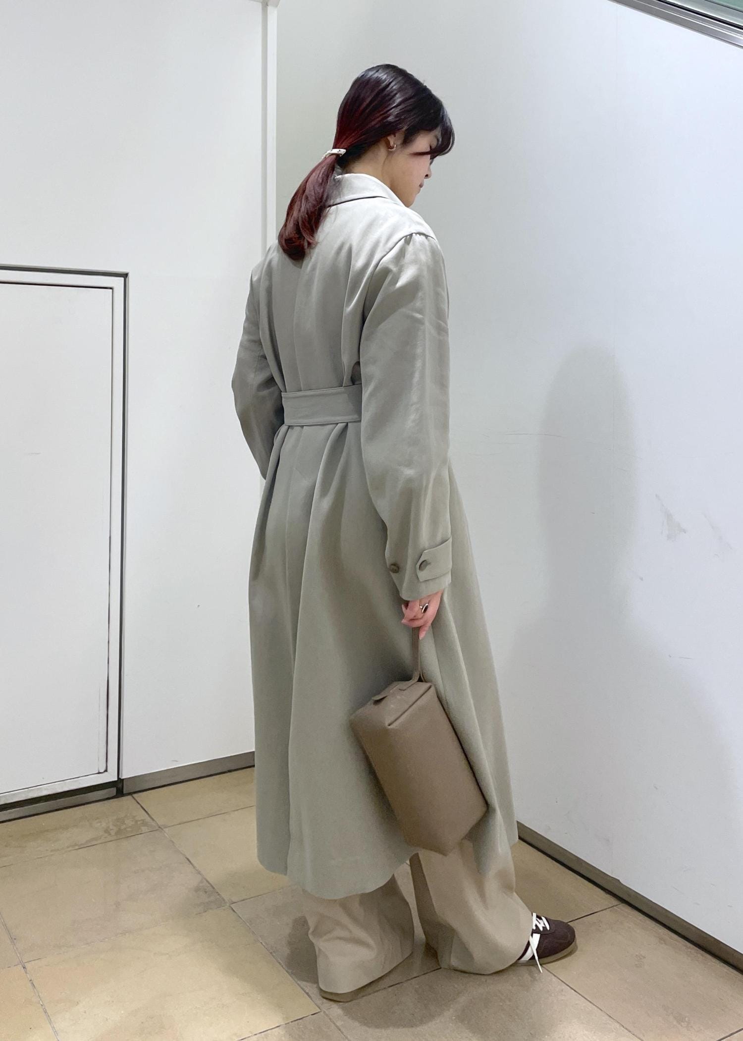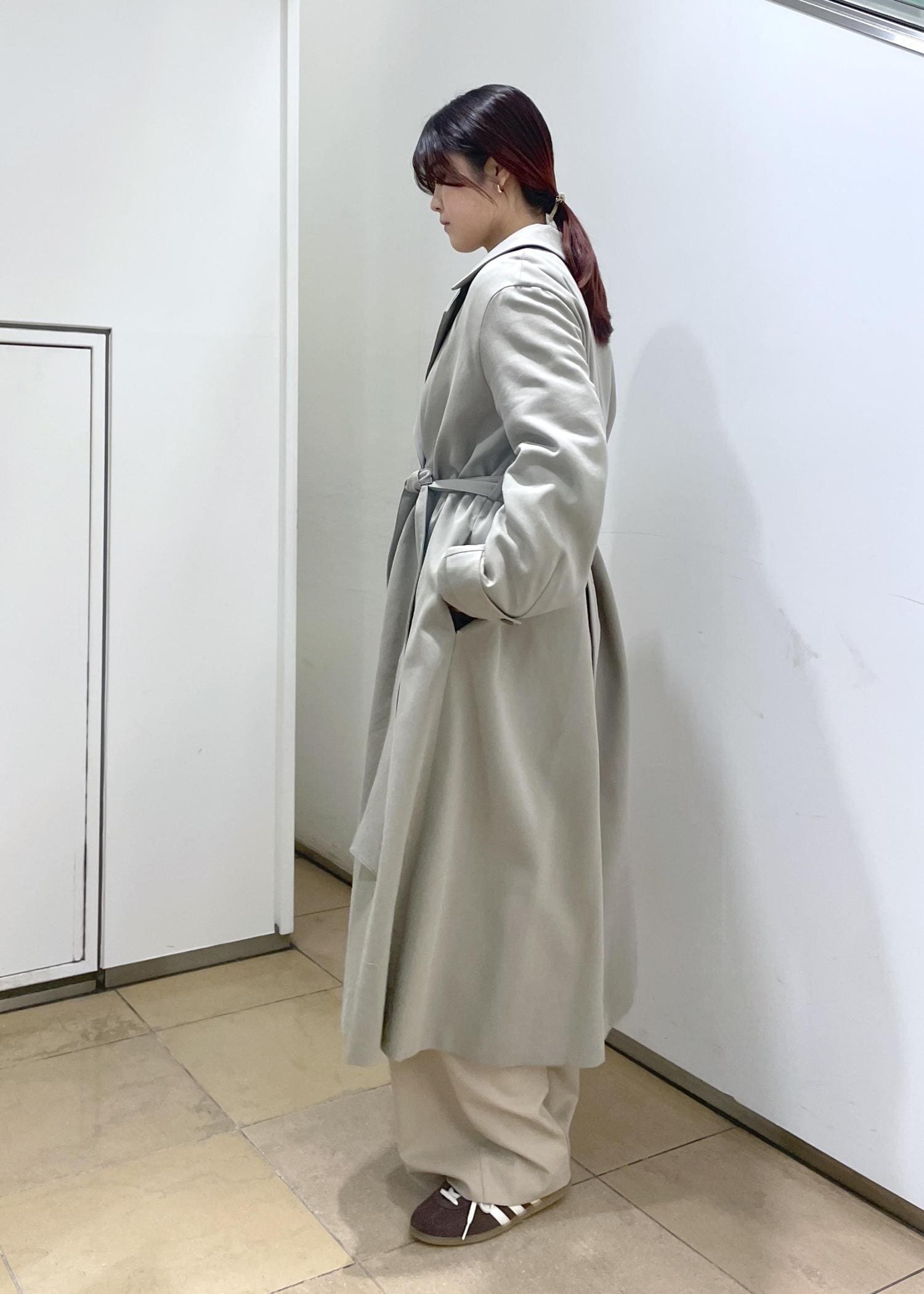 王道のトレンチコートの形に、ヴィンテージライクな素材が目を引く一着です。