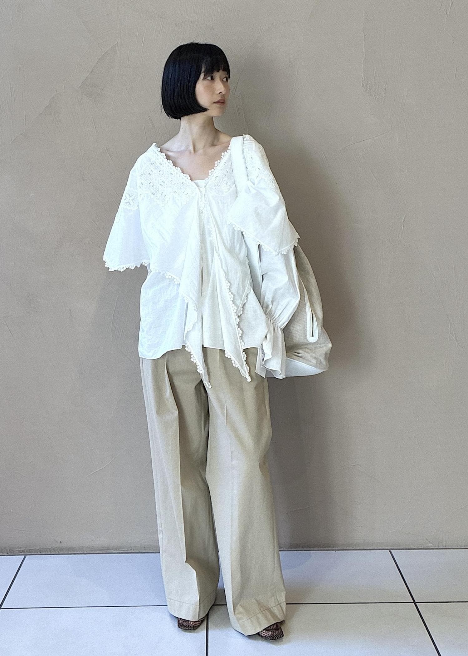ボリューミーなレースブラウスにタックパンツ、メッシュローファーを合わせて春らしいスタイリングです。