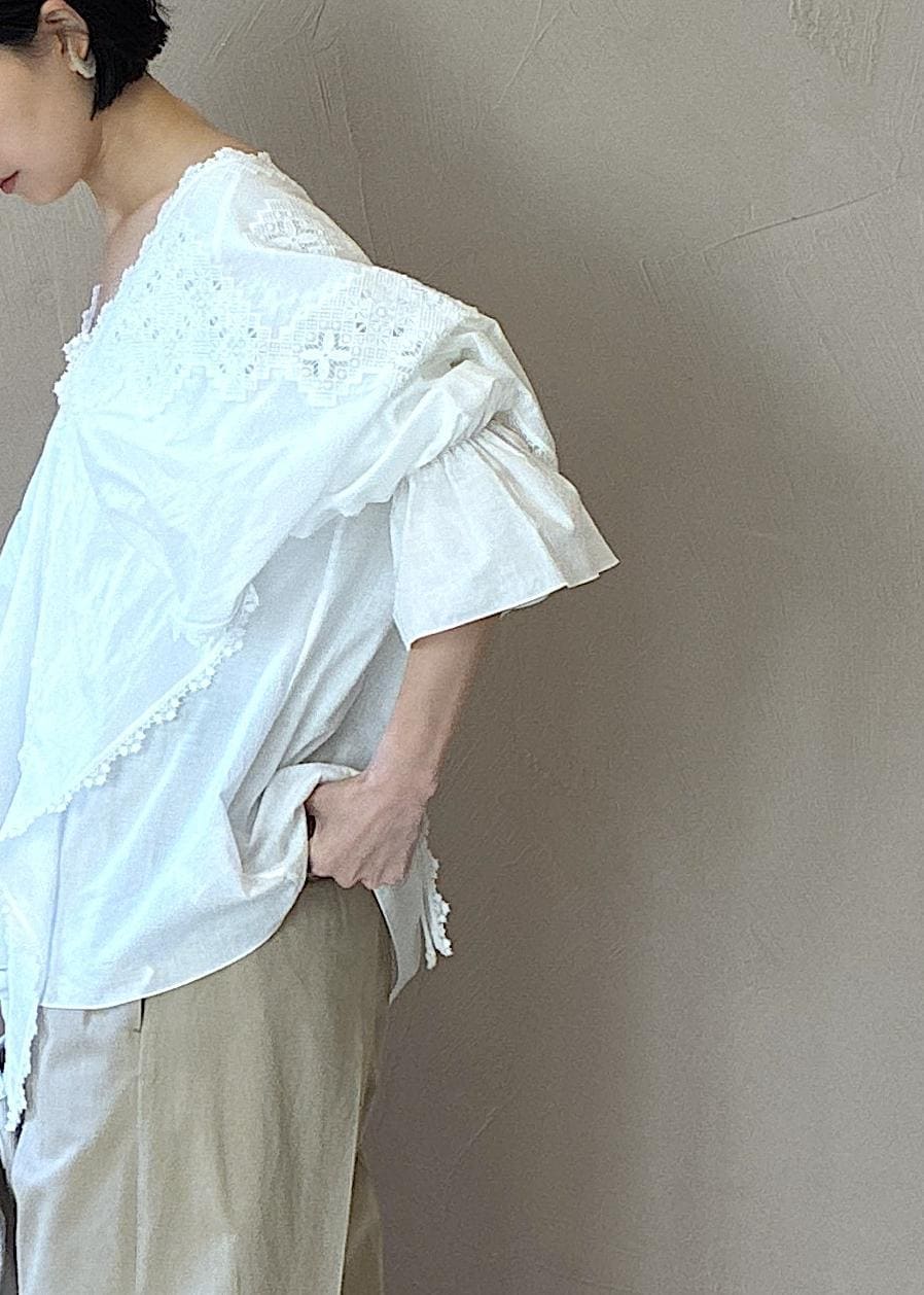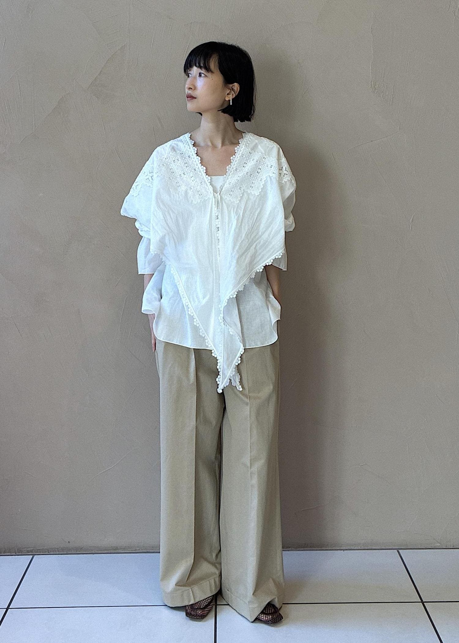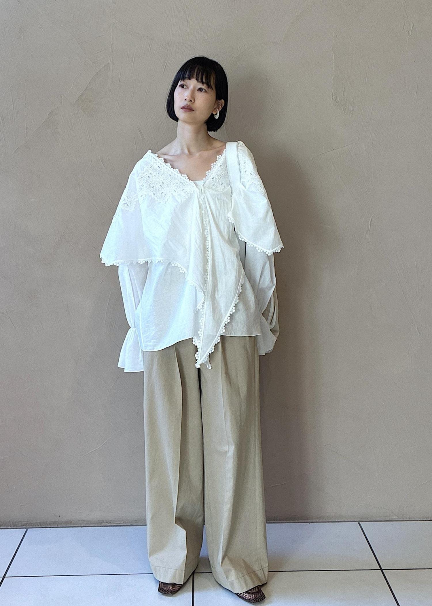 SALON adam et ropéクロスレースケープブラウスオフホワイト / F¥39,600レビューレースがストールのように垂れ下がっているデザイン。前で結ぶこともできます。