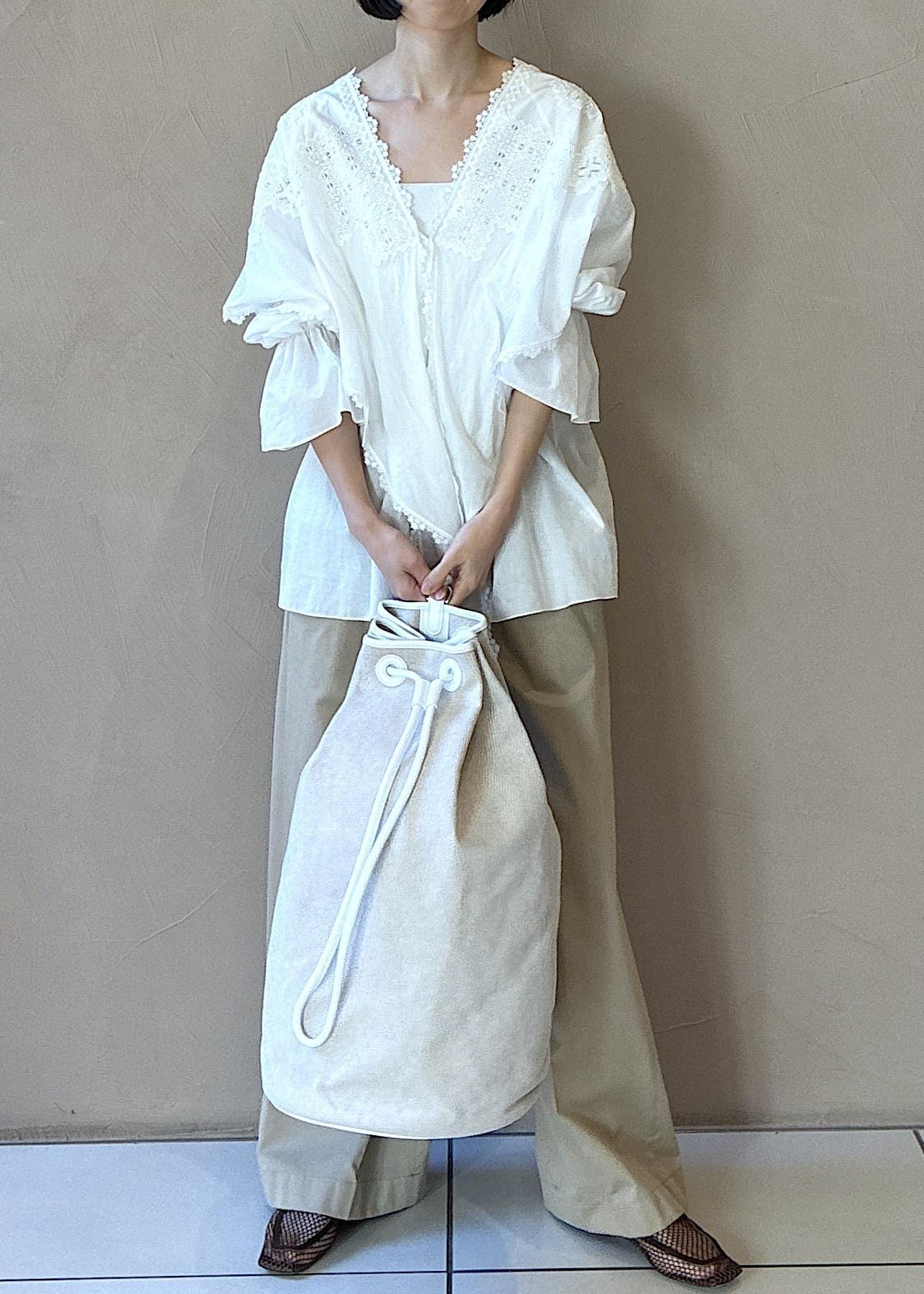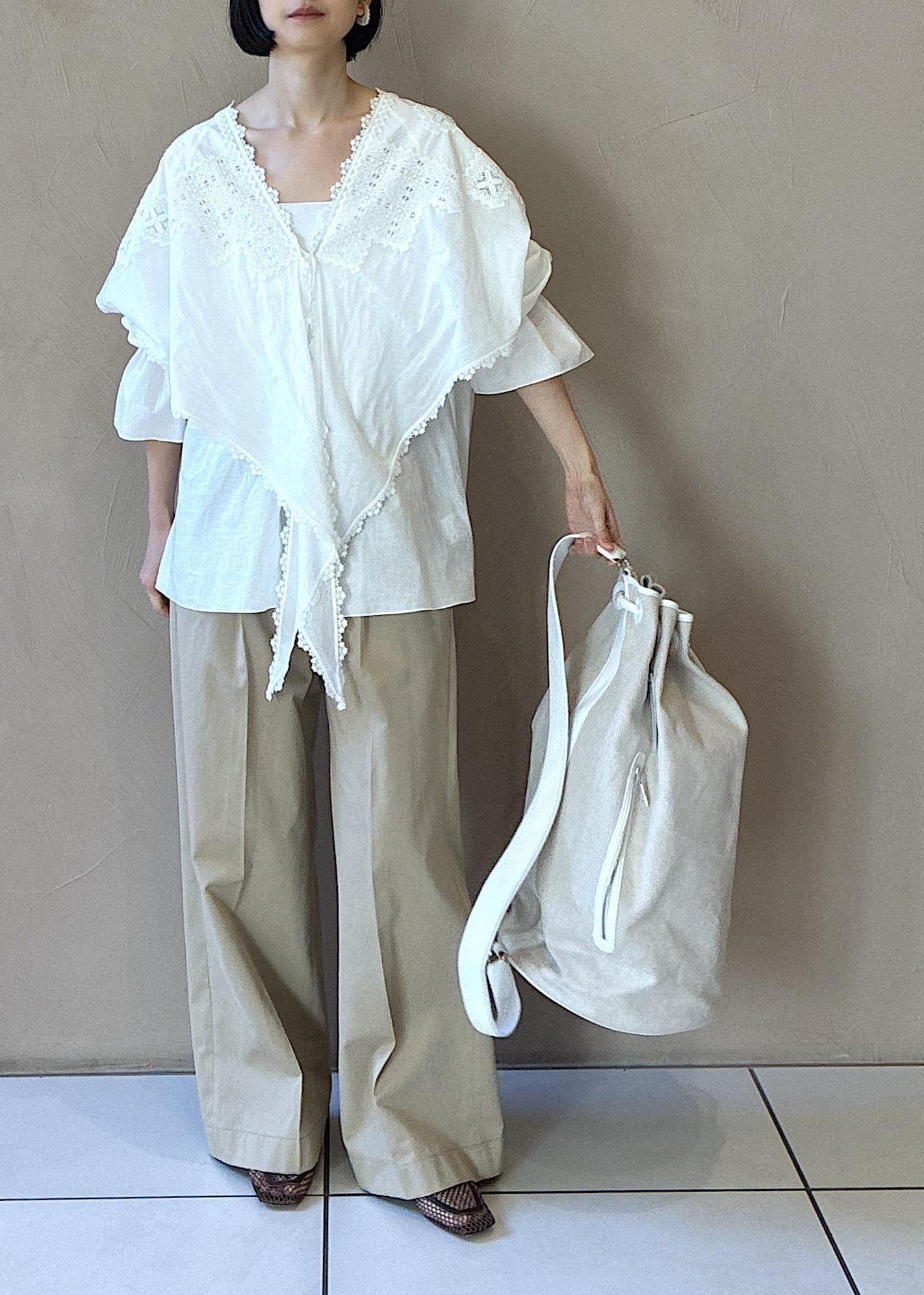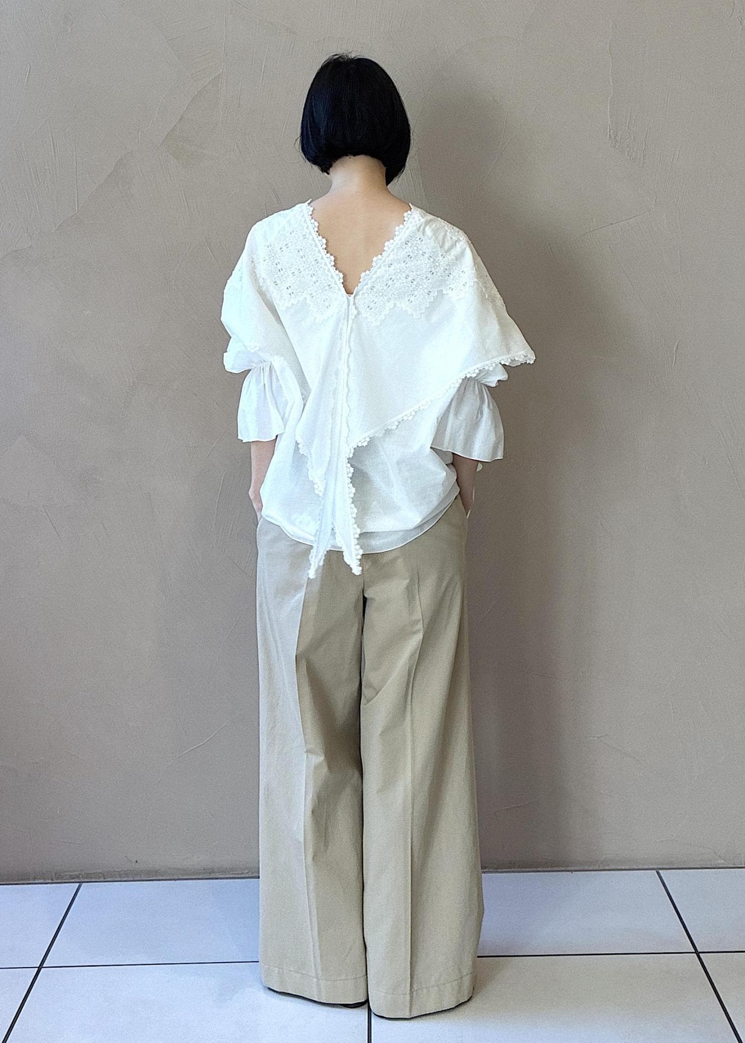 SALON adam et ropéクロスレースケープブラウスオフホワイト / F¥39,600レビューレースがストールのように垂れ下がっているデザイン。前で結ぶこともできます。