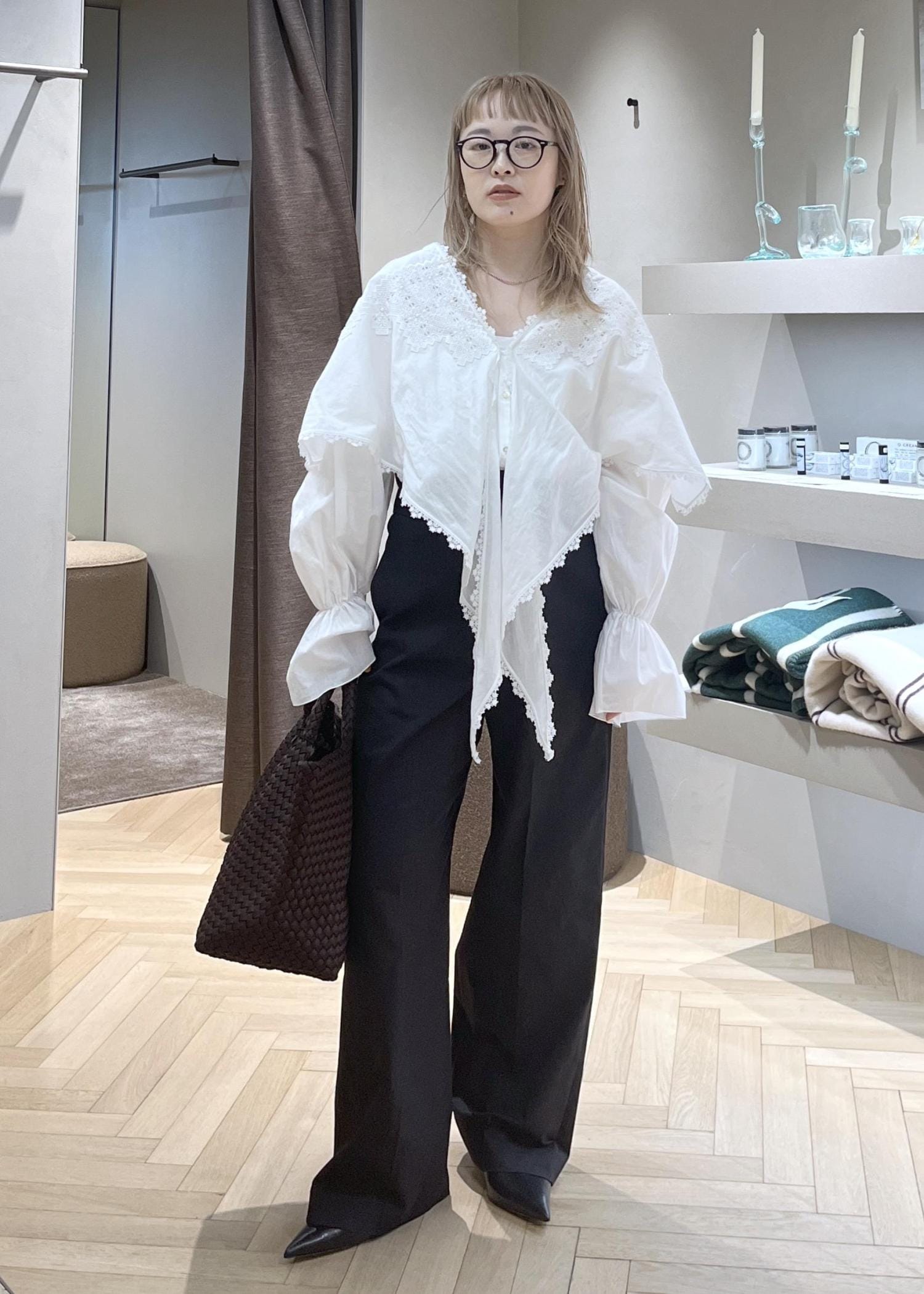 大きなレースが印象的なブラウスを