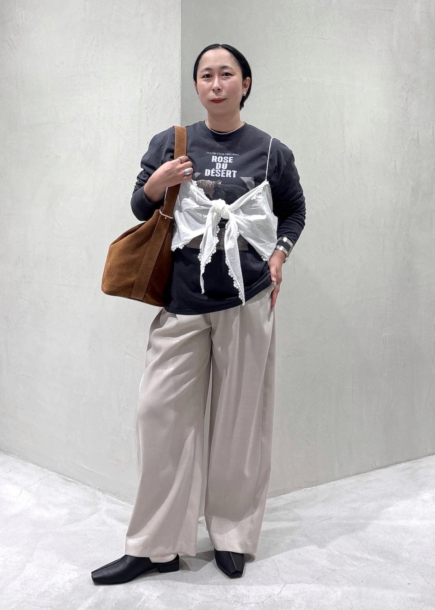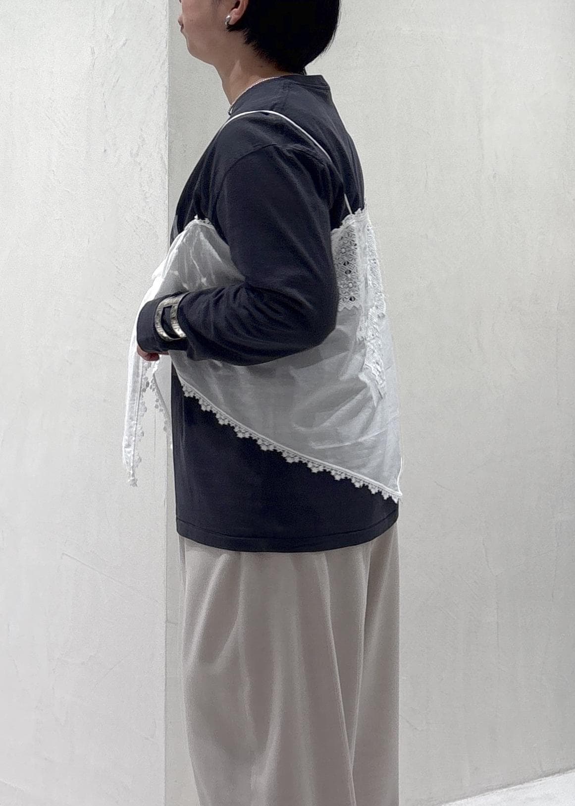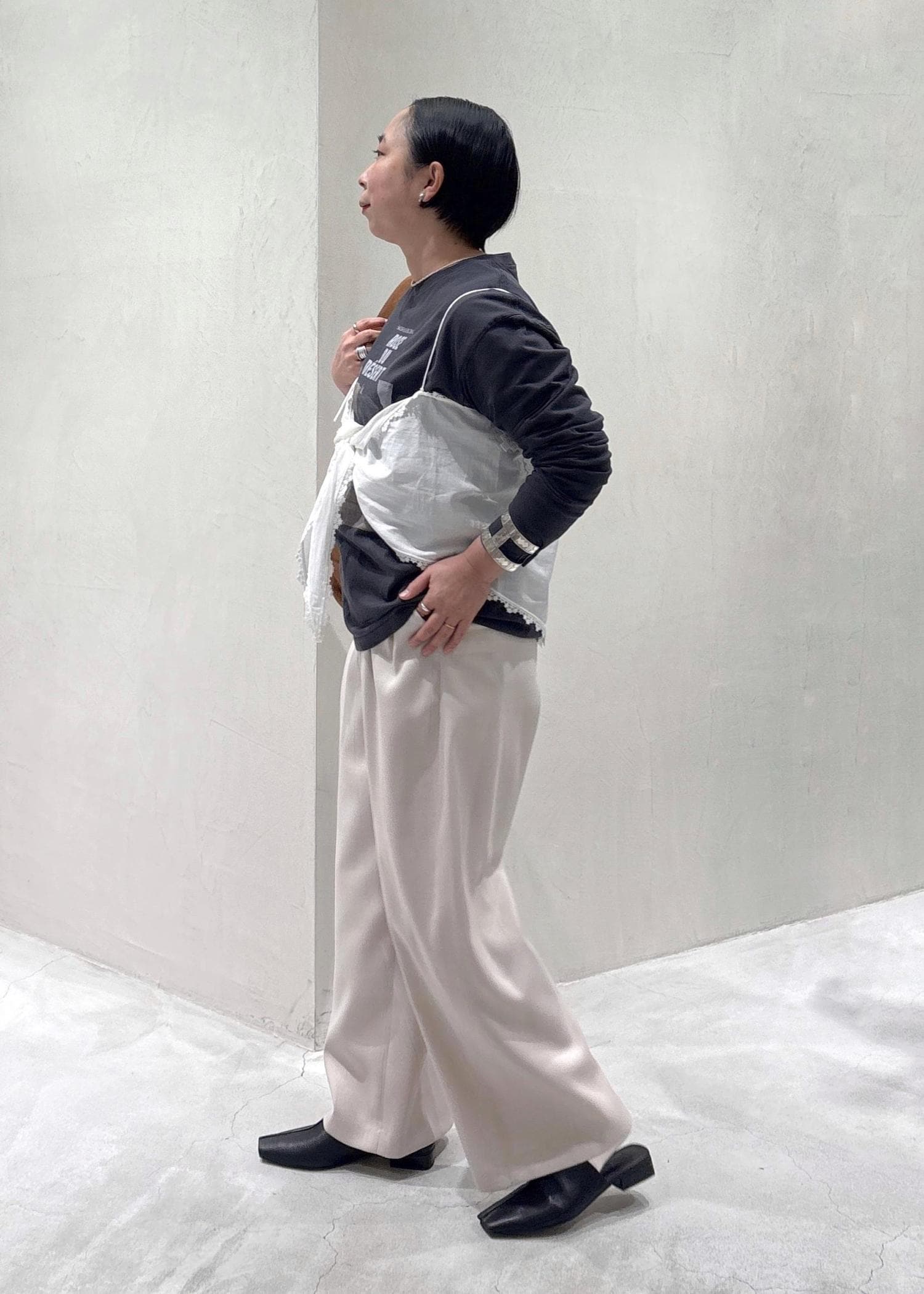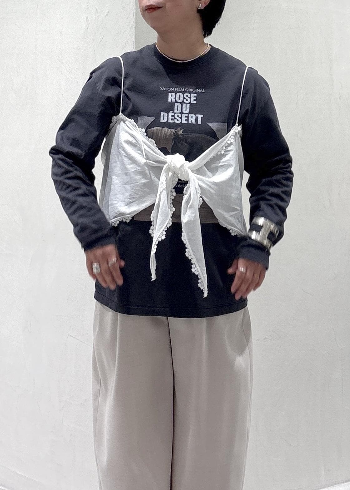 メンズライクなプリントTにレースキャミで今年らしさをプラスしてみました