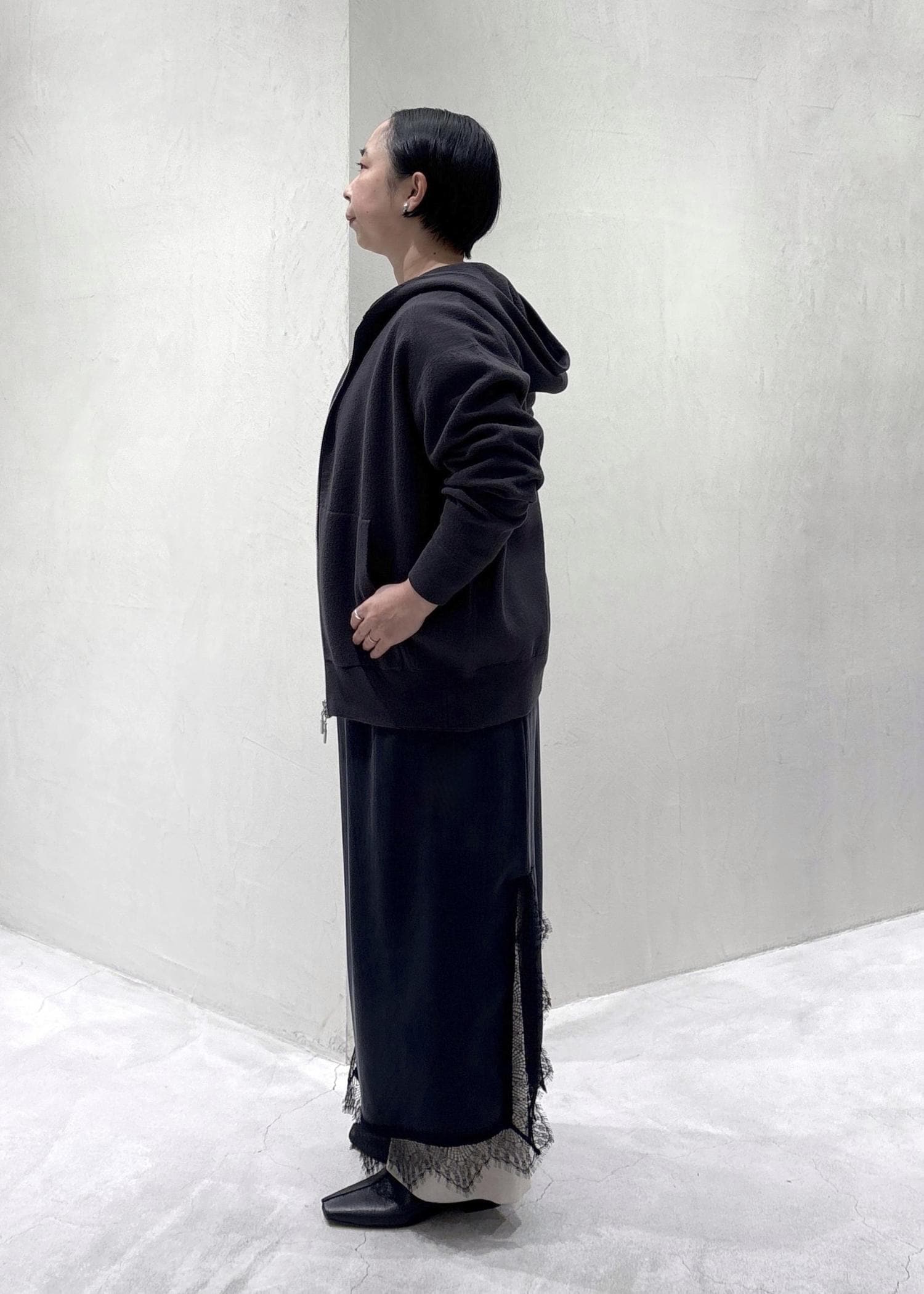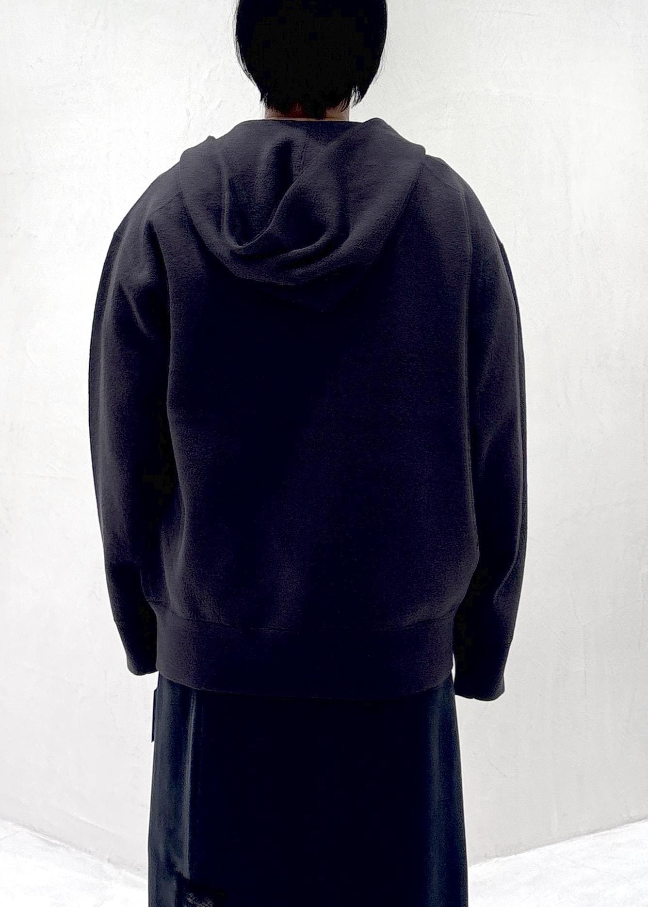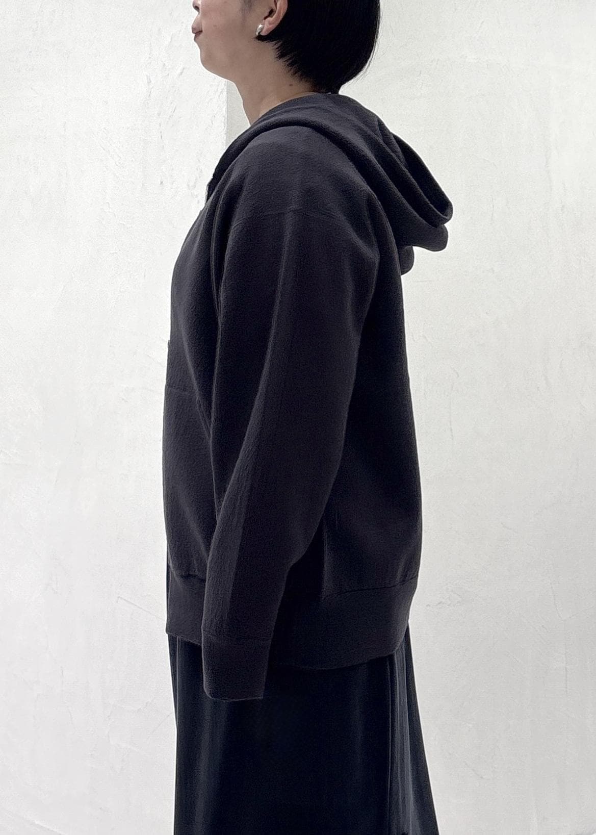 SALON adam et ropéクレープスウェットライクジップパーカーチャコール / F¥25,300レビュー身頃、アーム共にゆったりめのサイズ感。