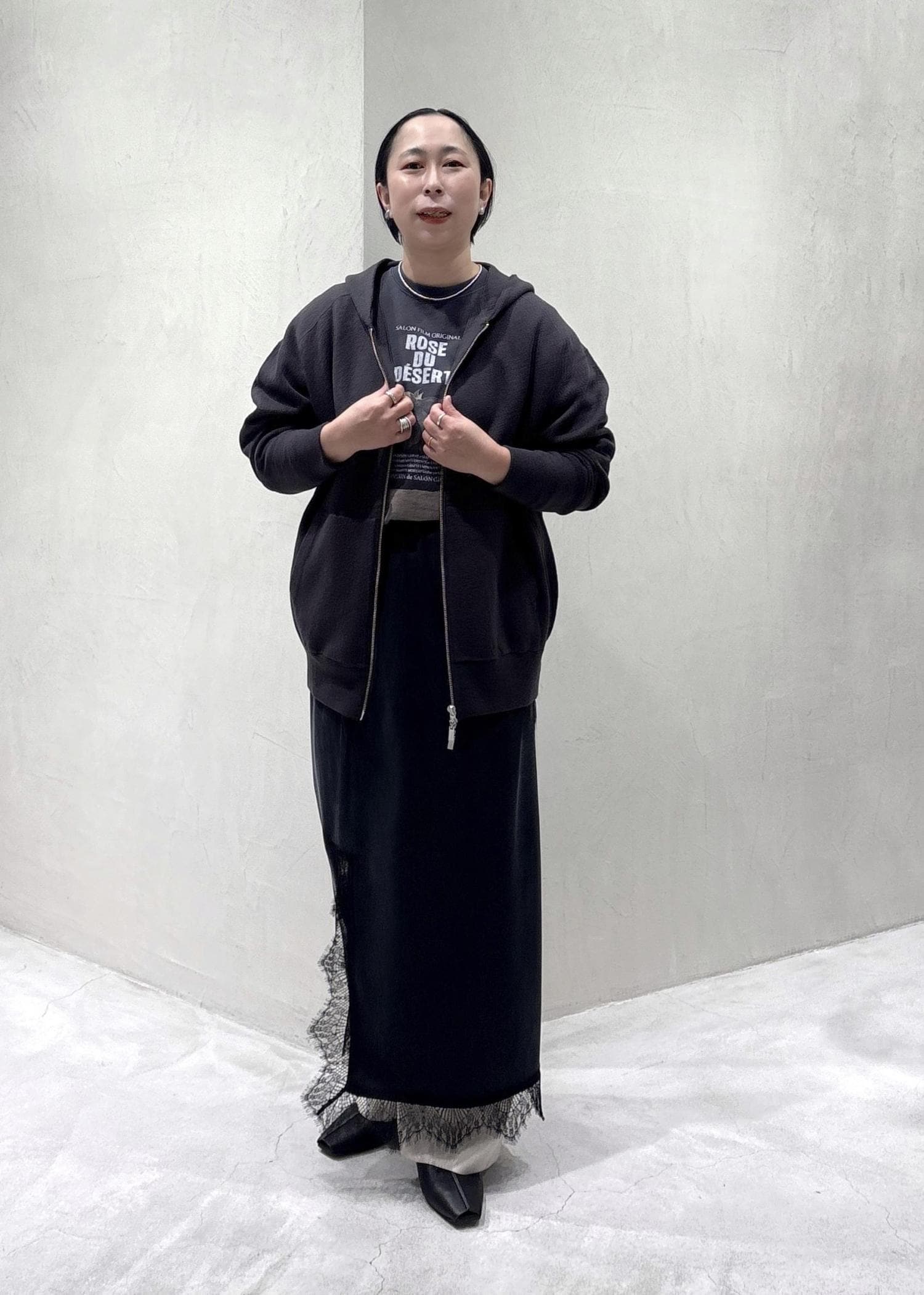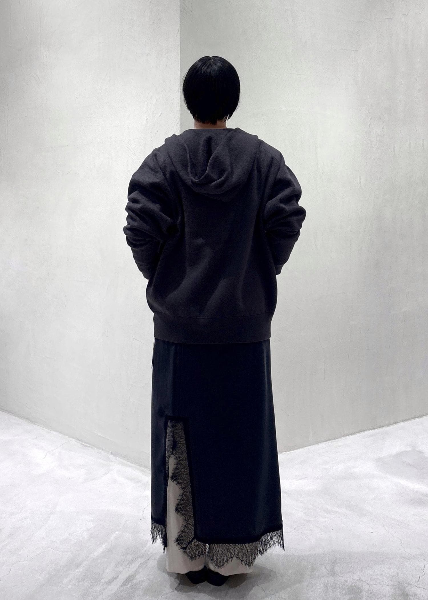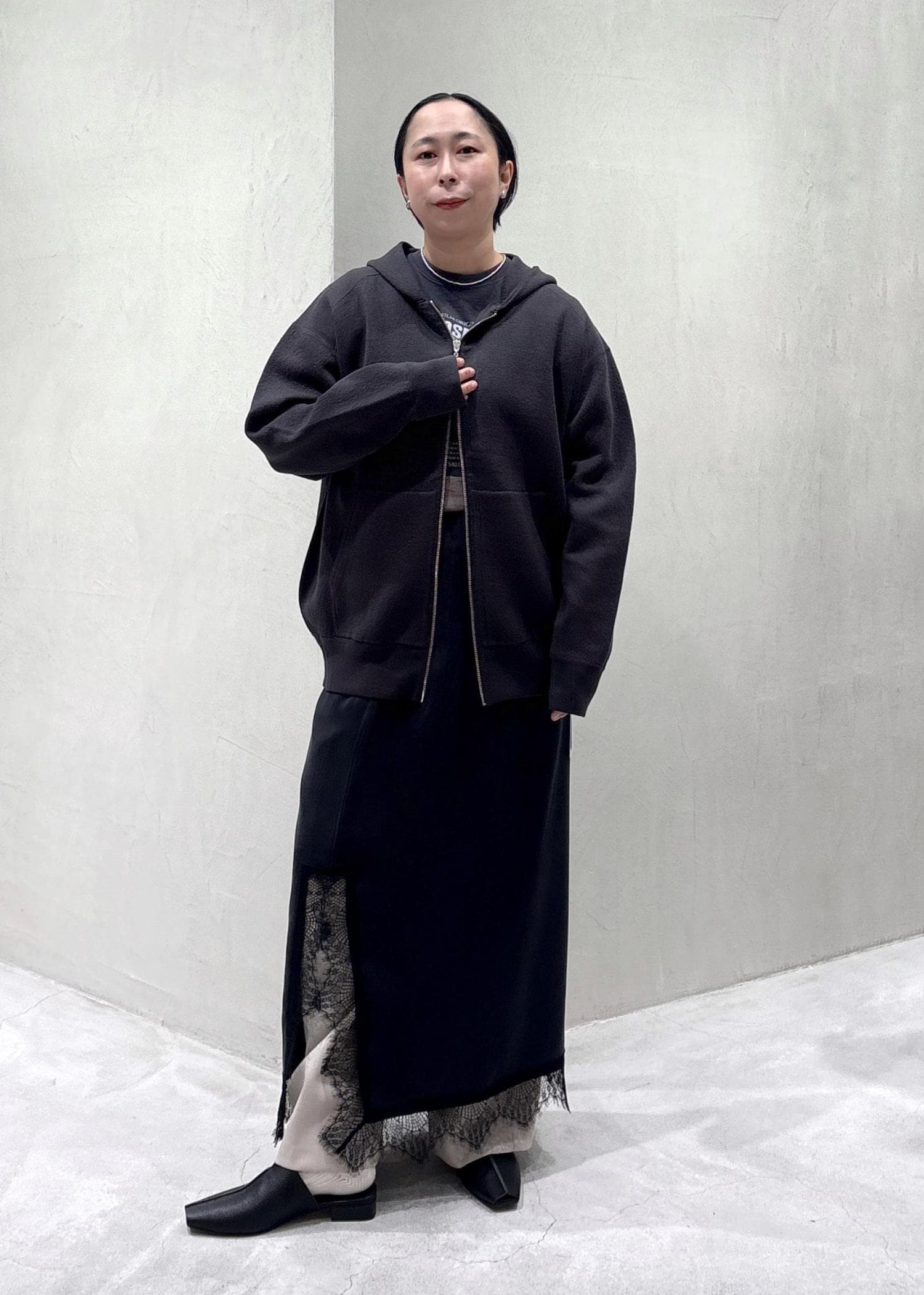 SALON adam et ropéクレープスウェットライクジップパーカーチャコール / F¥25,300レビュー身頃、アーム共にゆったりめのサイズ感。