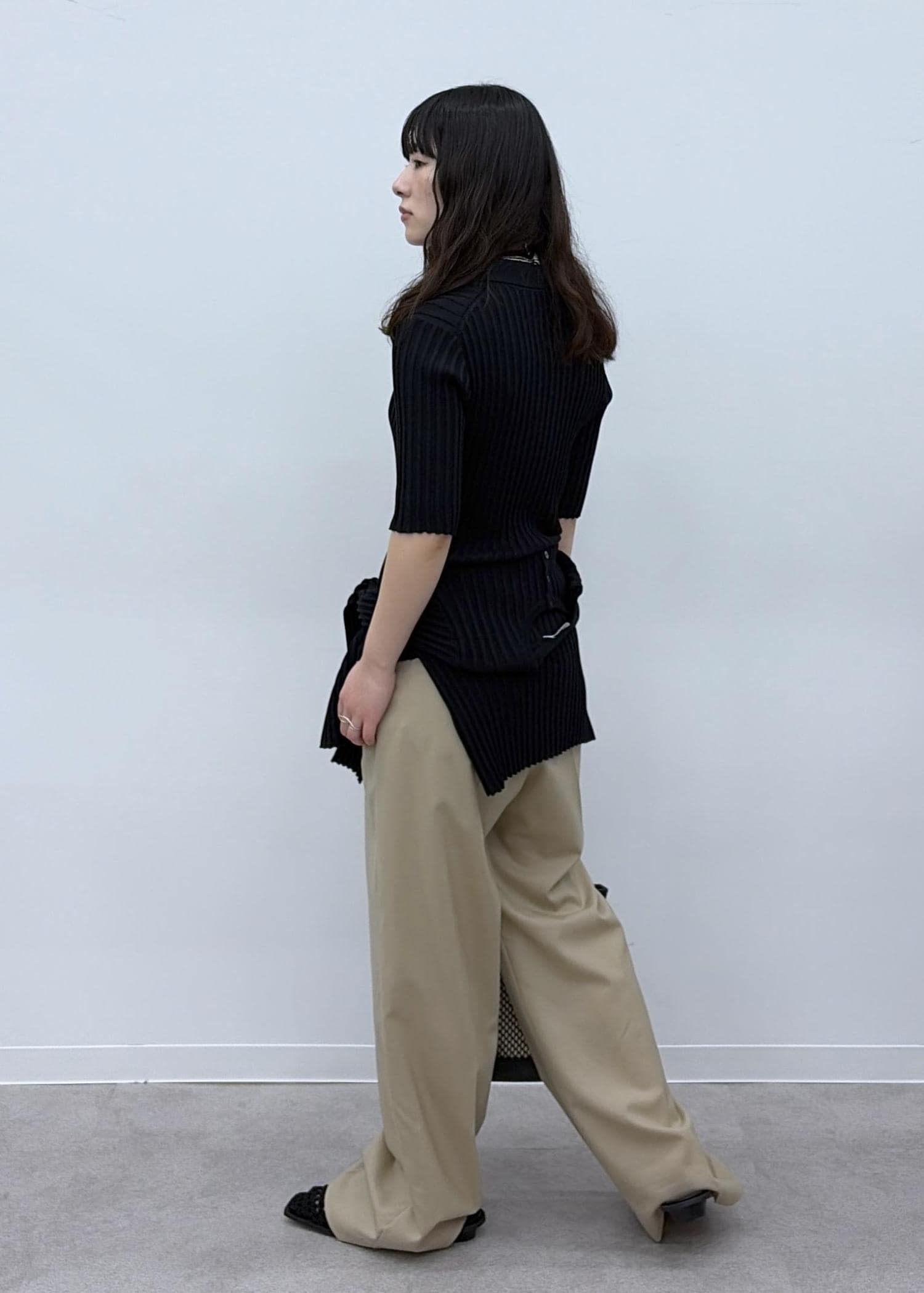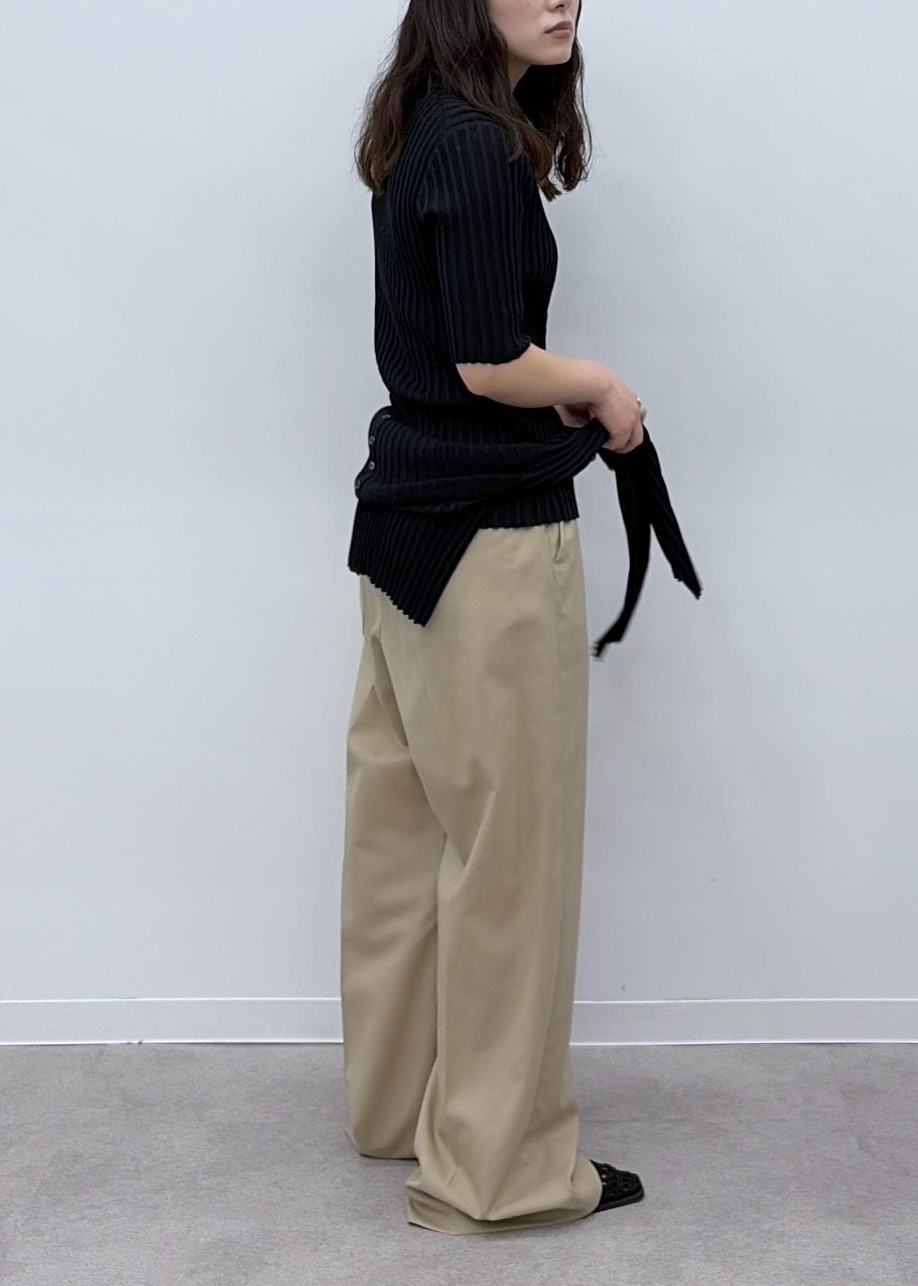 薄手のウール素材。チクチク感なく軽やかに着こなせます。センタープレスで美脚効果も◎オンオフどちらも使いやすいです。 -