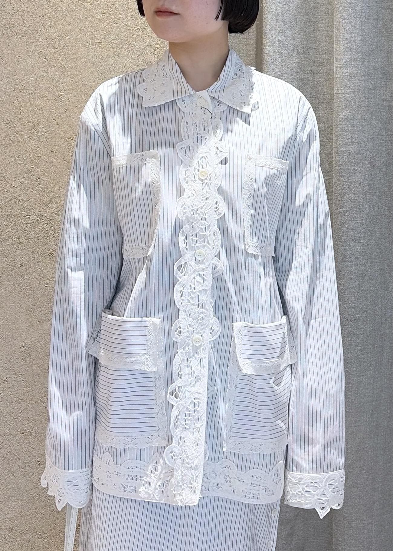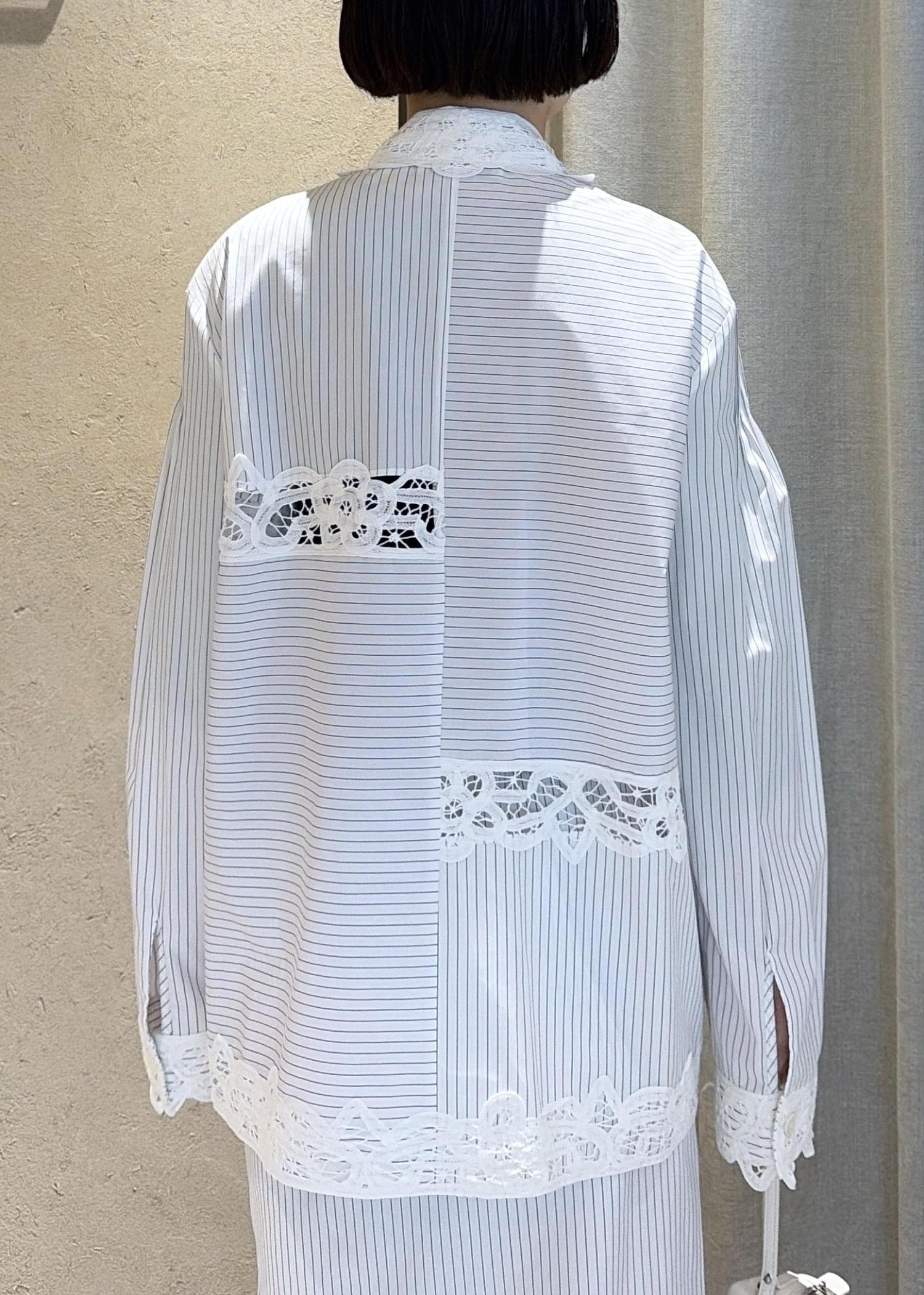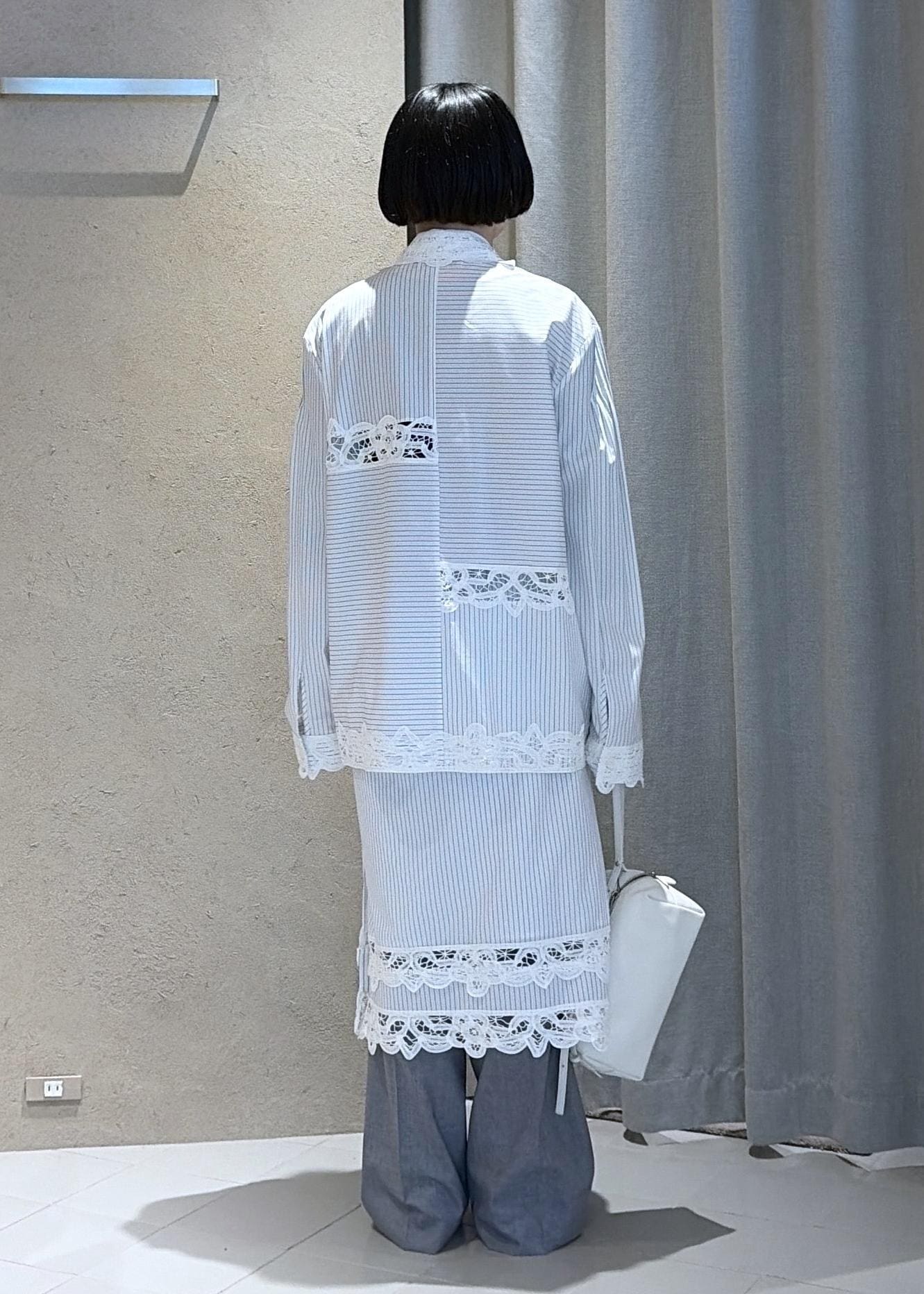 春夏にぜひ着ていただきたいレースのシャツのスカートのセットアップは単体でも目を引くイチオシアイテムです。大きめシルエットのシャツですがEENKらしい肩周りの綺麗なシルエットで大人っぽく合わせていただけます。