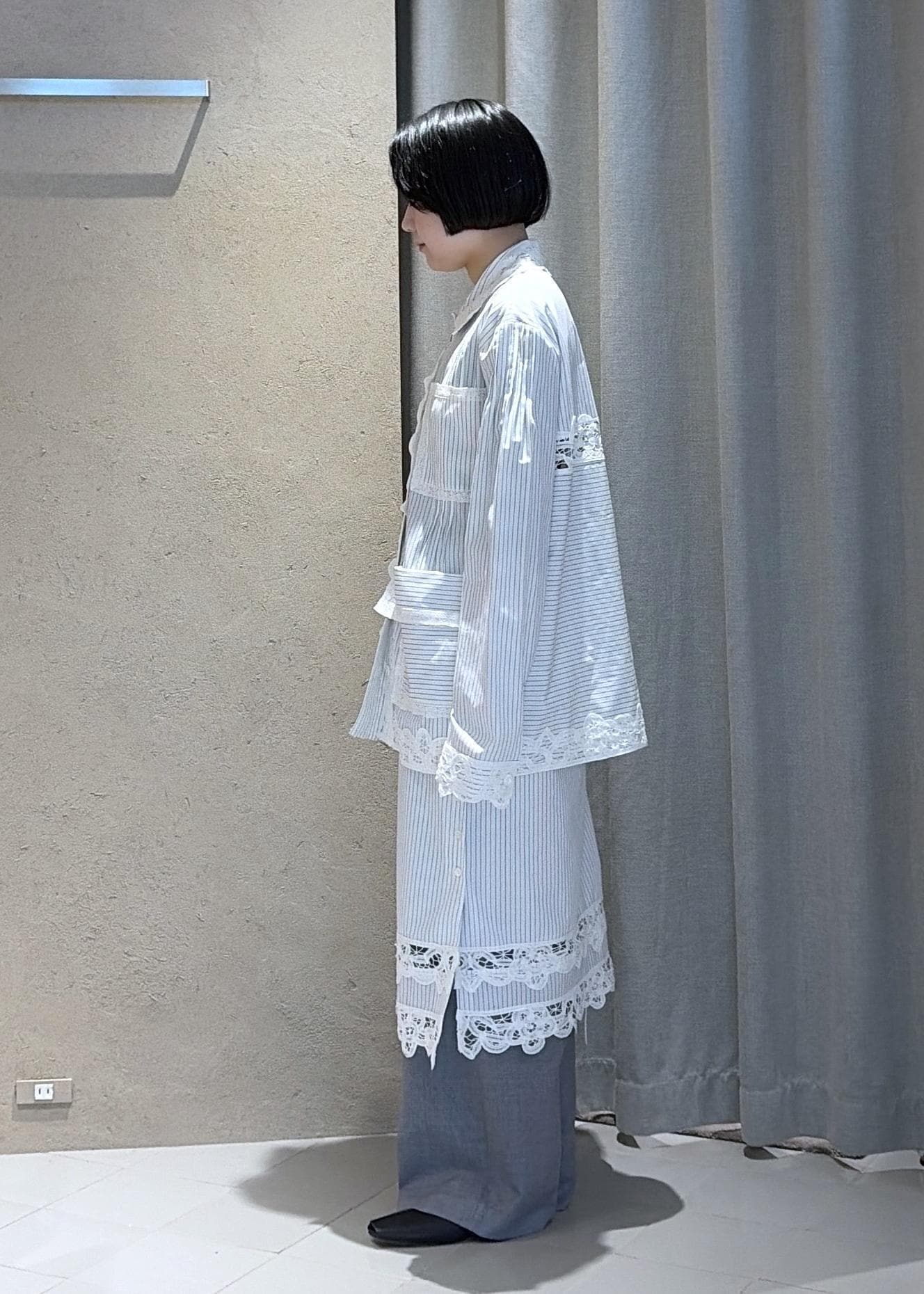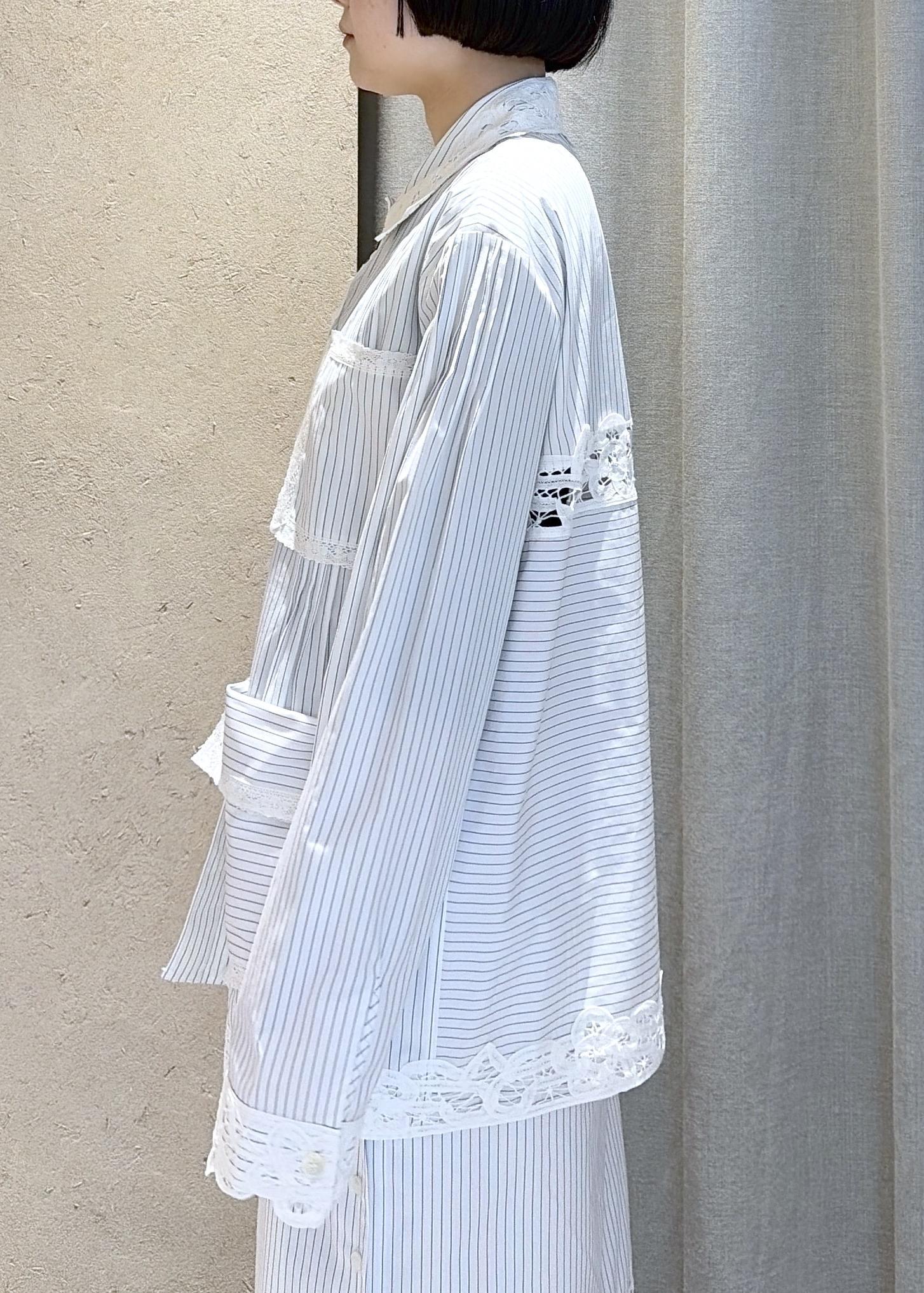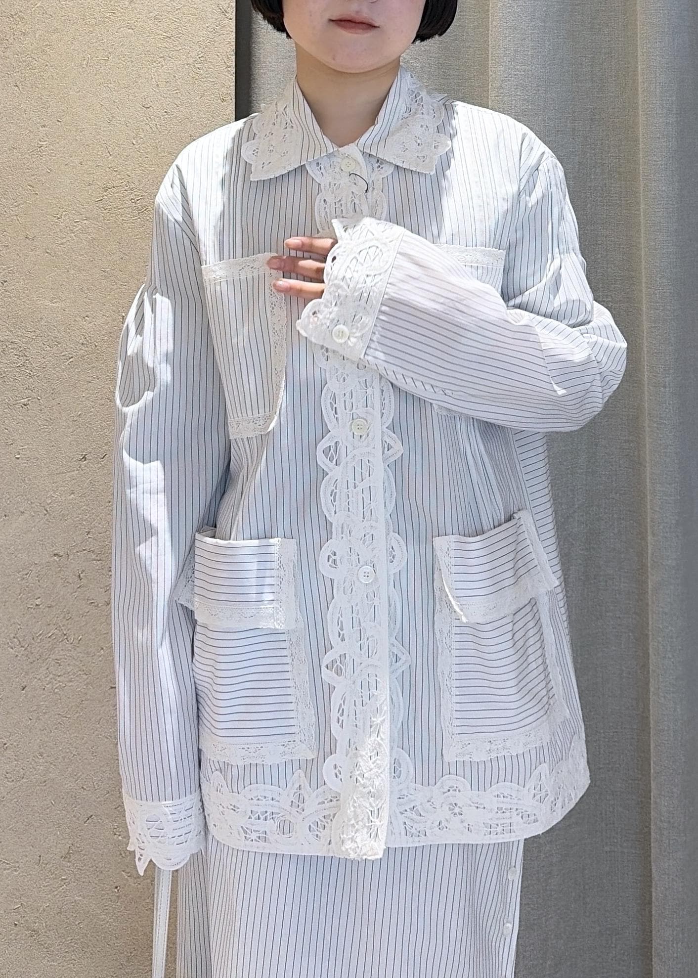 春夏にぜひ着ていただきたいレースのシャツのスカートのセットアップは単体でも目を引くイチオシアイテムです。大きめシルエットのシャツですがEENKらしい肩周りの綺麗なシルエットで大人っぽく合わせていただけます。