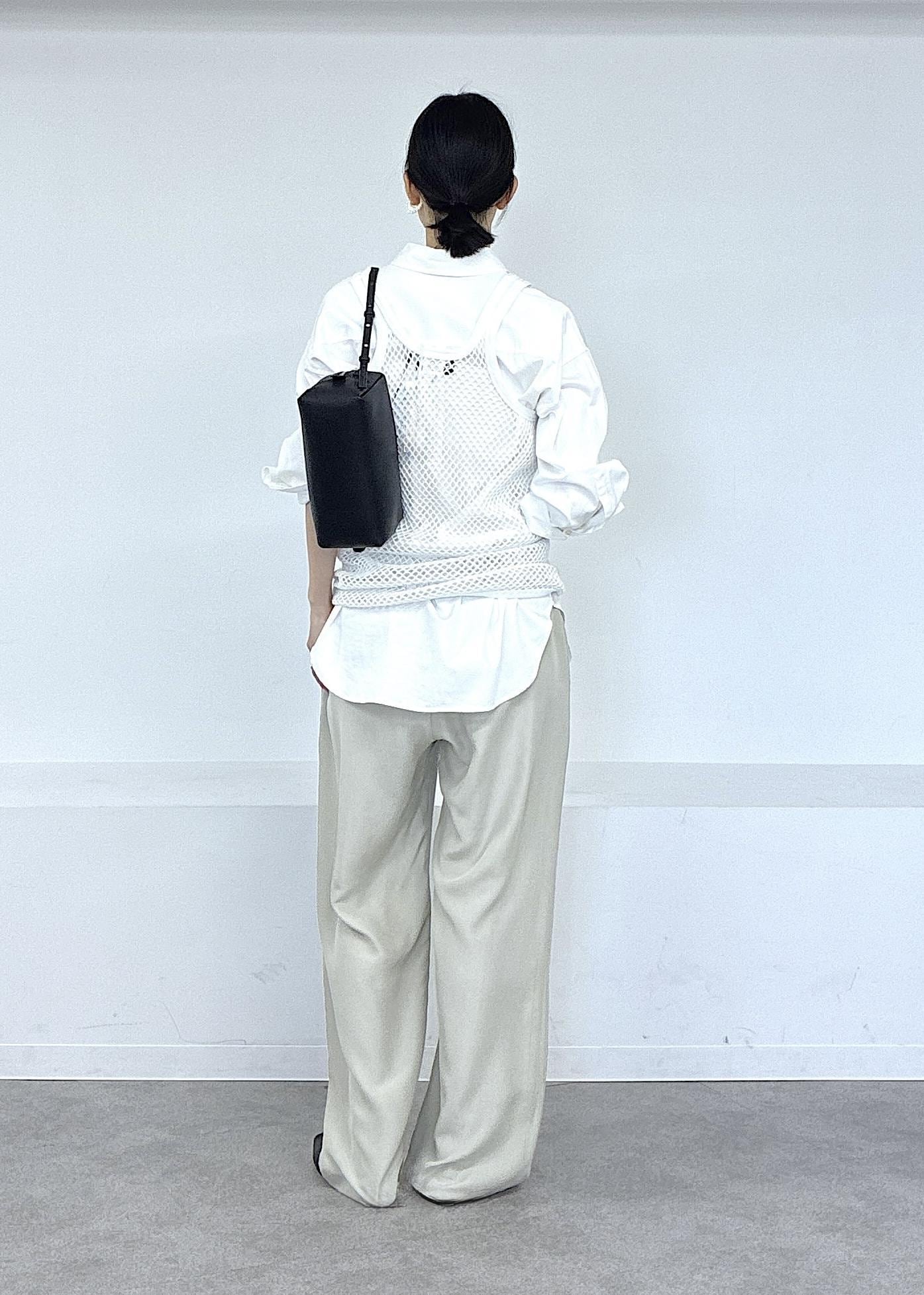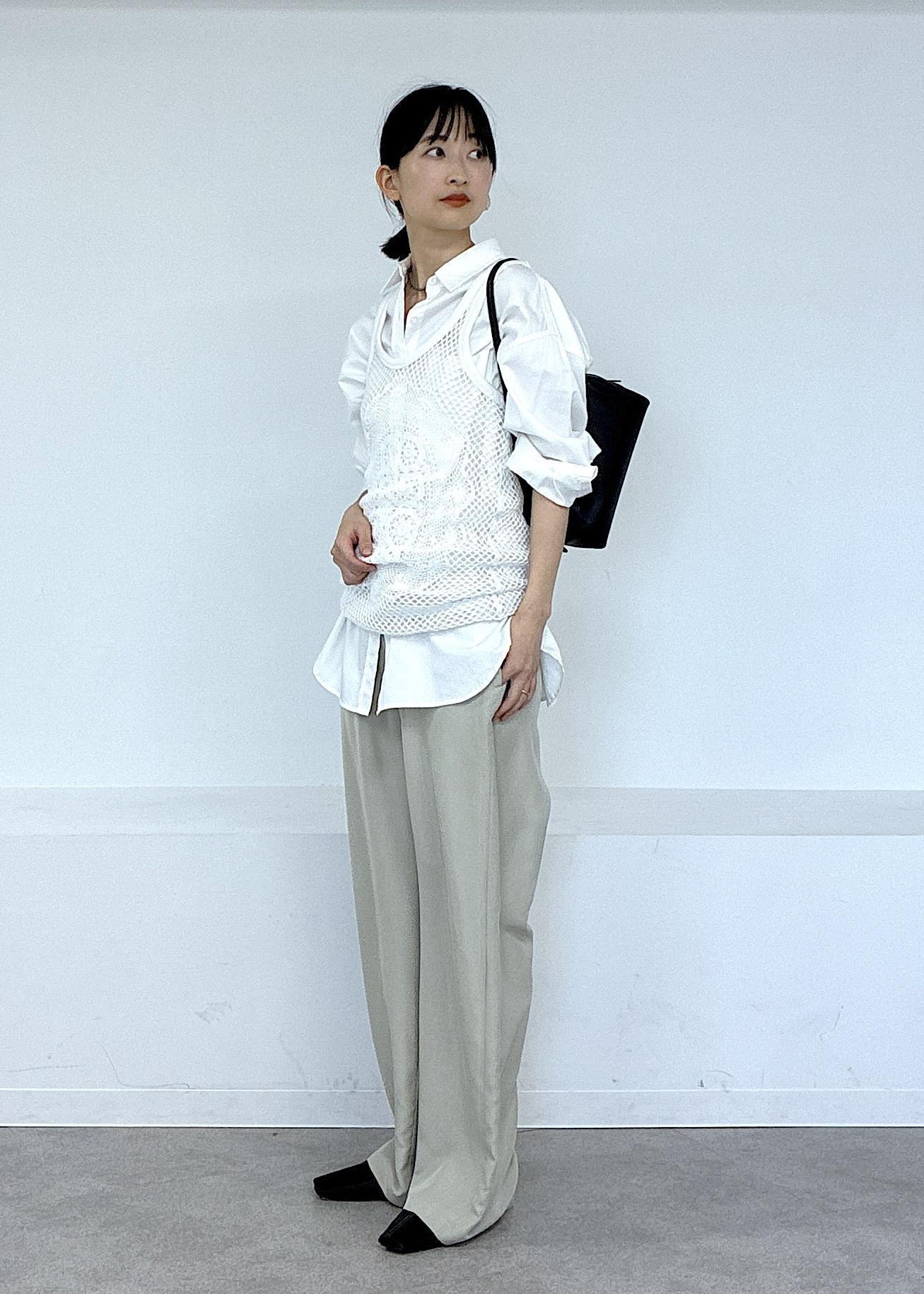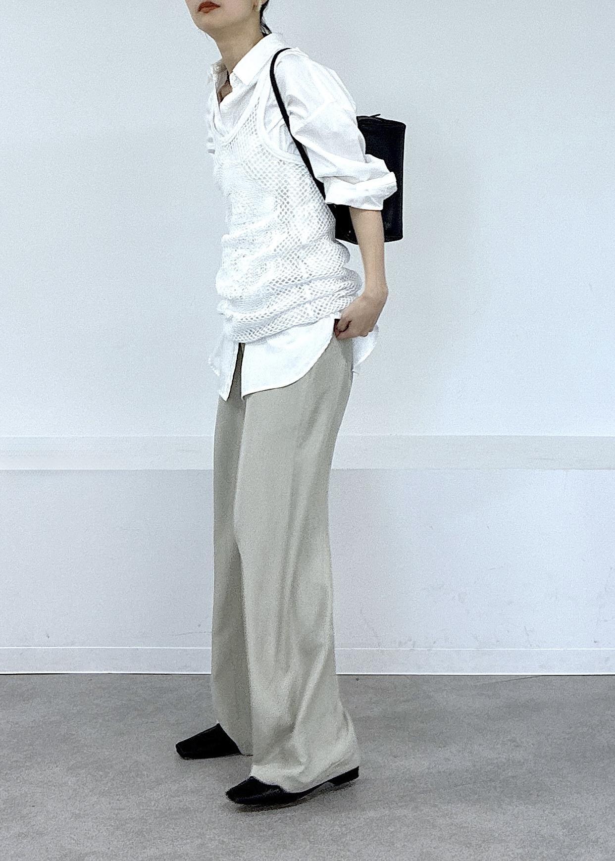 souvenir stand別注アソートタンクトップとシャツをレイヤード。シルクパンツの新色と合わせました。