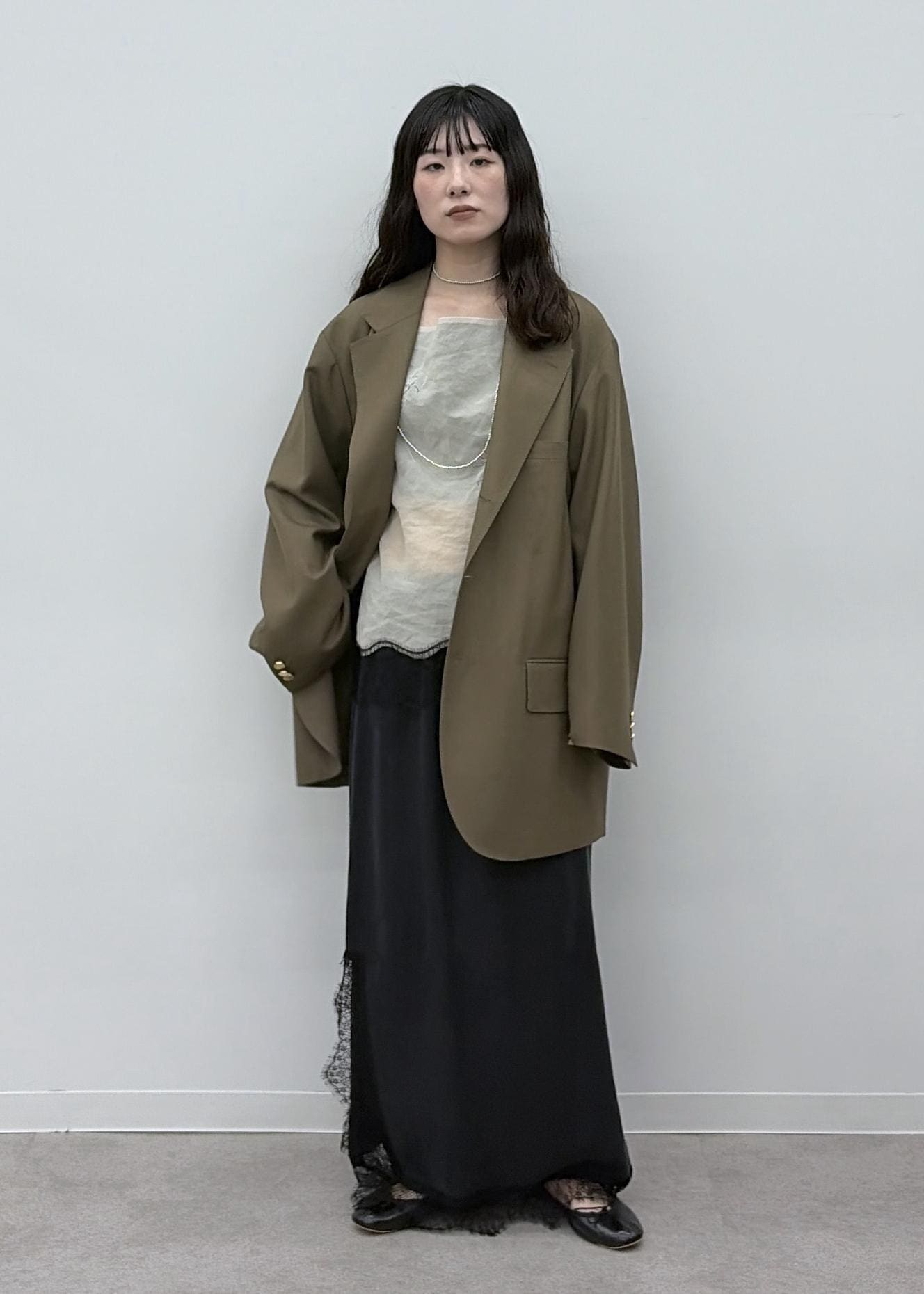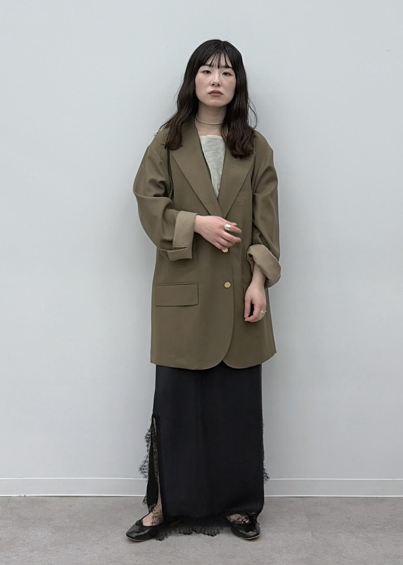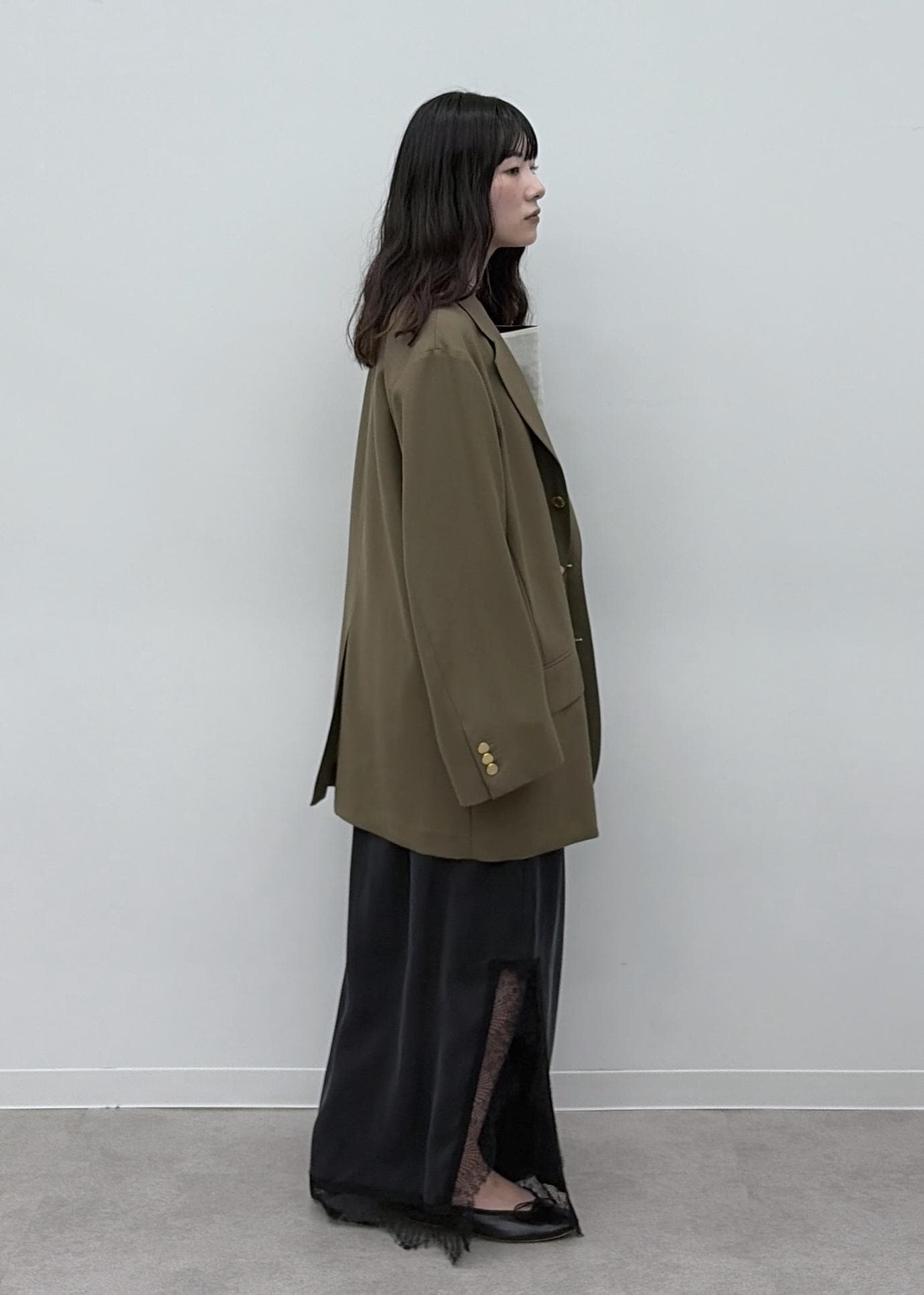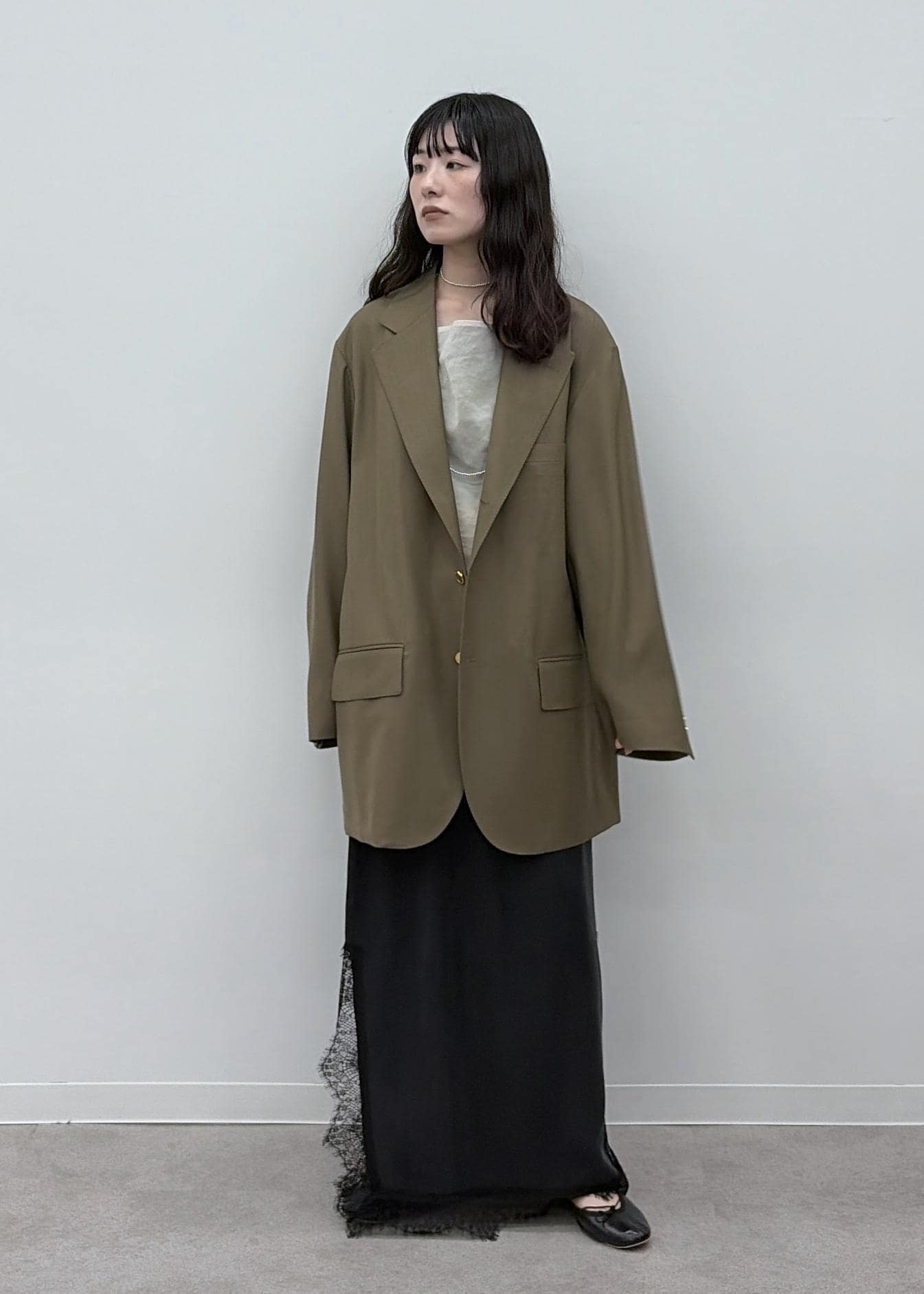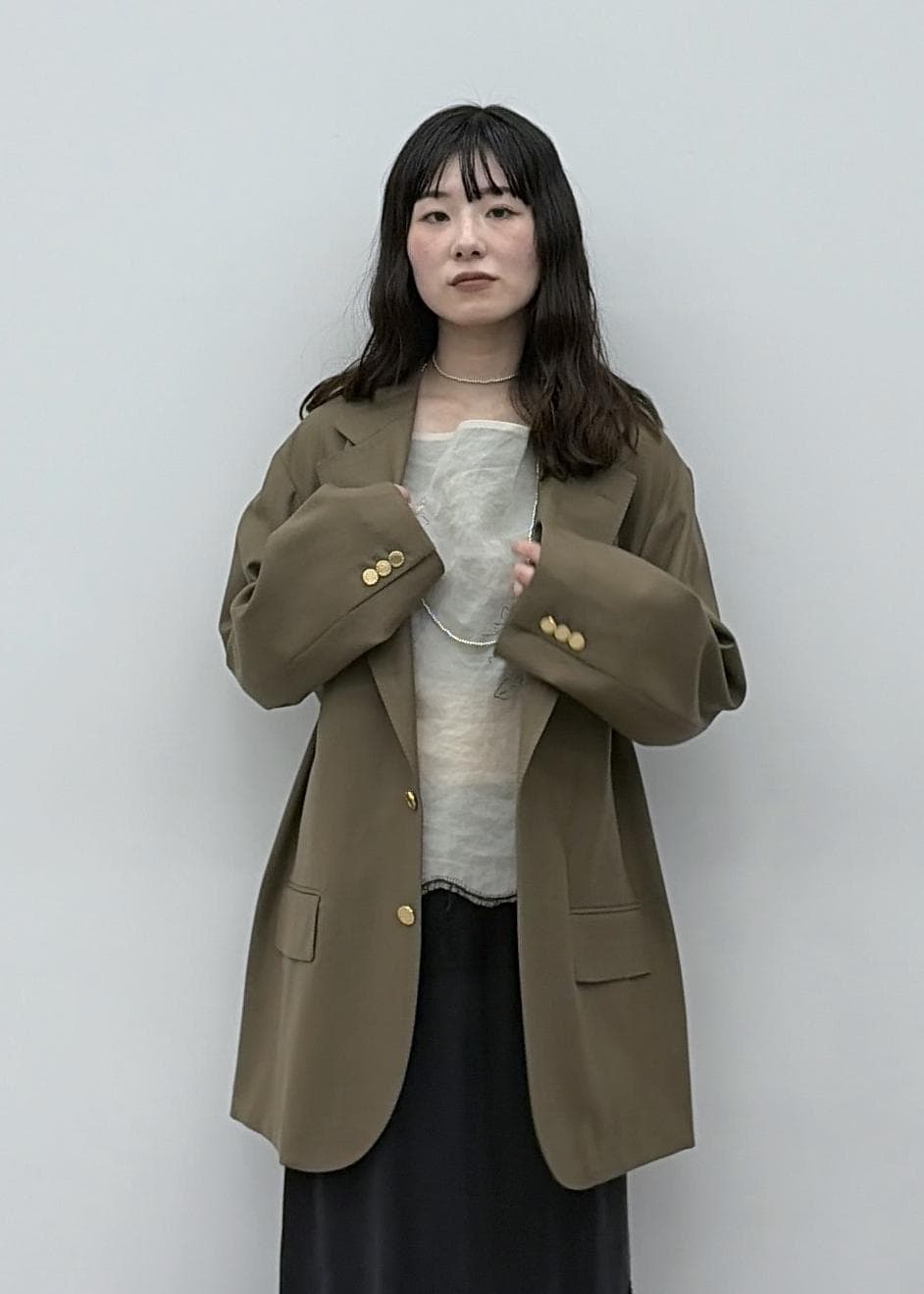 軽く、滑らかなウール素材。オーバーサイズですが、すとんと落ちるのでダボダボ感はありません。金ボタンもアクセントになります。 -